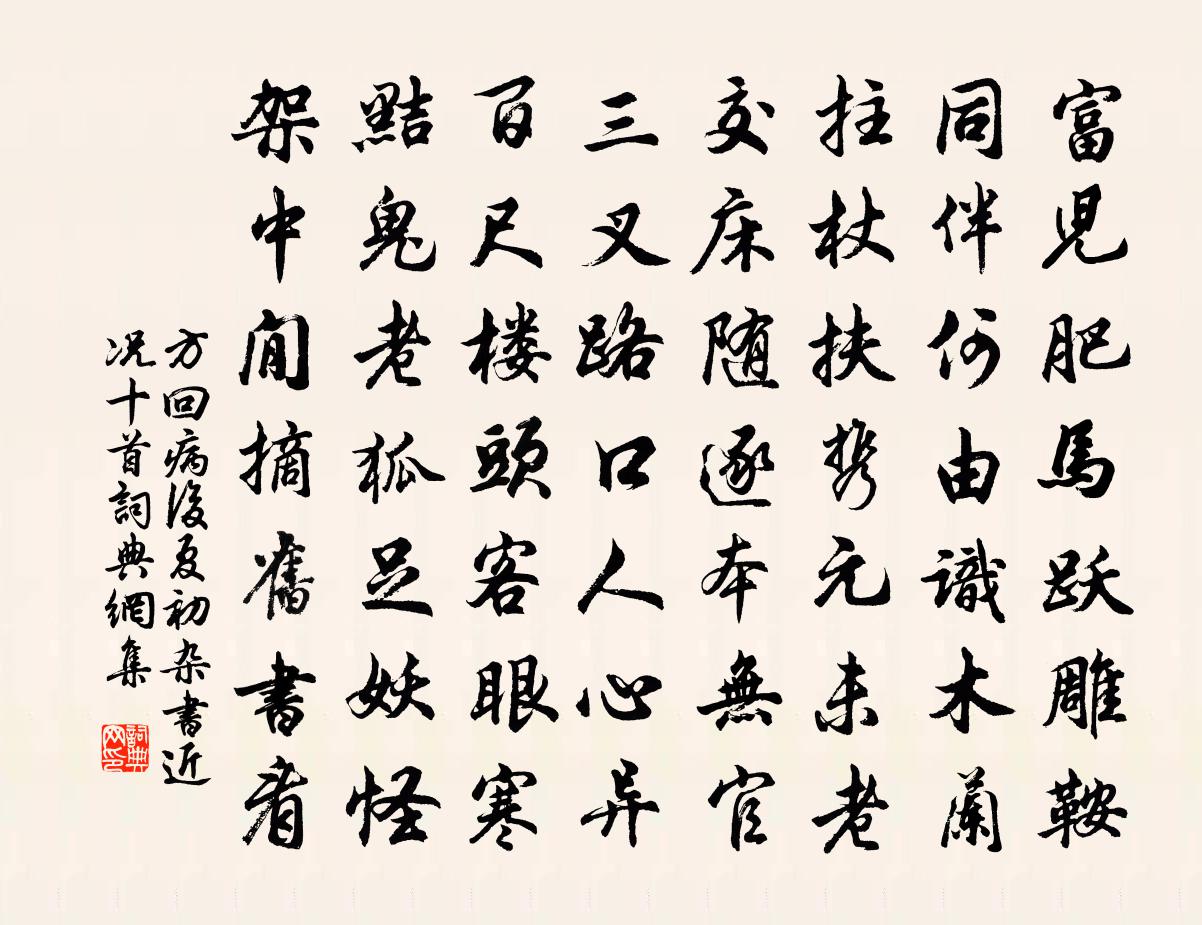 詩詞名句歷史字典書法欣賞書法字典國語詞典說文解字康熙字典古漢語字典標 題 作 者 詩 句 病後夏初雜書近況十首作者:方回 朝代:宋代病後夏初雜書近況十首原文富兒肥馬躍雕鞍,同伴何由識木蘭。拄杖扶攜元未老,交床隨逐本無官。三叉路口人心異,百尺樓頭客眼寒。黠鬼老狐足妖怪,架中閒摘舊書看。詩詞問答問:病後夏初雜書近況十首的作者是誰?答:方回問:病後夏初雜書近況十首寫於哪個朝代?答:宋代方回病後夏初雜書近況十首書法欣賞病後夏初雜書近況十首書法作品詩詞推薦汪運乾餉酒方岳〔宋代〕長須手拿一壺酒,問識浣花工部無。蓑笠荷鋤煙雨外,再三不信是耕夫。寄題商華叔心遠堂,用卷中韻范成大〔宋代〕示我新詩卷,知君遯俗情。安流視巫峽,灰劫笑昆明。徽外窗弦語,瓮頭春蟻生。藍橋即仙窟,何況有雲英。赴南巴留別蘇台知己賈島〔唐代〕人過梅嶺上,歲歲北風寒。落日孤舟去,青山萬里看。猿聲湘水靜,草色洞庭寬。已料生涯事,只應持釣竿。太師中書令魏國公冊贈尚書令追封真定王趙挽王禹偁〔宋代〕元老令終歸葬日,有司重奏輟朝時。駢羅鹵簿三公禮,告赴同盟五月期。何處更求廊廟器,是誰重作帝王師。商山越中席上看弄老人顧況〔唐代〕不到山陰十二春,鏡中相見白頭新。此生不復為年少,今日從他弄老人。泊貴池驛董嗣杲〔宋代〕琴書湓浦擔,風雪貴池船。問酒臨津醉,添衣入驛眠。漁翁寒補網,鄰女夜調弦。何日齊山去,尋僧學說禪。偈六十三首釋道寧〔宋代〕等閒垂手去,八面清風生。大悲不展手,通身是眼睛。次韻何廉昉太守感懷述事十六首曾國藩〔清代〕江雪湖波路幾千,壺頭歸葬事堪憐。鑄金叩叩終何益?理玉深深不計年。夜月一鉤涼蕙帳,春風十萬散榆錢。神靈環山勝景王良谷〔清代〕三青高嶺峙東西,嶺上風光一望齊。千頃綠疇平似掌,蒙蒙春雨動春犁。送呂才甫之官合肥方回〔宋代〕妙年半五十,分刺合肥城。楚俗雖尊武,淮鄉已息兵。草霜樣鍬獵,花雨課春耕。退食應多暇,書燈夜夜明。題張簿尉槎溪集劉克莊〔宋代〕千載枯槎無主名,才翁子晦各偷撐。分明博望升天訴,不許人間別姓爭。與寶覺宿龍華院三絕句王安石〔宋代〕老於陳跡倦追攀,但見幽人數往還。憶我小詩成悵望,鍾山只隔數重山。籬陰汪莘〔宋代〕籬陰雙蝶趁春暉,輕展新黃試舞衣。點草撲花如得意,因何相逐背人飛。小憩長生觀飯已遂行陸游〔宋代〕清絕長生觀,再游疑後身。人間空石劫,物外自壺春。道士青精飯,先生烏角巾。回頭增悵望,倦馬撲征塵。贈房盧氏琯王維〔唐代〕達人無不可,忘己愛蒼生。豈復少十室,弦歌在兩楹。浮人日已歸,但坐事農耕。桑榆郁相望,邑里多雞鳴。秋山次韻弟觀詠丹山池荷陳著〔宋代〕寺枕丹霞五月涼,藕花數朵碧漪塘。梵天幻出水雲錦,法雨洗空時世妝。七寶池邊分得種,大乘經里噴來香。是花梅花劉克莊〔宋代〕江都車馬滿斜暉,爭赴城南未掩扉。要識梅花無盡藏,人人襟袖帶香歸。寓蓬萊館陸游〔宋代〕道山方夢斷,稅駕復蓬萊。海上羝應乳,遼東鶴已回。客驚添鬢雪,自笑久心灰。底事妨人睡,樓頭暮角哀。和靖州判官陳子從山水圖十韻重湖汎月魏了翁〔宋代〕水月皆內景,入秋倍清暉。世無善觀者,滔滔吾誰歸。雜曲歌辭。排遍第二佚名〔唐代〕明月照秋葉,西風響夜砧。強言徒自亂,往事不堪尋。名句推薦無限河山淚,誰言天地寬夏完淳《別雲間》 登臨送目,正故國晚秋,天氣初肅。王安石《桂枝香·登臨送目》 寫不了相思,又蘸涼波飛去。朱彝尊《長亭怨慢·雁》 當軒對尊酒,四面芙蓉開。王維《臨湖亭》 總為浮雲能蔽日,長安不見使人愁。李白《登金陵鳳凰台》 善操理者不能有全功,善處身者不能無過失。薛居正《舊五代史·後周·世宗紀二》 偶參伍之驗,以責陳言之實韓非及後人《韓非子·備內》 君子之學進於道,小人之學進於利。王通《中說·卷二·天地篇》 蕭條庭院,又斜風細雨,重門須閉。李清照《念奴嬌·春情》 過春風十里,盡薺麥青青。姜夔《揚州慢·淮左名都》