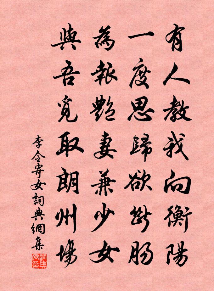 詩詞名句歷史字典書法欣賞書法字典國語詞典說文解字康熙字典古漢語字典標 題 作 者 詩 句 寄女作者:李令 朝代:唐代寄女原文有人教我向衡陽,一度思歸欲斷腸。為報艷妻兼少女,與吾覓取朗州場。詩詞問答問:寄女的作者是誰?答:李令問:寄女寫於哪個朝代?答:唐代問:寄女是什麼體裁?答:七絕李令寄女書法欣賞寄女書法作品注釋全唐詩:卷870-70詩詞推薦秋懷五首李謙〔宋代〕東籬數業菊,已著金粟蕊。重陽能幾時,使 * 屈指。向來陶淵明,勿謂今已矣。我欲置樽酒,采之雜浮蟻。沁園春(為友人壽)程正同〔宋代〕富敵陶猗,才卑賈馬,氣吞曹劉。更妓娛安石,東山名勝,樽盈文舉,北海風流。事冷千年,身兼八子,豪舉伊誰寄成都高苗二從事李商隱〔唐代〕家近紅蕖曲水濱,全家羅襪起秋塵。莫將越客千絲網,網得西施別贈人。河清與趙氏昆季宴集得擬杜工部李商隱〔唐代〕勝概殊江右,佳名逼渭川。虹收青嶂雨,鳥沒夕陽天。客鬢行如此,滄波坐渺然。此中真得地,漂蕩釣魚船。武陵春曹勛〔宋代〕春到小園春草綠,煙雨濕雲山。池上梅花已半殘。無奈晚來寒。不怕醉多隻怕醒,花影上闌乾。人在東風縹緲間。廬山草堂夜雨獨宿寄牛二李七庾三十二員外白居易〔唐代〕丹霄攜手三君子,白髮垂頭一病翁。蘭省花時錦帳下,廬山雨夜草庵中。終身膠漆心應在,半路雲泥跡不同。唯有桂枝香陳允平〔宋代〕殘蟬花乍歇。又亂葉打花,蛩韻淒切。寂寞天香院宇,露涼時節。乘鸞扇底婆娑影,幻清虛、廣寒花闕。小山秋重春雲怨(上巳·黃鍾商)馮偉壽〔宋代〕春風惡劣。把數枝香錦,和鶯吹折。雨重柳腰嬌困,燕子欲扶扶不得。軟日烘煙,乾風吹霧,芍藥荼弄顏色。簾幕近承琮上人問訊甚勤老懶不能作書以偈答之晁公溯〔宋代〕世界猶如露電身,更於空里聚微塵。何時麥積崖邊路,說法重來要度人。贈林愚庵墨梅蒲壽宬〔宋代〕色空已解花光意,香影難隨逋老蹤。此叟芒端不著蜜,幾回曾誤壁間蜂。送奎上人往中川釋了惠〔宋代〕湫間雲冷不成眠,聽得樵歌一曲全。切莫喧傳江上路,此聲不入釣魚船。何家港舍舟步至新河口崔敦禮〔宋代〕潮來白浪卷平沙,漸見菰蒲沒兩涯。會欲燃犀鞭魍魎,可能結網羨鱨鯋。三千水擊鵾鵬上,百萬軍行將士嘩。尺嘆善應無方釋智愚〔宋代〕兩腳蹣跚林葉稀,去來初不涉離微。靈機示轉已先照,蹤跡擬從何處歸。贈溫觀主賈島〔唐代〕一別羅浮竟未還,觀深廊古院多關。君來幾日行虛洞,仙去空壇在遠山。胎息存思當黑處,井華懸綆取朝間。弊廬和昌言官舍十題石蘭司馬光〔宋代〕楚人歌紫蘭,華禁無傳久。循名意茲是,誰得明真否。天憐菊性孤,秀髮秋風后。固令芳物生,聊作黃花友。江郎山胡仲弓〔宋代〕觀盡千山與萬山,幾曾得似此峰巒。誰能移向西湖上,並與西湖一樣看。頃在金陵郡齋與黃觀復夜坐漏箭下一二十刻率蘇泂〔宋代〕映雪工夫久已無,引錐自刺一何愚。青燈一盞書狼藉,畫作金陵瞌睡圖。六朝門再呤周曇〔唐代〕空知勇銳不知兵,困獸孤軍未可輕。安有長驅百餘萬,身馳幾旅欲先征。與胡興安夜別何遜〔南北朝〕居人行轉軾,客子暫維舟。念此一筵笑,分為兩地愁。路濕寒塘草,月映清淮流。方抱新離恨,獨守故園秋。湘口徐照〔宋代〕廟前物景非人世,獨獨來看路逕遙。船板鷺行乾有跡,菊花鹿踐曲生苗。合流水急聲難盡,過片雲輕色易銷。黃葉名句推薦一道殘陽鋪水中,半江瑟瑟半江紅。白居易《暮江吟》 兒女紛紛夸結束,新樣釵符艾虎。劉克莊《賀新郎·端午》 可憐九月初三夜,露似真珠月似弓。白居易《暮江吟》 善歌者,使人繼其聲;善教者,使人繼其志。戴聖《禮記·學記》 桂棹兮蘭枻,斵冰兮積雪;屈原《九歌》 數里黃沙行客路,不堪回首思秦原。周朴《春日秦國懷古》 今年元夜時,月與燈依舊。歐陽修《生查子·元夕》 缺月掛疏桐,漏斷人初靜。蘇軾《卜運算元·黃州定慧院寓居作》 同是人,類不齊,流俗眾,仁者希。李毓秀《弟子規·親仁》 訪戴歸來,尋梅懶去,獨釣無聊。薛昂夫《蟾宮曲·雪》