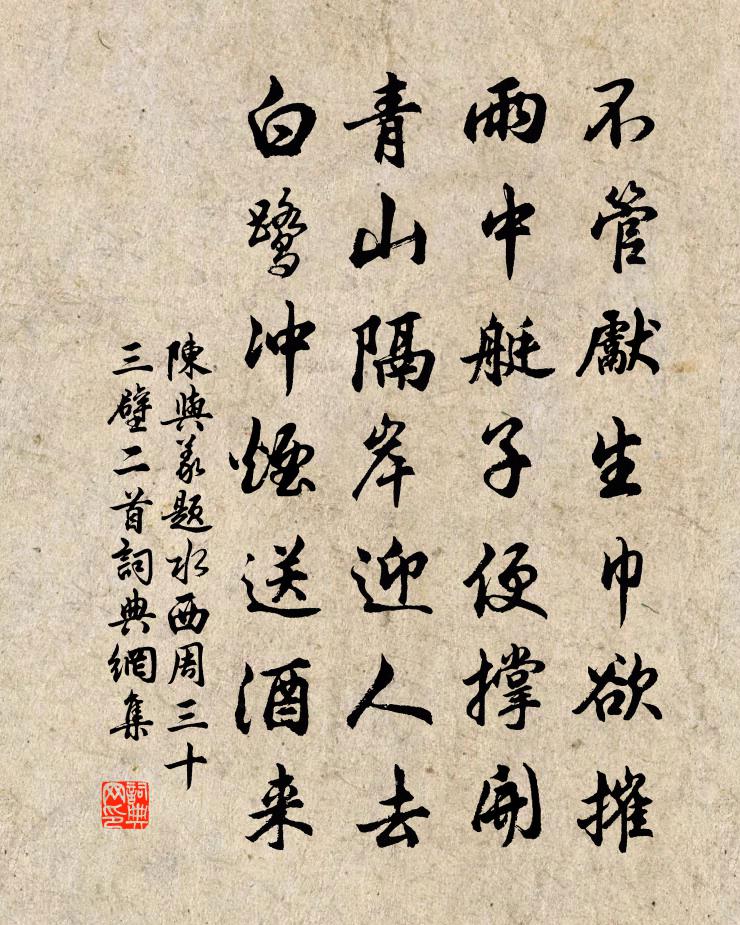 詩詞名句歷史字典書法欣賞書法字典國語詞典說文解字康熙字典古漢語字典標 題 作 者 詩 句 題水西周三十三壁二首作者:陳與義 朝代:宋代題水西周三十三壁二首原文不管先生巾欲摧,雨中艇子便撐開。青山隔岸迎人去,白鷺沖煙送酒來。詩詞問答問:題水西周三十三壁二首的作者是誰?答:陳與義問:題水西周三十三壁二首寫於哪個朝代?答:宋代問:陳與義的名句有哪些?答:陳與義名句大全陳與義題水西周三十三壁二首書法欣賞題水西周三十三壁二首書法作品詩詞推薦題潤州金山寺張祜〔唐代〕一宿金山寺,超然離世群。僧歸夜船月,龍出曉堂雲。樹色中流見,鐘聲兩岸聞。翻思在朝市,終日醉醺醺。亂離孟郊〔唐代〕天下無義劍,中原多瘡痍。哀哀陸大夫,正直神反欺。子路已成血,嵇康今尚嗤。為君每一慟,如劍在四肢。折羽偈頌二十一首釋智愚〔宋代〕一人高高峰頂立,一人深深海底行。不是與人難共住,大都緇素要分明。贈太傅中書令張文節公輓詞三首宋庠〔宋代〕昔命光三事,今嗟贖百身。堂無織蒲妾,車有吐茵人。台坼層氛夜,槐凋故府春。空餘相國第,不與勢家鄰。答厲季平投詩有懷歸鄉之意曾豐〔宋代〕詞場凡馬洗之空,學海波中得老龍。尚韻許人賡白雪,正聲惟我識黃鐘。素王不作無明主,賤子何之可附庸。烏鵲生查子陳亞〔宋代〕小院雨餘涼,石竹風生砌。罷扇盡從容,半下紗廚睡。起來閒坐北亭中,滴盡真珠淚。為念婿辛勤,去折蟾宮桂。丹霞見靈照女圖贊釋智愚〔宋代〕冤有頭,債有主。天然欲訪龐翁,恰好撞著此女。揣盡家私。瓜甜蒂苦。因芘上下不知同,牛奶郎忙塗赤土。偈頌一百四十一首釋師範〔宋代〕木中有火,鑽之始明。礦中有金,煉之始精。諸人分上各各有無價之寶,如何甘自溺於陰入之坑。浣溪沙向子諲〔宋代〕一夜涼E97C動碧廚。曉庭飛雨濺真珠。玉人睡起倚金鋪。雲髻作堆初未整,柳腰如醉不勝扶。天仙風調世間無蕭灑桐廬郡十絕范仲淹〔宋代〕蕭灑桐廬郡,嚴陵舊釣台。江山如不勝,光武肯教來。送程給事知越州邢恕〔宋代〕稽山鑒水正宜秋,笑鄰銅符下鷁舟。青瑣夕郎傳故事,鴻都仙客足風流。錦衣著去經鄉國,繭紙翻成賦郡樓。祗恐太平公主山亭侍宴張昌宗〔唐代〕淮南有小山,嬴女隱其間。折桂芙蓉浦, * 明月灣。扇掩將雛曲,釵承墮馬鬟。歡情本無限,莫掩洛城關。荷花宋祁〔宋代〕別岸香風起,橫塘夕霧開。歌須靜婉至,步憶貴妃來。折藕冰絲剩,翻荷孔蓋回。曾經佛圖咒,解厭柏梁災。盛府蝦蟆姜特立〔宋代〕周公灑灰垂典教,為爾朋徒多取鬧。如今大索不相容,省口何如且泥淖。似臧伯通陳著〔宋代〕玉守魚符委任隆,規模新處見新功。來從北斗光躔下,坐治南山紫翠中。載路政聲如藥石,契天心畫在屏風。深深念奴嬌(詠牡丹)陳著〔宋代〕洛陽地脈,是誰人、縮到海涯天角。綠樹成陰芳霧底,得見當年台閣。園杏貴客,海棠姬侍,擁入青油幕。人間那和富公權宗丞十站王之道〔宋代〕惡客未嘗知酒聖,高人何止擅文豪。三司自揣非吾事,敢覬徐州解佩刀。泛舟村落阻風不能少進而菱梢芡觜繚舷上下篙沈與求〔宋代〕艇子掠岸行,水瘦不濡尾。狂飈振疏蓬,獵獵鳴兩耳。十篙 * 褪,逆勢何乃爾。野芡伺吾間,回梢哆利觜。亦有王提刑輓詞樓鑰〔宋代〕二廣外台首,威稜著一門。志期諸郡肅,忍見匹夫冤。奮系猶鷹鷙,興讒有兔爰。投閒了無恨,此意與誰論。山居詩釋延壽〔宋代〕任運騰騰無所依,閒遊長坐性怡怡。疏林不遣閒人到,密意多應夜月知。驟雨這時苔路滑,撥雲行處石橋危。塵沙名句推薦五更鼓角聲悲壯,三峽星河影動搖。杜甫《閣夜》 數人世相逢,百年歡笑,能得幾回又。何夢桂《摸魚兒·記年時人人何處》 明朝掛帆席,楓葉落紛紛。李白《夜泊牛渚懷古》 愁無限,消瘦盡,有誰知?閒教玉籠鸚鵡念郎詩。納蘭性德《相見歡·落花如夢淒迷》 一時輕信人言語.自有明人話不平。馮夢龍《警世通言·卷四》 故百工從事,皆有法所度。今大者治天下,其次治大國,而無法所度,此不若百工辯也。墨子《墨子·04章 法儀》 綠蟻新醅酒,紅泥小火爐。白居易《問劉十九》 泥上偶然留指爪,鴻飛那復計東西。蘇軾《和子由澠池懷舊》 綠葉青跗映丹萼,與君裴回上金閣。王勃《落花落》 獻賦十年猶未遇,羞將白髮對華簪。錢起《贈闕下裴舍人》