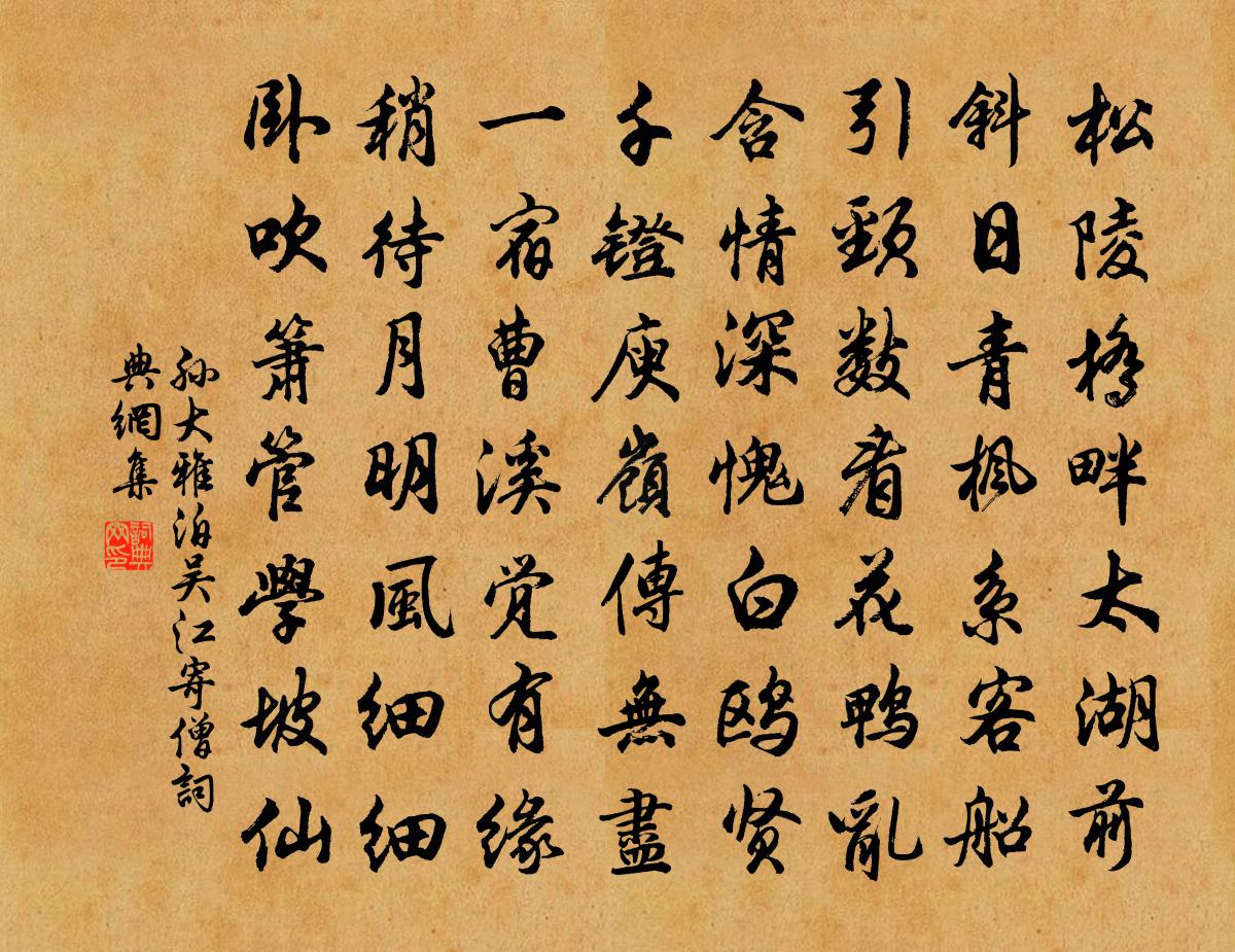 詩詞名句歷史字典書法欣賞書法字典國語詞典說文解字康熙字典古漢語字典標 題 作 者 詩 句 泊吳江寄僧作者:孫大雅 朝代:宋代泊吳江寄僧原文松陵橋畔太湖前,斜日青楓系客船。引頸數看花鴨亂,含情深愧白鷗賢。千鐙庾嶺傳無盡,一宿曹溪覺有緣。稍待月明風細細,臥吹1~1簫管學坡仙。詩詞問答問:泊吳江寄僧的作者是誰?答:孫大雅問:泊吳江寄僧寫於哪個朝代?答:宋代孫大雅泊吳江寄僧書法欣賞泊吳江寄僧書法作品詩詞推薦長安早春王建〔唐代〕霏霏漠漠繞皇州,銷雪欺寒不自由。先向紅妝添曉夢,爭來白髮送新愁。暖催衣上縫羅勝,晴報窗中點彩球。每度嵩山采菖蒲者李白〔唐代〕神仙多古貌,雙耳下垂肩。嵩岳逢漢武,疑是九疑仙。我來采菖蒲,服食可延年。言終忽不見,滅影入雲煙。喻帝悼亡姜特立〔宋代〕平生起居處,杳杳復冥冥。人遠跡亦沈,邈焉居者情。以此觀世間,無物可留意。有如空中雲,東西適相值。雲收善泉池馬之純〔宋代〕十頃青瑤浸碧流,更添景趣極深幽。帝為九洲十八島,上有五城十二樓。苕霅荷花風度曉,瀟湘蘆竹雨生秋。昭明弋陽鄭氏麓亭李昴英〔宋代〕管鄰寒溪揖怪峰,徑穿鉅竹綠陰濃。幽人去後無猿鶴,冷落亭台濕蘚封。和郭帚齋詠龜泉劉黻〔宋代〕鎔出形模造化工,石龜中有冽泉通。來從西峽蝦蟆碚,靜鎮南源瑪瑙宮。潤澤一城消眾渴,澄波千古照孤忠。貪廉九月曾豐〔宋代〕精英攸結,霜莫之折。小字女節,公生烈烈。精英攸凝,霜莫之陵。小字女莖,公生亭亭。女莖曰咄,挺其自拔。八月十五夜陪遛守宣徽登西樓值雨待月久不見司馬光〔宋代〕經歲待佳節,無如陰靄何。果然時雨足,安用月華多。未免銀紅進,空聞玉漏過。庾公興不淺,久為駐鳴珂。謝史計使寄建茗趙汝騰〔宋代〕皇華珍意辦頭綱,余馥吾儕也得嘗。黯戇終然言有味,仝衰那得字搜腸。耕雲隴畔知無憾,貯月瓢中剩有香。獨念贈送鶴田李元暉方回〔宋代〕一別九寒暑,乾坤事事新。老身余長物,故友盡窮人。汩汩猶群盜,時時有戰塵。少陵詩眼在,試覓曲江春。勝果僧舍與葉養源論武侯出處作數韻孫應時〔宋代〕隆中躬耕歸,抱膝詠梁父。誰稱此臥龍,名字震東土。平生惟老龐,忘言各心許。相從亦何為,誓不入州府。敲門春旱二首張耒〔宋代〕風雲閒益高,旱色起諸嶺。施生澤未渥,曉氣挾余冷。飛沙磣桃李,碧草思耿耿。麥根不走地,稻壟臥陳梗。蛟龍題四蘭釋紹曇〔宋代〕一再荒林雪,全身掩薜蘿。直饒埋沒得,爭柰鼻頭何。滿江紅(春晚)佚名〔宋代〕著意留春,留不住、春歸難戀。最苦是、梅天煙雨,麥秋庭院。嫩竹陰濃鶯出谷,柔桑采盡蠶成繭。奈沉腰、寬盡和王詹叔寄彭年四首韓維〔宋代〕紛紛聲里滿埃塵,一聽除書耳目新。清世未能忘薄祿,官曹猶得作閒人。劉八窗見訪一夕即別武衍〔宋代〕五年苕上別,別後愧相疎。今夕知何夕,憶渠俄見渠。同持一杯酒,勝寄百寺書。未及論心事,曉風回蹇驢。壽安雜詩十首且游司馬光〔宋代〕遊人巒山水,日晏澹忘歸。但愛雲煙好,那知仆馬飢。感皇恩呂勝己〔宋代〕秋意滿江湖,雨輕風熟。上水扁舟片帆速。遠山低岸,貪看淺紅深綠。不知回柁尾,滄灣宿。推枕起來,舉杯相屬掩門陸游〔宋代〕簌簌落高槐,陰陰長綠苔。只言門晝掩,不道客誰來。足痹思尋壑,愁生久撥醅。吾兒能問事,梨栗且炮煨。高士詠柳下惠吳筠〔唐代〕展禽抱純粹,滅跡和光塵。高情貴軒冕,降志救世人。百行既無點,三黜道彌真。信謂德超古,豈惟言中倫。名句推薦欲多傷神,財多累心!佚名《增廣賢文·下集》 川澤納污,所以成其深;山嶽藏疾,所以就其大。魏徵《隋書·列傳·卷十一》 執手相看淚眼,竟無語凝噎。柳永《雨霖鈴·寒蟬淒切》 紅蓮相倚渾如醉,白鳥無言定自愁。辛棄疾《鷓鴣天·鵝湖歸病起作》 不肯畫堂朱戶,春風自在楊花。王安國《清平樂·春晚》 雖萬被戮,豈有悔哉!班固《漢書·傳·司馬遷傳》 記取江湖泊船處,臥聞新雁落寒汀。陸游《夜泊水村》 白頭宮女在,閒坐說玄宗。元稹《行宮》 茅檐人靜,蓬窗燈暗,春晚連江風雨。陸游《鵲橋仙·夜聞杜鵑》 況故人新擁,漢壇旌節。辛棄疾《滿江紅·漢水東流》