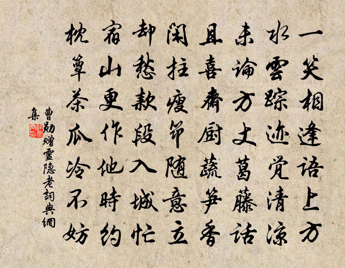詩詞名句歷史字典書法欣賞書法字典國語詞典說文解字康熙字典古漢語字典標 題 作 者 詩 句 贈靈隱老作者:曹勛 朝代:宋代贈靈隱老原文一笑相逢語上方,水雲蹤跡覺清涼。未論方丈葛藤話,且喜齋廚蔬筍香。閒拄瘦筇隨意立,卻愁款段入城忙。宿山更作他時約,枕簟茶瓜冷不妨。詩詞問答問:贈靈隱老的作者是誰?答:曹勛問:贈靈隱老寫於哪個朝代?答:宋代曹勛贈靈隱老書法欣賞贈靈隱老書法作品詩詞推薦雲中憶歸鄭獬〔宋代〕何日燕南去,平生此別稀。定知花已發,不及雁先歸。寒日連雲慘,驚沙帶雪飛。雲中風土惡,換盡別家衣。揚州雜詠七首晁補之〔宋代〕皁莢村南三里許,春江不隔一程遙。雙堤鬥起如牛角,知是隋家萬里橋。小園梅未盡放叔用府教以詩索和勉勝韻以謝魏近思〔宋代〕造化機緘莫恨遲,須知開謝各因時。物華未分隨春意,梅蕊先饒露玉肌。雪裹精神千萬熊,水邊瀟灑兩三枝。何當一萼紅(弁陽翁新居,堂名志雅,詞名萍洲漁笛譜)張炎〔宋代〕制荷衣。傍山窗卜隱,雅志可閒時。款竹門深,移花檻小,動人芳意菲菲。怕冷落、苹洲夜月,想時將、漁笛靜中頌十玄談釋印肅〔宋代〕轉轉,兩頭不著中心選。無位真人是阿誰,佛祖鼻孔穿成串。緣識宋太宗〔宋代〕阿諛順旨察來情,瞽者忩忩不可行。親親友愛慈敦睦,凡言俗態謾纏縈。轉調二郎神/二郎神劉克莊〔宋代〕人言官冗,老病底、法當先省。況行則蹣跚,立時跛倚,倖免做他兩省。客怕逢迎書慵答,得省處、而今姑省。笑宿省吳潛〔宋代〕襆被趨省宿,披襟對晚涼。古心知老樹,生意見新篁。鐘鼓鳴將合,蜩蟬咽更長。靜中觀物化,誰與共平章。賀同年林簿同卿龜從新婚王邁〔宋代〕金華門外浥京塵,烏石山前結帨巾。翁婿相看冰映玉,庭闈一笑頰生春。昔言爾爾嫌隨俗,今喚卿卿喜有人。來歲句時定欽〔宋代〕白雲黃鶴自來去,綠水青山無古今。以酒渴愛江清作五小詩寄廖明略學士兼簡初和黃庭堅〔宋代〕將發沔鄂間,盡醉竹林酒。二三石友輩,未肯棄老朽。借問坐客誰,盧溪紫髯叟。此翁今惜醉,舊不論升斗。病起十首劉克莊〔宋代〕有四宜休七不堪,豈容華皓尚痴貪。固難唐突耆英社,尚可追攀老學庵。酷嗜蟹螯聊自酌,高懸麈尾共誰談。吾聞東山月下懷友人竇群〔唐代〕東山多喬木,月午始蒼蒼。雖殊碧海狀,愛此青苔光。高下滅華燭,參差啟洞房。佳人夢餘思,寶瑟愁應商。皎潔題長灘鋪李呂〔宋代〕一丘一壑吾臭味,真是真非孰有無。月笛煙蓑秋正好,急須歸釣渚溪魚。鵝湖寺喻良能〔宋代〕鵝王牧群鵝,濁世肯下游。積水近天關,有時戲沈浮。老禪天人師,領略傾九州。初開選佛場,坐斷諸峰頭。當時次韻費司法方岳〔宋代〕有客誰為數擊鮮,西風孤人雁聲前。酒無多酌何如醒,詩不能奇莫浪傳。秋色淡於人寂寂,桂花香得月娟娟。五經蠟梅四絕句陳與義〔宋代〕來從底處所,黃露滿衣濕。緣憨翻得憐,亭亭倚風立。鄰曲陸游〔宋代〕濁酒聚鄰曲,偶來非宿期。拭盤堆連展,洗酺煮黎祁。烏牸將新犢,青桑長嫩枝。豐年多樂事,相勸且伸眉。酬王正仲登嶽麓寺閣見寄曾鞏〔宋代〕聞君東南使,攬轡雲松間。皇華照楚甸,吉玉投衡山。幽尋得臨觀,意豁窮躋攀。顧我客鬥牛,三年疏往還。低心贊三十六祖頌釋印肅〔宋代〕無事商那和,翛然了義多。是法不可說,轉念摩嚕陀。名句推薦但屈指西風幾時來,又不道流年暗中偷換。蘇軾《洞仙歌·冰肌玉骨》 人心險于山川,難於知天。莊子《莊子·雜篇·列禦寇》 不知戒,後必有,恨後遂過不肯悔,讒夫多進荀子《荀子·成相》 行雲卻在行舟下,空水澄鮮,俯仰留連,疑是湖中別有天。歐陽修《採桑子·畫船載酒西湖好》 新竹高於舊竹枝,全憑老乾為扶持。鄭燮《新竹》 回首天涯,一抹斜陽,數點寒鴉。張可久《折桂令·九日》 燕支落漢家,婦女無華色。李白《塞上曲》 芳原綠野恣行事,春入遙山碧四圍。程顥《郊行即事》 天時不如地利,地利不如人和。孟子《孟子·公孫丑章句下·第一節》 相識滿天下,知心能幾人?佚名《增廣賢文·上集》