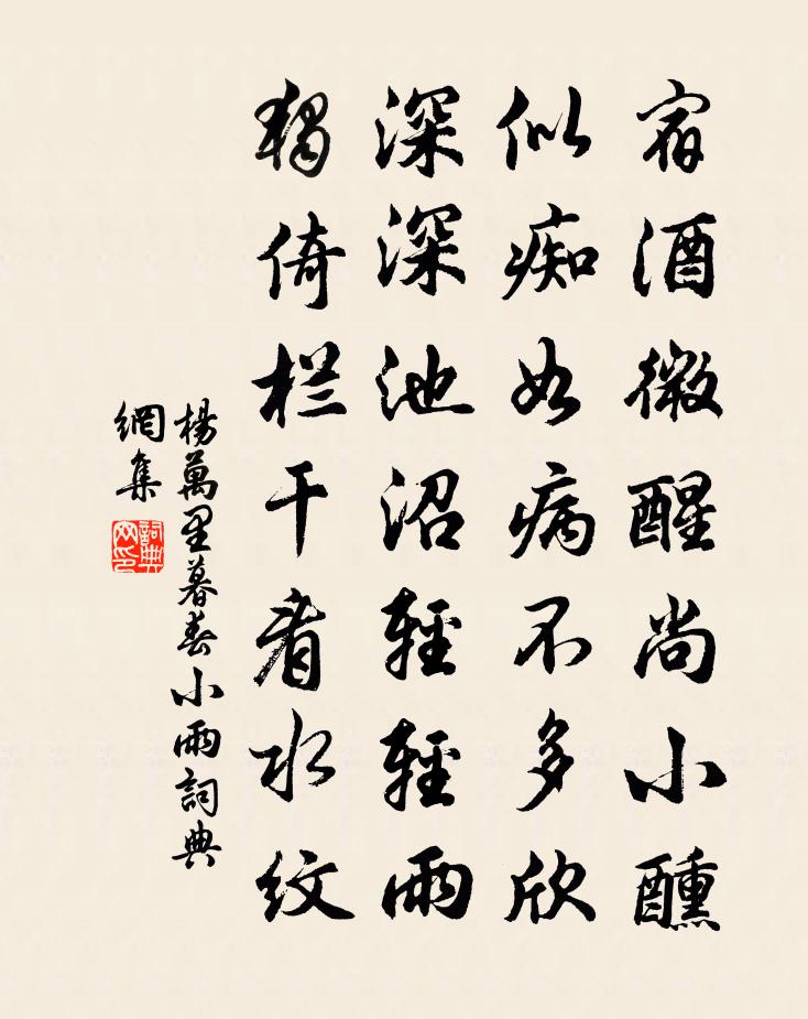 宿酒微醒尚小醺,似痴如病不多欣。深深池沼輕輕雨,獨倚欄乾看水紋。