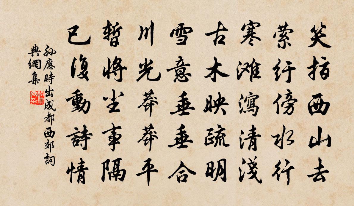 詩詞名句歷史字典書法欣賞書法字典國語詞典說文解字康熙字典古漢語字典標 題 作 者 詩 句 出成都西郊作者:孫應時 朝代:宋代出成都西郊原文笑指西山去,縈紆傍水行。寒灘瀉清淺,古木映疏明。雪意垂垂合,川光莽莽平。暫將塵事隔,已復動詩情。詩詞問答問:出成都西郊的作者是誰?答:孫應時問:出成都西郊寫於哪個朝代?答:宋代孫應時出成都西郊書法欣賞出成都西郊書法作品詩詞推薦題汪水雲詩卷秦嗣彭〔宋代〕禾黍興悲兩鬢皤,千年荊棘幾銅駝。義熙處士流風遠,天寶詩人舊恨多。雨露又新周草木,煙塵空想漢山河。庾郎長相思三首·其二李白〔唐代〕日色已盡花含煙,月明欲素愁不眠。趙瑟初停鳳凰柱,蜀琴欲奏鴛鴦弦。此曲有意無人傳,願隨春風寄燕然,憶君九月三日泛舟湖中作陸游〔宋代〕兒童隨笑放翁狂,又向湖邊上野航。魚市人家滿斜日,菊花天氣近新霜。重重紅樹秋山晚,獵獵青簾社酒香。鄰曲拜旦表陸游〔宋代〕一封馳奏效嵩呼,清蹕何時返故都?只道建炎巡狩禮,誰知故事自祥符!中夜起釋惠崇〔宋代〕初月不到曉,夜色何冥冥。獨立秋江上,風波卷寒星。贈元九侍御文石枕以詩獎之劉禹錫〔唐代〕文章似錦氣如虹,宜薦華簪綠殿中。縱使涼飆生旦夕,猶堪拂拭愈頭風。寄舊同年何扶〔唐代〕金榜題名墨尚新,今年依舊去年春。花間每被紅妝問,何事重來只一人。詠雪次鐸字痛字韻二首項安世〔宋代〕我時已巴歈,曲短不成弄。君詩如郢人,白雲渺雲夢。天公震而矜,大地作一供。封姨不自惜,紛紛管迎送。須臾春詞二首張琰〔唐代〕垂柳鳴黃鸝,關關若求友。春情不可耐,愁殺閨中婦。日暮登高樓,誰憐小垂手。昨日桃花飛,今朝梨花吐。春色去歲重陽日得彥威信附六月間二小倒及從弟倒程公許〔宋代〕今節恩賜沐,把菊開清尊。天涯信音來,擴緘為一欣。展視未竟幅,淚雨益帨帉。辭家甫八年,邊塵覆全坤。平生孟津汪元量〔宋代〕寒蘆風颯颯,時節近昏黃。木脫千山瘦,江空一水長。雲高鵬北運,天闊雁南翔。讀盡焚舟賦,持觴酹子桑。送人謁柳開釋正緣〔宋代〕柳牆高於花,怒飛方可至。奇哉游夏徒,吐辭作雄翅。聲聲慢郭居安〔宋代〕捷書連晝,甘灑通宵,新來喜沁堯眉。許大擔當,人間佛力須彌。年年八月八日,長記他、三月三時。平生事,想竹溪生日二首劉克莊〔宋代〕試把過江人物數,溪翁之外更誰哉。不爭百草群芳長,寧殿千花萬卉開。周廟瑟曾三嘆詠,舜廊琴亦載賡來。老人耕圖二十一首入倉樓璹〔宋代〕天寒牛在牢,歲暮粟入庾。田父有餘樂,炙背臥檐廡。卻愁催賦租,胥吏來旁午。輸官王事了,索飯兒叫怒。次方寺丞方湖韻劉克莊〔宋代〕晚來吉語到茅椽,太華詩翁約泛蓮。況有鄒枚同預宴,可能李郭獨如仙。帝猶給我還山俸,天不需人買月錢。揮手紅雲亭即事五首方回〔宋代〕游觀不在大,但取意疏恢。積雨欣初霽,閒人偶獨來。目隨新句轉,萍殿去鳧開。無酒勝於酒,移時再茗杯。李道士惠琴軒集文同〔宋代〕驅役精魂入大幽,滿編奇絕盡冥搜。不教天地略容隱,應與鬼神同訪求。海藏光芒開寶玉,羽林鋒刃立戈矛。蕭台呈伯父元仲二首周麟之〔宋代〕干戈十年余,荏苒百憂至。誰憐齒未壯,遽失彩衣戲。捫心天不聞,空下千斛淚。藐然一星孤,未忍隨以逝。雨濕有常吟邵雍〔宋代〕天地有常理,日月有常明。四時有常序,鬼神有常靈。聖人有常德,小人無常情。名句推薦青山飛起不壓物,野水流來欲濕人牛殳《琵琶行》 故去喜去惡,虛心以為道舍。韓非及後人《韓非子·揚權》 用人物,須明求。儻不問,即為偷。李毓秀《弟子規·謹》 今逢四海為家日,故壘蕭蕭蘆荻秋。劉禹錫《西塞山懷古》 欹枕數秋天,蟾蜍下早弦。納蘭性德《菩薩蠻·蕭蕭幾葉風兼雨》 尋河愁地盡,過磧覺天低。岑參《磧西頭送李判官入京》 鈍學累功,不妨精熟顏之推《顏氏家訓·文章篇》 人棄我取,人取我與。司馬遷《史記·貨殖列傳》 朝來嗔寂寞,不肯試新衣。馮夢龍《喻世明言·卷一》 父子竭力山成玉,弟兄同心土變金。佚名《增廣賢文·下集》