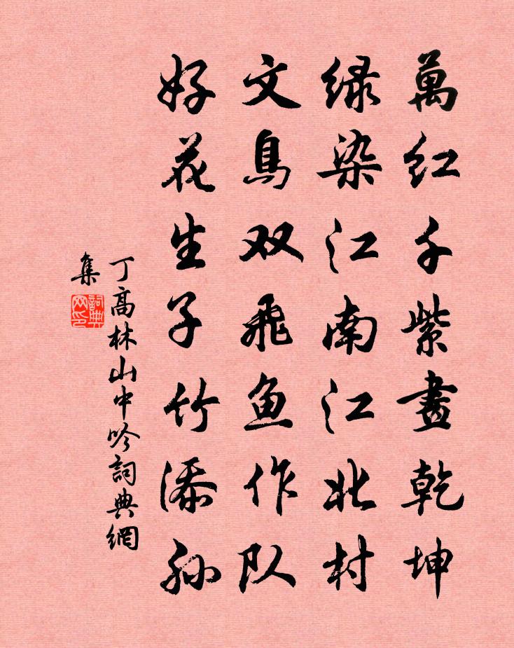 詩詞名句歷史字典書法欣賞書法字典國語詞典說文解字康熙字典古漢語字典標 題 作 者 詩 句 山中吟作者:丁高林 朝代:宋代山中吟原文萬紅千紫畫乾坤,綠染江南江北村。文鳥雙飛魚作隊,好花生子竹添孫。詩詞問答問:山中吟的作者是誰?答:丁高林問:山中吟寫於哪個朝代?答:宋代丁高林山中吟書法欣賞山中吟書法作品詩詞推薦文山丞相丙子自京口脫去變姓名作清江劉洙今汪元量〔宋代〕昔年變姓走淮濱,虎豹從橫獨愴神。青海茫茫迷故國,黃塵黯黯泣孤臣。魏雎張祿夢中夢,越蠡陶朱身後身。今日西齋養病夜懷多感因呈上從叔子云孟郊〔唐代〕遠客夜衣薄,厭眠待雞鳴。一床空月色,四壁秋蛩聲。守淡遺眾俗,養疴念餘生。方全君子拙,恥學小人明。蚊蚋送長社胡明府徐鉉〔唐代〕黃綬系未穩,桂枝香尚新。琴堂寧久次,諫署正求人。皎皎涼秋月,飄飄清路塵。元常有遺翰,求作篋中珍。渡湘江宋祁〔宋代〕春過湘江渡,真觀八景圖。雲藏嶽麓寺,江入洞庭湖。晴日花爭發,豐年酒易沽。長水十萬戶,游女似京都。訴衷情(同前)晁補之〔宋代〕小園過午,便覺涼生翠柏。戎葵閒出牆紅,萱草靜依徑綠。還是去年,浮瓜沈李,追涼故繞池邊竹。小筵促。忽憶廣陵會三同舍各以其字為韻仍邀同賦劉貢父蘇軾〔宋代〕去年送劉郎,醉語已驚眾。如今各漂泊,筆硯誰能弄。我命不在天,羿彀未必中。作詩聊遣意,老大慵譏諷。夫子讀史七首於石〔宋代〕莫言世事只如棋,千載是非人共知。吾道廢興時否泰,人才進退國安危。詩書未火秦猶在,黨錮無鉤漢亦衰。覆轍內司毀林建寺淳佑士人〔宋代〕合抱長村臥壑深,於今惟恨不空林。誰知廣廈千斤斧,斲盡人間孝子心。浣溪沙賀鑄〔宋代〕不信芳春厭老人,老人幾度送餘春。惜春行樂莫辭頻。巧笑艷歌皆我意,惱花顛酒拚君真。物情惟有醉中真。秋晚雜興陸游〔宋代〕洗耳高人恥見堯,看渠應不受弓招。精神徇物那能久,刀礪君看日日銷。致政楊圖南僉判惠園亭石刻來索惡語寄題四首周必大〔宋代〕不向山林不背村,清江東畔邑東門。雨餘徐步看山罷,植杖沙邊試水痕。師友六言一首劉克莊〔宋代〕聞諸師者本同,取之友者亦公。高才有出象外,精義不離箇中。南渡大儒管見,西山先生正宗。全州呂農簿輓詩三首方回〔宋代〕公田怨已盈,關幣出尤輕。稍欲輸忠款,初非賣直聲。二千垂郡祿,五百存台評。舊日朝天路,端門野草生。景仁如況之聞用歌舞望門而反作此戲之韓維〔宋代〕一夜嚴風結素波,盍簪寧避曉寒多。范滂攬轡方清俗,墨子回車豈惡歌。雲外雁寒驚歲晚,林間鴉語弄春和。知君木筆花張朴〔宋代〕亭亭花一樹,乍發小東牆。碧管描春色,丹鋒點化工。凝窗時染翰,弄影日書空。莫問龍蛇事,臨池興不窮。癸卯與宋堯夫集於豫章之貢院既別堯夫就親南曾豐〔宋代〕吾人同醉豫章春,別後惟君日日新。家據東床官北關,腰錢騎鶴更何人。送梵才上人歸天台皇甫泌〔宋代〕昔在童蒙歲,學禮暨詩書。肅肅秉庭訓,罔敢甯斯須。積習將一紀,心目多勤劬。本此修拙辭,階之登仕途。得以偈釋志芝〔宋代〕茶芽蔍蔌初離焙,筍角狼忙又吐泥。山舍一年春事辦,得閒誰管板頭低。送故人歸魯韓翃〔唐代〕魯客多歸興,居人悵別情。雨餘衫袖冷,風急馬蹄輕。秋草靈光殿,寒雲曲阜城。知君拜親後,少婦下機迎。李倅生辰三首陳棣〔宋代〕心覽沖虛厭物波,樽前肯聽雪兒歌。能捐伐性嬋娟斧,不必樛枝號養和。名句推薦烏啼鵲噪昏喬木,清明寒食誰家哭。白居易《寒食野望吟》 中山孺子倚新妝,鄭女燕姬獨擅場。李夢陽《汴京元夕》 夫惡有同方取不取同而已者乎?墨子《墨子·01章 親士》 晚年唯好靜,萬事不關心。王維《酬張少府》 寒隨一夜去,春逐五更來。史青《應詔賦得除夜》 春草明年綠,王孫歸不歸?王維《送別 / 山中送別 / 送友》 衝波突出人齊譀,躍浪爭先鳥退飛。盧肇《競渡詩 / 及第後江寧觀競渡寄袁州剌史成應元》 會當凌絕頂,一覽眾山小。杜甫《望岳》 不是冤家不聚頭,冤家相聚幾時休?馮夢龍《警世通言·卷二》 杯酒相延,今夕不應慳。陳著《江城子·中秋早雨晚晴》