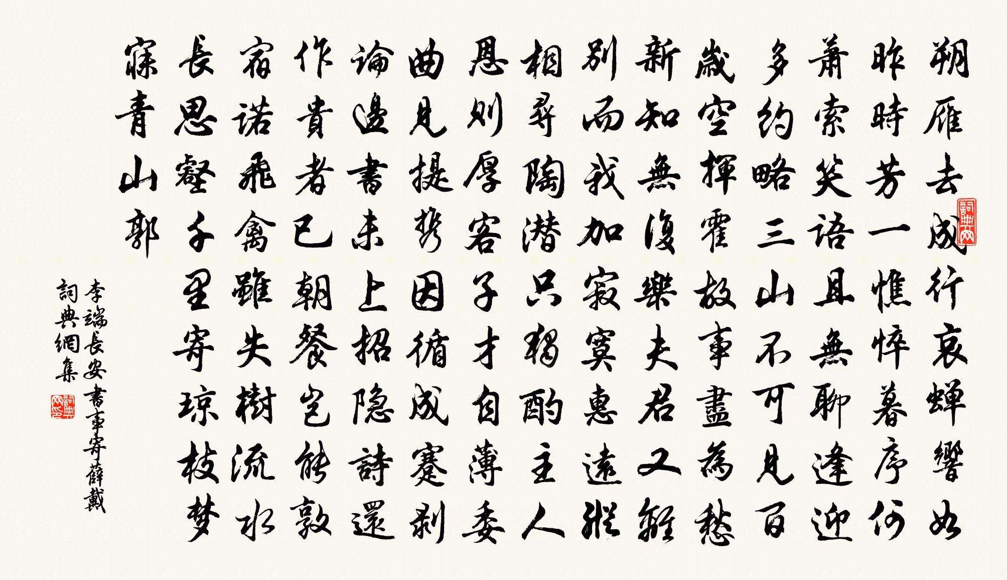 詩詞名句歷史字典書法欣賞書法字典國語詞典說文解字康熙字典古漢語字典標 題 作 者 詩 句 長安書事寄薛戴作者:李端 朝代:唐代長安書事寄薛戴原文朔雁去成行,哀蟬響如昨。時芳一憔悴,暮序何蕭索。笑語且無聊,逢迎多約略。三山不可見,百歲空揮霍。故事盡為愁,新知無復樂。夫君又離別,而我加寂寞。惠遠縱相尋,陶潛只獨酌。主人恩則厚,客子才自薄。委曲見提攜,因循成蹇剝。論邊書未上,招隱詩還作。貴者已朝餐,豈能敦宿諾。飛禽雖失樹,流水長思壑。千里寄瓊枝,夢寐青山郭。詩詞問答問:長安書事寄薛戴的作者是誰?答:李端問:長安書事寄薛戴寫於哪個朝代?答:唐代問:長安書事寄薛戴是什麼體裁?答:五古李端長安書事寄薛戴書法欣賞長安書事寄薛戴書法作品注釋全唐詩:卷284_22詩詞推薦僧房避暑嚴維〔唐代〕支公好閒寂,庭宇愛林篁。幽曠無煩暑,恬和不可量。蕙風清水殿,荷氣雜天香。明月談空坐,怡然道術忘。次韻陳魯山正字社日同游西湖曾幾〔宋代〕昔在兒童歲,湖山入眼新。只今餘白髮,何以報青春。日暖繁遊子,年豐樂社神。諸公勤載酒,四事每參辰。庚戌過浯溪讀中興碑李曾伯〔宋代〕峿山一何青,浯水一何綠。上有唐朝碑,蒼崖與天矗。清廟倣遺音,靈武號實錄。其筆走風雷,其文貴金玉。曾經恩許奉祠子中兄重寄臣字韻詩再次韻周必大〔宋代〕迂儒豈足助維新,日奉威顏謝主臣。可罷本非緣一事,致疑初不怨三人。弟兄有祿供溫飽,畎畝何階答聖神。此去向秀徐鈞〔宋代〕心慕莊書善說玄,發明奇趣理昭然。世人竊取公遺論,卻把前言作己言。雨晴到江上張九成〔宋代〕今朝山色好,不似未晴時。路轉沙汀出,橋回櫸柳移。群山來袞袞,積水去披披。雲葉多奇態,苹花弄晚姿。人家酬朱元順參議王之道〔宋代〕舟來自金沙,敢避江路繞。計程逾五月,書勞比三考。湖陰見君處,取別殊草草。因思會面難,相從意彌好。新詩恭謝駕自景靈宮回丞相以下皆簪花潘牥〔宋代〕輦路安排看駕回,千官花壓帽檐垂。君王不輟憂勤念,玉貌還如未插時。酬周判官巡至始興會改秘書少監見貽之作兼呈耿廣州張九齡〔唐代〕惟昔遷樂土,迨今已重世。陰慶荷先德,素風慚後裔。唯益梓桑恭,豈稟山川麗。於時初自勉,揆己無兼濟。瘠土丹桂再開對酒曹勛〔宋代〕丹桂何堪急雨催,清香不肯逐蒿萊。卻慶念我輕年待,借得餘霞為再開。面萬湖王葦〔宋代〕台下瀰漫百萬湖,叢生{上艹下佳}葦伴菰蒲。自從圍作民田後,每遇凶年一物無。蒼檜陸游〔宋代〕北風卷野天晝晦,雨如弩鏃穿屋背。老夫下床行躡履,稚子抱書坐持蓋。豈無長楸與巨竹,乾折枝攜共顛沛。孰能詠槐馮清〔明代〕行台階下原植三槐,故巡撫張紀常正德壬申正月剪伐其一,寸乾無存。閏五月初十日,予適撫臨。越旬日,前槐茁題黃氏所居馮時行〔宋代〕環翠五六里,深藏三四家。風高鳴雁序,春暖茁蘭芽。門蒼分楠直,溪流帶竹斜。我來風雪曉,倚杖看梅花。句釋惠崇〔宋代〕霜多秦木迥,雲盡漢山孤。余寄和沖弟竹夫人詩並寄子我六首後征其類晁說之〔宋代〕風流何處有崔廬,委曲此君為我模。草夢枕仙幽意在,燭奴燈婢故情疏。偶人飄蕩泥何恨,居士神通木謾書。葉可同工部李侍郎適訪司馬子微沈佺期〔唐代〕紫微降天仙,丹地投雲藻。上言華頂事,中問長生道。華頂居最高,大壑朝陽早。長生術何妙,童顏後天老。清晨開先寺前望瀑布晁補之〔宋代〕白虹晝下崑崙頂,半入青林久不回。下洞水輪穿地底,冰崖吼怒卻重來。宮詞宋白〔宋代〕水殿東西夾翠樓,春乘步輦過瀛洲。赭袍如日花如錦,一半宮人盡裡頭。悲善才李紳〔唐代〕穆王夜幸蓬池曲,金鑾殿開高秉燭。東頭弟子曹善才,琵琶請進新翻曲。翠蛾列坐層城女,笙笛參差齊笑語。天顏名句推薦晝夜蔽日月,冬夏共霜雪。謝靈運《登廬山絕頂望諸嶠》 明月照高樓,流光正徘徊。曹植《七哀》 殘雪樓台,遲日園林。韓疁《高陽台·除夜》 兒童見說深驚訝,卻問何方是故鄉。殷堯藩《同州端午》 雪裡已知春信至。寒梅點綴瓊枝膩。李清照《漁家傲·雪裡已知春信至》 山無陵,江水為竭。佚名《上邪》 黃金燃桂盡,壯志逐年衰。孟浩然《秦中感秋寄遠上人 / 秦中寄遠上人》 死去元知萬事空,但悲不見九州同。陸游《示兒》 大丈夫生居天地間,豈能鬱郁久居人下!羅貫中《三國演義·第九回》 揮手自茲去,蕭蕭班馬鳴。李白《送友人》