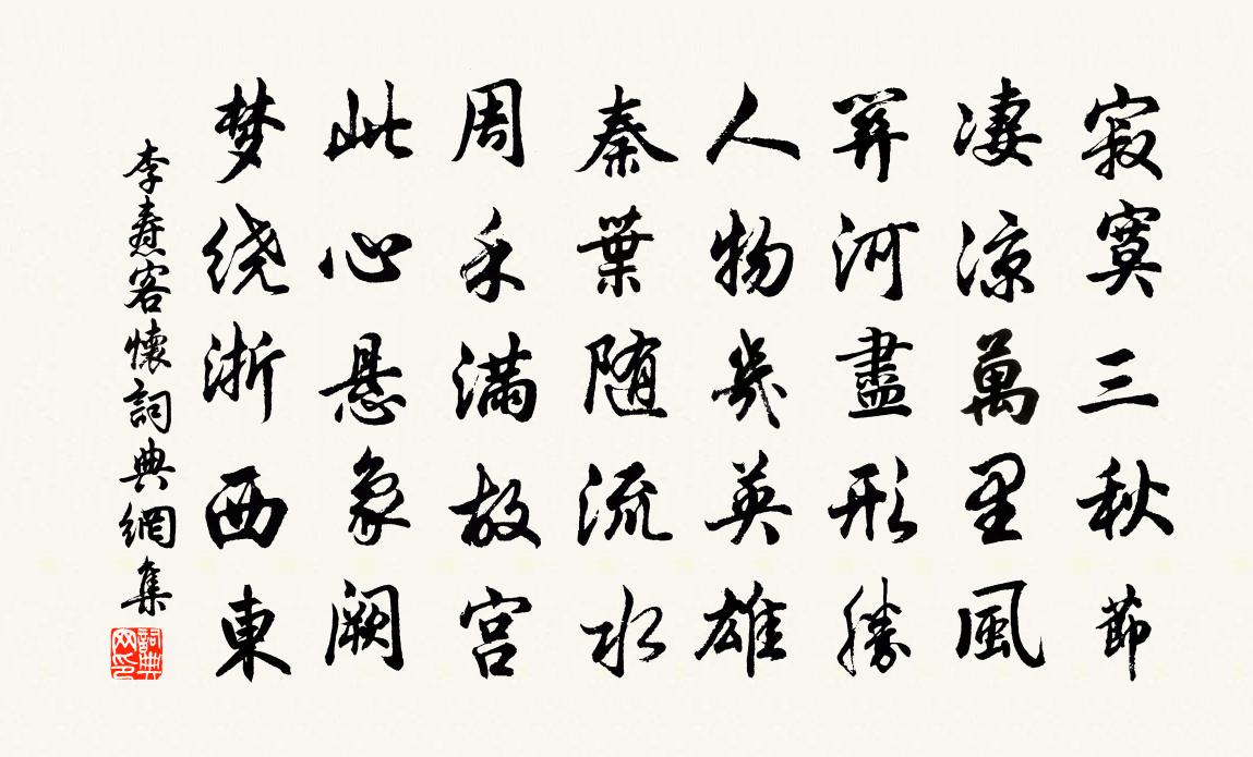詩詞名句歷史字典書法欣賞書法字典國語詞典說文解字康熙字典古漢語字典標 題 作 者 詩 句 客懷作者:李燾 朝代:宋代客懷原文寂寞三秋節,淒涼萬里風。關河盡形勝,人物幾英雄。秦葉隨流水,周禾滿故宮。此心懸象闕,夢繞浙西東。詩詞問答問:客懷的作者是誰?答:李燾問:客懷寫於哪個朝代?答:宋代李燾客懷書法欣賞客懷書法作品詩詞推薦八聲甘州(為遁齊壽)黃機〔宋代〕問訊翁、底事到人間,人間足嬉遊。向文邊書意,詩邊著語,□滿南州。逸韻高情總似,野水盪孤舟。所未能忘者水仙子·渡瓜洲趙善慶〔元代〕渚蓮花脫錦衣收,風蓼青雕紅穗秋,堤柳綠減長條瘦。系行人來去愁,別離情今古悠悠。南徐城下,西津渡口,北答長安崔少府叔封游終南翠微寺太宗皇帝金沙泉見寄李白〔唐代〕河伯見海若,傲然夸秋水。小物昧遠圖,寧知通方士。多君紫霄意,獨往蒼山里。地古寒雲深,岩高長風起。初登秋日過清江傅聘君石溪隱居章采〔宋代〕有美人如玉,招尋故意長。山衣猶芰制,野飯只菰粱。秋入遙空白,霜飛一葉黃。年年三徑里,來往有求羊。回鄉偶書賀知章〔唐代〕離別家鄉歲月多,近來人事半消磨。惟有門前鏡湖水,春風不改舊時波。鄭汝則七十陳藻〔宋代〕少壯同時事網山,幾人別後鬢能斑。古稀慚愧今餘四,君已平頭一醉歡。七娘子(三衢道中作)陳亮〔宋代〕風流家世傳張緒。似靈和新種垂縷。綺席離詞,銀台奏賦。當年夢繞蓬山路。賣花聲斷藍橋暮。記吟鞭醉帽曾經處讀《吳越春秋》貫休〔唐代〕猶來吳越盡須慚,背德違盟又信讒。宰嚭一言終殺伍,大夫七事只須三。功成獻壽歌飄雪,誰愛扁舟水似藍。今日送陳彥功入都曹彥約〔宋代〕握手論心九歷年,中間多難不堪傳。相親幕府分襟後,說到銅官制錦前。訪我田園猶命駕,愛賢時節好加鞭。別懷贈杜荀鶴王希羽〔唐代〕金榜曉懸生世日,玉書潛記上升時。九華山色高千尺,未必高於第八枝。至揚州文天祥〔宋代〕問誰攫去橐中金,憚仆雙雙不可尋。折節從今交國士,死生一片歲寒心。菩薩蠻·富陽道中毛滂〔宋代〕春潮曾送離魂去。春山曾見傷離處。老去不堪愁。憑闌看水流。東風留不住。一夜檐前雨。明日覓春痕。紅疏桃杏瑞鶴仙佚名〔宋代〕百年琴如夢蝶。琴嘆古往今來,多少豪傑。圖王霸業。謾得漁樵,一場閒說。秦琴漢闕。今只有狐蹤兔穴。想榮華丁洲懷古王緒〔清代〕特統精兵御上游,笳吹先遁驚若鷗。揚州空把殘旗耀,贏得舟中罵不休。田舍二首劉克莊〔宋代〕雨逗餘寒曉露濃,絮衣著破索重縫。清狂昔作戴花監,衰病今為賣菜傭。負耒耦耕沮桀溺,操盂三祝棄句龍。暮年柳梢青魏了翁〔宋代〕記得年年。阿奴碌碌,常在眼前。彩舫吳天,錦輪蜀地,閱盡山川。今年苦戀家園。便咫尺、千山萬山。但想稱觴贈蜀府將溫庭筠〔唐代〕蠻入成都,頻著功勞。十年分散劍關秋,萬事皆隨錦水流。志氣已曾明漢節,功名猶自滯吳鉤。雕邊認箭寒雲重,減字木蘭花(二十六日立春)張孝祥〔宋代〕春如有意。未接年華春已至。春事還新。多得年時五日春。春郊便綠。只向臘前春已足。屈指元宵。正是新春二十宮詞一百首岳珂〔宋代〕內家傳奏走金貂,不待君王退早朝。親見雲開天一笑,袖將犀果賜臣僚。汝癭答仲儀歐陽修〔宋代〕君嗟汝癭多,誰謂汝士惡。汝癭雖雲苦,汝民居自樂。鄉閭同飲食,男女相媒妁。習俗不為嫌,譏嘲豈知怍。汝山名句推薦臨下以簡,御眾以寬;罰弗及嗣,賞延於世。佚名《尚書·虞書·大禹謨》 天若有情天亦老,搖搖幽恨難禁。孫洙《河滿子·秋怨》 秦中已久烏頭白,卻是君王未備知。李商隱《人慾》 久在樊籠里,復得返自然。陶淵明《歸園田居·其一》 岸柳垂金線,雨晴鶯百囀。顧敻《醉公子·岸柳垂金線》 願君多採擷,此物最相思。王維《相思》 謂女子,先生為姊,後生為妹。佚名《爾雅·釋親》 清明上巳西湖好,滿目繁華。歐陽修《採桑子·清明上巳西湖好》 魏都接燕趙,美女夸芙蓉。李白《魏郡別蘇明府因北游》 梅落繁枝千萬片,猶自多情,學雪隨風轉。馮延巳《鵲踏枝·梅落繁枝千萬片》