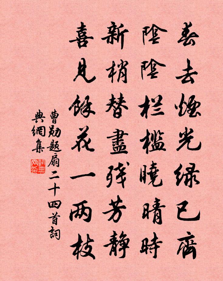 詩詞名句歷史字典書法欣賞書法字典國語詞典說文解字康熙字典古漢語字典標 題 作 者 詩 句 題扇二十四首作者:曹勛 朝代:宋代題扇二十四首原文春去煙光綠已齊,陰陰欄檻曉晴時。新梢替盡殘芳靜,喜見余花一兩枝。詩詞問答問:題扇二十四首的作者是誰?答:曹勛問:題扇二十四首寫於哪個朝代?答:宋代曹勛題扇二十四首書法欣賞題扇二十四首書法作品詩詞推薦劉十秀才見過尋以為寄次韻和酬梅堯臣〔宋代〕放言破崖岸,塵事盡磨刮。況此氣澄明,幽襟亦軒豁。竟日坐衡茅,同心異胡越。吾道今不孤,長吟為君發。曾侍郎輓詞樓鑰〔宋代〕紫陌尋春日,惟公最少年。鱣堂慙隗始,熊軾愧盧前。寄我舊猶濕,思君跡遽仙。同登今有幾,揮淚撫遺編。薦福寺送元偉耿湋〔唐代〕送客攀花後,尋僧坐竹時。明朝莫回望,青草馬行遲。梅花黃庭堅〔宋代〕障羞半面依篁竹,隨意淡妝窺野塘。飄泊風塵少滋味,一枝猶傍故人香。三段子(次韻蘇粹中寄詠筠莊)李彌遜〔宋代〕層林煙霽,巨壁天半,鴻飛無路。雲斷處、兩山之間,十萬琅玕環翠羽。轉秀谷、枕苹花汀漵。短柳疏籬向暮。看放魚李群玉〔唐代〕早覓為龍去,江湖莫漫遊。須知香餌下,觸口是銛鉤。偈頌一百三十六首釋惟一〔宋代〕三十年前,無交涉處有交涉。三十年後,有交涉處無交涉。須無交涉,飲恨難忘,含悲含笑一爐香。送丁卿季吏部赴召楊萬里〔宋代〕吾州史君五十年,不曾召節來日邊。老夫送人作太守,不曾送人上九天。玉皇去年選丁寬,遣求螺浦蘇煢鱞。玉皇玉聯環(般涉調)張先〔宋代〕南園已恨歸來晚。芳菲滿眼。春工偏上好花多,疑不向、空枝暖。惜恐紅雲易散。叢叢看遍。當時猶有蕊如梅,問失調名秦觀〔宋代〕我會從事風流府。游長安諸寺聯句。道政坊寶應寺。小小寫真聯句段成式〔唐代〕如生小小真,猶自未棲塵。 ——鄭符褕袂豐年多慶,九日示懷李适〔唐代〕爽氣肅時令,早衣聞朔鴻。重陽有佳節,具物欣年豐。皎潔暮潭色,芬敷新菊叢。芳尊滿衢室,繁吹凝煙空。惠合雲吳融〔唐代〕南北東西似客身,遠峰高鳥自為鄰。清歌一曲猶能住,莫道無心勝得人。讀後魏邦《賀狄乾傳》蘇軾〔宋代〕羊犬爭雄宇內殘,文風猶自到長安。當時枉被詩書誤,惟有鮮卑賀狄乾。東庵上方趙蕃〔宋代〕地瘠不宜行,山寒多種松。路窮千折險,庵在最高峰。石溜通泉乳,晴檐喧蜜蜂。客來僧不語,日暮自鳴鐘。送僧釋重顯〔宋代〕祖域高親日未央,家林歸去意何長。舊交不識初相見,曾振滄溟奪夜光。述懷一首(此已下自賊中竄歸鳳翔作)杜甫〔唐代〕去年潼關破,妻子隔絕久。今夏草木長,脫身得西走。麻鞋見天子,衣袖露兩肘。朝廷愍生還,親故傷老醜。涕淚宿湖甫山楊萬里〔宋代〕夜泊湖甫山,綠楊護危堤。迅雷將殘雨,似猛竟復微。曉月解風纜,熟睡初不知。起來問宿處,千山翠相圍。霽峰句黃子實〔宋代〕月穿篷席罅,風軋舵牙聲。次韻宋永兄感舊五首黃公度〔宋代〕何用咄咄愁書空,何用鼎食鳴金鐘。流行坎止隨所值,穮蓘不憂年不逢。金釵困懶海棠睡,玉斝淋漓琥珀濃。安能名句推薦青山一道同雲雨,明月何曾是兩鄉。王昌齡《送柴侍御》 誰忍窺河漢,迢迢問鬥牛。孟浩然《他鄉七夕》 不才者進,則有才之路塞。宋祁、歐陽修、范鎮、呂夏卿等《新唐書·列傳·卷四十一》 霧失樓台,月迷津渡。秦觀《踏莎行·郴州旅舍》 紫塞門孤,金河月冷,恨誰訴?朱彝尊《長亭怨慢·雁》 人世幾回傷往事,山形依舊枕寒流。劉禹錫《西塞山懷古》 善謀生者,但令長幼內外,勤修恆業,而不必富其家王永彬《圍爐夜話·第九則》 人之過誤宜恕,而在己則不可恕洪應明《菜根譚·概論》 見一葉落,而知歲之將暮劉安及其門客《淮南子·說山訓》 翠蛾輕斂意沉吟,沾襟,無人知此心。孫光憲《河傳·花落》
