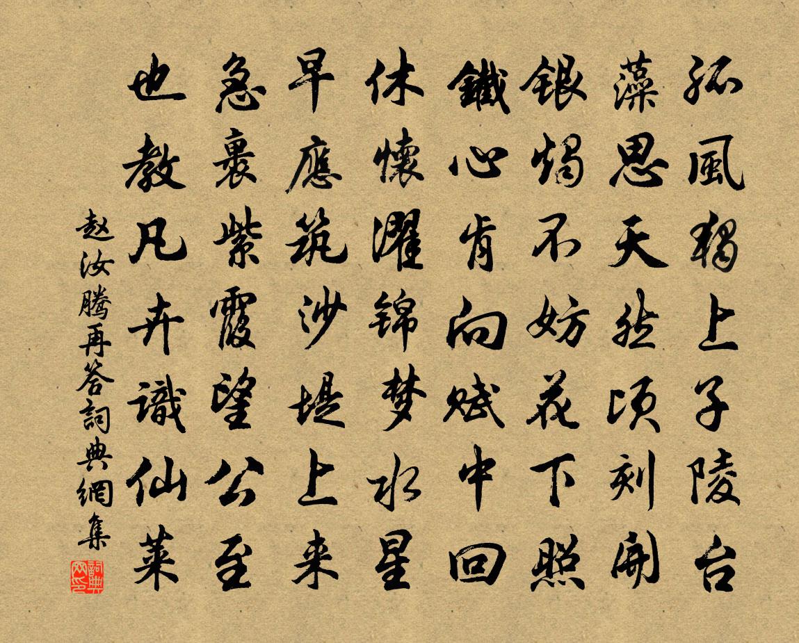 詩詞名句歷史字典書法欣賞書法字典國語詞典說文解字康熙字典古漢語字典標 題 作 者 詩 句 再答作者:趙汝騰 朝代:宋代再答原文孤風獨上子陵台,藻思天然頃刻開。銀燭不妨花下照,鐵心肯向賦中回。休懷濯錦夢水星,早應築沙堤上來。急裹紫霞望公至,也教凡卉識仙萊。詩詞問答問:再答的作者是誰?答:趙汝騰問:再答寫於哪個朝代?答:宋代趙汝騰再答書法欣賞再答書法作品詩詞推薦鷓鴣天曹勛〔宋代〕準擬中秋快客情。新亭雨後喜登臨。彩蟾特地中宵出,吹散層雲十日陰。松露重,月煙深。祥雲捧玉到天心。金波聞角嘆李廌〔宋代〕晚角吟,聲正悲。嗟爾行道遲遲兮中心有違,女心憂傷之人未歸。臨岐滿掬淚,輕埃變污泥,壯夫安爾為。日月掛西郊期滌武不至,書示韋應物〔唐代〕山高鳴過雨,澗樹落殘花。非關春不待,當由期自賒。詠水仙花五韻陳與義〔宋代〕仙人緗色裘,縞衣以裼之。青帨紛委地,獨立東風時。吹香洞庭暖,弄影清晝遲。寂寂籬落陰,亭亭與予期。誰知皇女周漢國端孝公主輓詩二首劉克莊〔宋代〕孝謹親顏悅,端嚴婦德修。鵲橋猶紀節,鸞扉忽驚秋。魯筆王姬卒,湘弦帝子愁。願言寬聖抱,已返蕊宮游。次韻李參政見謝游龍鶴山詩二首魏了翁〔宋代〕有鳥雲飛魚躍淵,聖賢見處自天懸。流陰卒卒謾空過,斯道寥寥誰適傳。人境恰逢如擇地,主賓良晤豈非天。二章送傅守歸劉宰〔宋代〕金山故佳麗,傑觀環孤峰。對峙焦公廬,林杪出疏鍾。南歸謝塵鞅,北眺足從容。應持濟州手,一酹擊楫翁。一翦梅(和人催雪)劉辰翁〔宋代〕萬事如花不可期。花不堪持。酒不堪持。江天雪意使人迷。翦一枝枝。歌一枝枝。歌者不來今幾時。姜影無詞。張和子華招潞公暑飲司馬光〔宋代〕朱門近在府園樂,杖屢過從跬步中。避暑連翩投轄宴,析酲蕭灑滿襟風。閒來高韻渾如鶴,醉里朱顏卻變童。剪燭郊廟歌辭。享太廟樂章。大成舞佚名〔唐代〕周稱王季,晉美帝文。明明盛德,穆穆齊芬。藏用四履,屈道三分。鏗鏘鍾石,載紀鴻勛。贈楊戶曹李曾伯〔宋代〕壯年遊戲寶峰傍,夢覺黃粱鬢盡霜。舊俗幾家罹變故,遠人千里嘆清揚。酆南松檟煩君訪,劍北榛蕪動客傷。賴有登謝屐亭贈謝行之葉紹翁〔宋代〕君家靈運有山癖,平生費卻幾兩屐。從人喚渠作山賊,內史風流定誰識。西窗小憩足力疲,夢賦池塘春草詩。只今憶舊遊(寄友)張炎〔宋代〕記瓊筵卜夜,錦檻移春,同惱鶯嬌。暗水流花徑,正無風院落,銀燭遲銷。鬧枝淺壓髫髻,香臉泛紅潮。甚如此游使牛子曹冠〔宋代〕晚天雨霽橫雌霓。簾卷一軒月色。紋簟坐苔茵,乘興高歌飲瓊液。翠瓜冷浸冰壺碧。茶罷風生兩腋。四座沸歡聲,句諶祜〔宋代〕月明老樹吟風鶴,露濕荒郊遍士梟。飲致用神麴酒三十韻元稹〔唐代〕七月調神麴,三春釀綠醽。雕鐫荊玉盞,烘透內丘瓶。試滴盤心露,疑添案上螢。滿尊凝止水,祝地落繁星。翻陋送錢使者三首李新〔宋代〕玉翰飛過漢江東,蜀道三年興已窮。明日登山臨水去,故國啼鳥落花空。聞今自草延英奏,合下人推長者風。燕麥柳枝詞七首張詠〔宋代〕遠映天街近繞池,長條無力自相依。上陽宮女愁方絕,又是東風有絮飛。和史魏公秋日釋寶曇〔宋代〕山淨晚餘碧,花深秋更紅。向來歌舞地,道德元沖融。委身如蒹葭,不亂魚鳥叢。客至無少長,可人斯與同。披衣題黃灣真如山般若台曹勛〔宋代〕真如山中龍象宅,前三後三率禪客。珍公提唱悟本心,一指不留庭下柏。我來春事梅已玉,仍吸靈泉酌寒碧。會看名句推薦送君歸去愁不盡,又惜空度涼風天。王昌齡《送狄宗亨》 落日熔金,暮雲合璧,人在何處。李清照《永遇樂·落日熔金》 罩向金籠好羽儀,分明喉舌似君稀僧定渚《詠鸚鵡》 正身直行,眾邪自息。劉安及其門客《淮南子·繆稱訓》 一切福田,不離方寸;從心而覓,感無不通。袁黃《了凡四訓·立命之學》 本理則國固,本亂則國危。管仲《管子·霸言》 萬事到頭都是夢,休休。明日黃花蝶也愁。蘇軾《南鄉子·重九涵輝樓呈徐君猷》 寧為百夫長,勝作一書生。楊炯《從軍行》 撩亂邊愁聽不盡,高高秋月照長城。王昌齡《從軍行七首》 微風搖紫葉,輕露拂朱房。沈約《詠芙蓉》