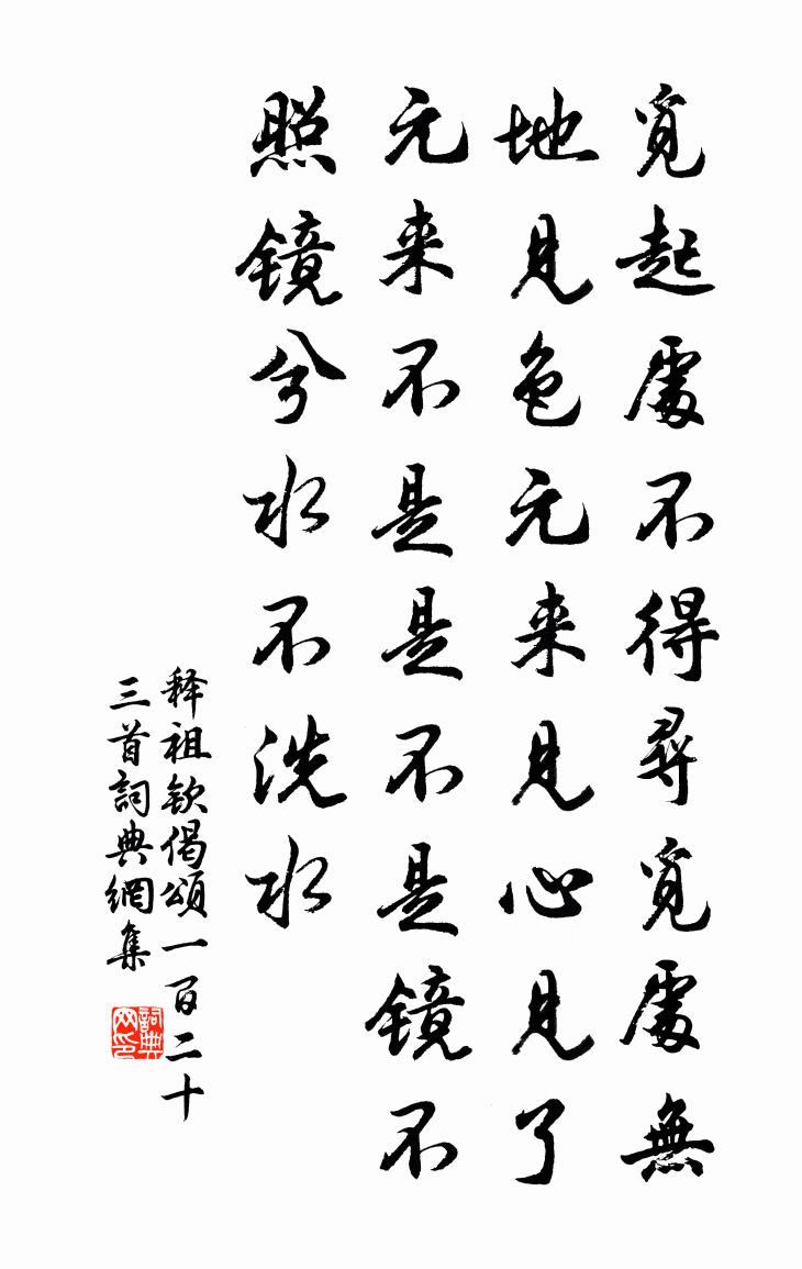 詩詞名句歷史字典書法欣賞書法字典國語詞典說文解字康熙字典古漢語字典標 題 作 者 詩 句 偈頌一百二十三首作者:釋祖欽 朝代:宋代偈頌一百二十三首原文覓起處不得,尋覓處無地。見色元來見心,見了元來不是。是不是,鏡不照鏡兮水不洗水。詩詞問答問:偈頌一百二十三首的作者是誰?答:釋祖欽問:偈頌一百二十三首寫於哪個朝代?答:宋代釋祖欽偈頌一百二十三首書法欣賞偈頌一百二十三首書法作品詩詞推薦賦得早燕送別李益〔唐代〕碧草縵如線,去來雙飛燕。長門未有春,先入班姬殿。梁空繞不息,檐寒窺欲遍。今至隨紅萼,昔還悲素扇。一別讀王德甫文卷因送省試葉適〔宋代〕瞢頭文之病,敖腳最所患。軒其奮勇果,榻復墮衰懦。伊人殆天力,卓地挺修乾。欻入岩雲幽,倏出星極爛。儼如送承甫兄往長陽山從學詩項安世〔宋代〕正月已暖春無寒,江深水淺沙觜乾。東風日日送行客,我來踏遍江之乾。昨日送客東入浙,今日送客西入灣。旁人泗州除夜雪中黃師是送酥酒二首蘇軾〔宋代〕關右土酥黃似酒,揚州雲液卻如酥。欲從元放覓拄杖,忽有麴生來坐隅。對雪不堪令飽暖,隔船應已厭歌呼。明朝悼玉溪張九成〔宋代〕聞名四十載,茲地忽相逢。每聽談前事,相看淚滿胸。干戈今偃息,詩酒曷從容。寂寞千秋恨,新阡植萬松。一日姑蘇懷古項安世〔宋代〕披山臨水結層成,仿佛當年霸主情。魚滿松江船似櫛,四連震澤稻如京。巍巍二老辭周錄,碌碌諸孫競晉盟。可但寄四侄旊二首王安石〔宋代〕一日東岡上幾回,百重雲水隔蘇台。遙知別後詩無數,黃犬歸時總寄來。神仙名義崔存〔宋代〕宿植靈根何太早,洞悟真風何年少。常令丹海飛日鳥,又使玉液朝元腦。昆台氣候四時春,紫府光陰夜如曉。來時金峨漱石亭樓鑰〔宋代〕溪聲真是廣長舌,歷劫談空聲不絕。不知來自何處山,一意傾東忘萬折。我欲漱石向水濱,無奈齒牙搖落頻。夜半感春三首張耒〔宋代〕梅梢柳眼弄春嬌,雲暖南山臘雪消。近郭樵漁成野市,遠村簫鼓隔溪橋。仆不飲久矣今日過宋嗣宗且談且飲不覺沾醉喻良能〔宋代〕年來飲酒不濡唇,蘸甲今朝始為君。頗似昌黎當日文,人皆勸我若無聞。偈六十九首釋道寧〔宋代〕金烏當午,文彩全彰。玉兔沈輝,影像俱寂。通同實際,一體無諸。不落今時,識情罔測。混融凡聖,佛眼難窺。過廣濟圩三首楊萬里〔宋代〕桑疇一眼鬱金黃,麥壟千機綠錦坊。詩卷且留燈下看,轎中只好看春光。大川和尚贊釋紹曇〔宋代〕麵皮颳得霜,脊樑生鐵鑄。活弄惡機關,真本奉化子。據南山白額落卻威,鎖冷泉清波無透路。最無端是不近人情方岩尹主課漁溪劉克莊〔宋代〕君於場屋素稱雄,非止原夫一技工。貫虱心推白社族,執牛耳屬紫薇公。烏衣子弟如康樂,絳帳先生得馬融。看得早發洛中許棠〔唐代〕半夜發清洛,不知過石橋。雲增中嶽大,樹隱上陽遙。塹黑初沉月,河明欲認潮。孤村人尚夢,無處暫停橈。龍泓洞楊蟠〔宋代〕六月千里旱,偷泉心亦卑。不煩山老祝,神物久無思。襄柑分惠景仁以詩將之韓維〔宋代〕荊州解紱十經春,迥夢青林繞漢濱。霜氣輕寒催柑實,渚波余潤作甘津。僧園采掇寧論數,客路賓士竟占新。雪意題蘭亭帖趙彥衛〔宋代〕生涯寄簡瓢,嗜古成傳癖。胸蟠萬卷書,禊帖究所出。三百七十五,異論溢編帙。更相自戈予,又類相形色。我昔送子通司法這官括蒼曹彥約〔宋代〕議禮蠲租兩有聲,老坡元不計身榮。為民受屈今誰似,有子能傳近得名。此去掾曹我暖席,是中科律定持衡。公餘名句推薦山不在高,有仙則名水不在深,有龍則靈劉禹錫《陋室銘》 江山如畫,一時多少豪傑蘇軾《念奴嬌·赤壁懷古》 天秋日正中,水碧無塵埃。柳宗元《湘口館瀟湘二水所會》 梧桐葉上,點點露珠零。尹鶚《臨江仙·深秋寒夜銀河靜》 話別情多聲欲戰,玉著痕留紅粉面。顧敻《玉樓春·拂水雙飛來去燕》 人品之不高,總為一利字看不破;學業之不進,總為一懶字丟不開。王永彬《圍爐夜話·第十六則》 相思相望不相親,天為誰春。納蘭性德《畫堂春·一生一代一雙人》 明朝事與孤煙冷,做滿湖、風雨愁人。吳文英《渡江雲三犯·西湖清明》 清娥畫扇中,春樹鬱金紅。溫庭筠《清明日》 四面邊聲連角起,千嶂里,長煙落日孤城閉。范仲淹《漁家傲·秋思》