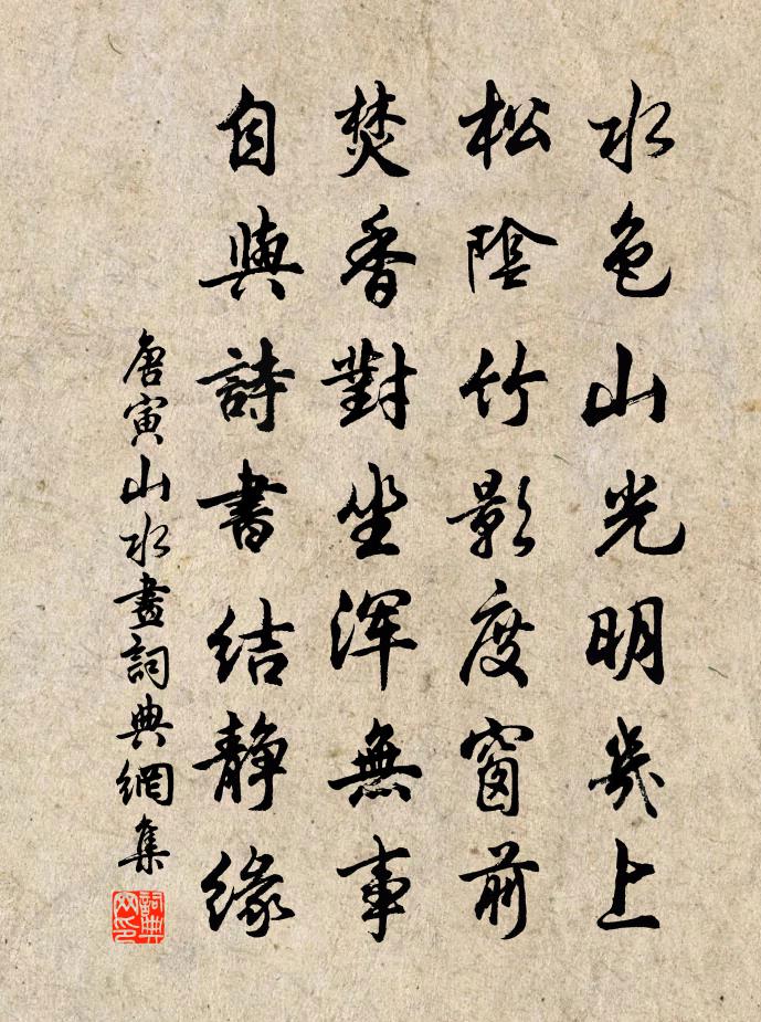 詩詞名句歷史字典書法欣賞書法字典國語詞典說文解字康熙字典古漢語字典標 題 作 者 詩 句 山水畫作者:唐寅 朝代:明代山水畫原文水色山光明几上,松陰竹影度窗前。焚香對坐渾無事,自與詩書結靜緣。詩詞問答問:山水畫的作者是誰?答:唐寅問:山水畫寫於哪個朝代?答:明代問:唐寅的名句有哪些?答:唐寅名句大全唐寅山水畫書法欣賞山水畫書法作品詩詞推薦效退之青青水中薄五首王令〔宋代〕雙只水中鳧,常在水中居。還有籠中鶩,騰軒仰不如。奉和襲美太湖詩二十首初入太湖陸龜蒙〔唐代〕東南具區雄,天水合為一。高帆大弓滿,羿射爭箭疾。時當暑雨後,氣象仍郁密。乍如開雕笯,聳翅忽飛出。行將好事近趙可〔元代〕密雪聽窗知,午醉晚來初覺。人與膽瓶梅蕊,共此時蕭索。倚窗閒看六花飛,風輕止還作。個裡有詩誰會,滿疏籬石佛葉茵〔宋代〕一段無情作有情,如來相貌十分真。不因人世皆塵土,誰識山頭不壞身。過介甫曾鞏〔宋代〕日暮驅馬去,停鑣叩君門。頗諳肺腑盡,不聞可否言。淡爾非外樂,恬然忘世喧。況值秋節應,清風盪歊煩。徘徊禪人並化主寫真求贊釋正覺〔宋代〕默而非緘,辨而罔談。須菩提慧空了了,憍屍迦華雨毿毿。更與剎塵分手眼,何妨機用見鎚鉗。個人自得,古佛同不寢二首劉克莊〔宋代〕三杯攻散愁腸易,百歲頻開笑口難。誰與南柯太守說,黃粱未熟且追歡。水龍吟(秋興)吳則禮〔宋代〕秋生澤國,無邊落木,又作蕭蕭下。澄江過雨,涼飆吹面,黃花初把。蒼鬢羈孤,粗營雞黍,濁醪催貰。對斜斜露次韻周子直四首張嵲〔宋代〕淵明門謾設,仲蔚徑才通。用世慚無術,喔詩喜有功。舊廬群盜里,北闕戰塵中。塞路多豺虎,吾生信自窮。觀華嚴閣僧齋陸游〔宋代〕拂劍當年氣吐虹,喑嗚坐覺朔庭空。早知壯志成痴絕,悔不藏名萬衲中。送徐兄封川之行劉宰〔宋代〕別時觸目是愁端,適喜君懷宇宙寬。千里事人猶見喜,寄聲別駕好相看。詠史詩易水胡曾〔唐代〕一旦秦皇馬角生,燕丹歸北送荊卿。行人慾識無窮恨,聽取東流易水聲。念彩雲(夜遊宮)賀鑄〔宋代〕流水蒼山帶廓。尋塵跡、宛然如昨。猶記黃花攜手約。誤重來,小庭花,空自落。不怨蘭情薄。可憐許、彩雲漂泊乙巳三月十五日監察御史王東溪節宿戒方回萬方回〔宋代〕淵靜濤飛亦壯哉,冷泉亭右閘初開。一時變作跳空雪,萬眾驚聞噴壑雷。老鶴遠過彭祖壽,巨杉何啻盛唐栽。吾生郊外即事七首袁燮〔宋代〕舟中無事閱陳編,千古高風挹聖賢。奔走徒勞竟何補,興懷舊隱思悽然。邊城曲戴叔倫〔唐代〕人生莫作遠行客,遠行莫戍黃沙磧。黃沙磧下八月時,霜風裂膚百草衰。塵沙晴天迷道路,河水悠悠向東去。胡笳句釋惠崇〔宋代〕繁霜衣上積,殘月馬前低。為題小靈隱修廣師法喜堂鄭獬〔宋代〕浮屠藏家多在山,飛舟跨海煩往還。不如廣師開此堂,清曠不減山中間。前有怪石天所鑱,莓苔模糊蒼鬼顏。我時出關杜牧〔唐代〕朝纓初解佐江濆,麋鹿心知自有群。漢囿獵稀慵獻賦,楚山耕早任移文。臥歸漁浦月連海,行望鳳城花隔雲。關吏西江月(叔父慶八十會作)葛勝仲〔宋代〕瑞獸香雲輕裊,華堂繡幕低垂。人生七十尚為稀。況是釣璜新歲。登俎青梅的皪,明闌紅藥芳菲。天教眉壽過期頤名句推薦眺聽良多感,徙倚獨沾襟。李密《淮陽感秋》 佳人相對泣,淚下羅衣濕。李師中《菩薩蠻·子規啼破城樓月》 思悠悠,恨悠悠,恨到歸時方始休。白居易《長相思·汴水流》 木落雁南度,北風江上寒。孟浩然《早寒江上有懷 / 早寒有懷 / 江上思歸》 酹酒蒼茫,倚歌平遠,亭上玉虹腰冷。吳文英《十二郎·垂虹橋》 驚風亂颭芙蓉水,密雨斜侵薜荔牆。柳宗元《登柳州城樓寄漳汀封連四州》 九月九日望鄉台,他席他鄉送客杯。王勃《蜀中九日 / 九日登高》 貧士之腸習黎莧,富人之口厭膏梁。程登吉《幼學瓊林·卷三·貧富》 曲終漏盡嚴具陳,月沒星稀天下旦。佚名《雞鳴歌》 京國多年情盡改,忽聽春雨憶江南。虞集《聽雨》