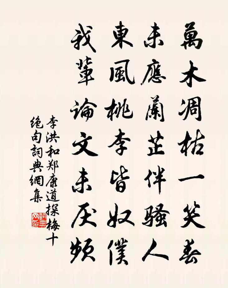 詩詞名句歷史字典書法欣賞書法字典國語詞典說文解字康熙字典古漢語字典標 題 作 者 詩 句 和鄭康道探梅十絕句作者:李洪 朝代:宋代和鄭康道探梅十絕句原文萬木凋枯一笑春,未應蘭芷伴騷人。東風桃李皆奴僕,我輩論文未厭頻。詩詞問答問:和鄭康道探梅十絕句的作者是誰?答:李洪問:和鄭康道探梅十絕句寫於哪個朝代?答:宋代李洪和鄭康道探梅十絕句書法欣賞和鄭康道探梅十絕句書法作品詩詞推薦王道士庵周文璞〔宋代〕出家才二十,小築契初心。水浸籬根冷,苔封井臼深。狖啼天慘慘,犬吠月陰陰。又踞藜床座,焚香鼓內琴。冬日書懷四首王炎〔宋代〕結茅綠陰下,四壁但圖史。時亦有好事,相過款名理。舍之學宦遊,蓬轉不自已。豈無山水音,塵埃被綠綺。幽夢送秦光祿北征李賀〔唐代〕北虜膠堪折,秋沙亂曉鼙。髯鬍頻犯塞,驕氣似橫霓。灞水樓船渡,營門細柳開。將軍馳白馬,豪彥騁雄材。箭射句諶祜〔宋代〕歸來今夕歲雲徂,且共平安酒一壺。浩劫定中逃得過,舊愁空外看來無。無題唐寅〔明代〕領解皇都第一名,猖披歸臥舊茅蘅。立錐莫笑無餘地,萬里江山筆下生。句韋奇〔宋代〕山風噓冷信,檐溜管離情。挽曾仲躬侍郎之室秦國太夫人馮氏孫應時〔宋代〕數近期頤壽,尊封大國秦。三從皆鼎食,九族盡朝紳。神劍須重合,蟠桃不再春。只令彤史載,備福更何人。天聰洞周茂良〔宋代〕一竅虛靈異穀神,達聰何事在紅塵。人間莫道無聞處,天聽從今自我民。香潭八首許月卿〔宋代〕政須洗耳聽新篇,業已扁舟學計然。潔已庶幾堪諫主,力田未必愧逢年。菑畲之業平心地,金石之交只在天。舞殿題水西周三十三壁二首陳與義〔宋代〕周子篘中早得春,喚人同渡一溪雲。貪看雨歇前峰變,不覺斟時已十分。顧養直輓詞樓鑰〔宋代〕舊向君家去,宜齋屢舉觴。人哀誦諸顧,里不見他楊。身世驚春暮,湖山愴夕陽。園林未成趣,鷗鷺亦淒涼。初寒楊萬里〔宋代〕欲雨還晴又作陰,添衣已減卻重尋。絕知不晚新寒到,更用先來破客心。傷桑梅堯臣〔宋代〕柔條初變綠,春野忽飛霜。田婦搔蓬首,冰蠶絕繭腸。名翬依麥雊,戴勝繞枝翔。不見羅敷騎,金鉤自掛牆。菩薩蠻(初夏)王齊愈〔宋代〕暑煩人困妝時午。午時初困人煩暑。新詩得酒因。因酒得詩新。縷金歌眉舉。舉眉歌金縷。人妒月圓頻。頻圓月妒西塔孫應鳳〔宋代〕憶昨慈恩登絕頂,今朝眼界更分明。飛檐高瀉銀河水,隔岸遙傳寶鐸聲。翥鳳呈輝看欲下,潯龍露角望尤勍。凌風中秋無月程珌〔宋代〕當時斗暗猶閒事,無月中秋可若何。我欲梯雲千萬丈,取光還月謝羲娥。長思仙侯善淵〔元代〕道平夷。性依稀。水火相交坎與離。陰陽自有期。用華池。浴琅肌。瑩魄兒童天外飛。靈光耀紫微。偈頌十八首釋道璨〔宋代〕臨濟處一杓,末山處半杓。玉本無暇,妄自雕琢。有年無德老睦州,無端拶折雲門腳。多景樓故址林景熙〔宋代〕灰飛百尺景愁人,斷礎殘蕪但鹿群。對峙金焦兩拳石,平分淮浙半江雲。乾坤幾沸蕭公鑊,風浪空藏郭氏墳。野衲提舉劉學士以某論守江之策未行作詩見遺謹次蘇泂〔宋代〕自是群公氣未平,黠羌何慮不休兵。欲成江左收賢俊,嘆息無人致二生。名句推薦民非谷不生。陳壽《三國志·吳書·吳主傳》 河海不擇細流,故能就其深;李斯《諫逐客書》 富貴多憂,貧窮自在。佚名《增廣賢文·上集》 以若所為,求若所欲,猶緣木而求魚也。孟子《孟子·梁惠王章句上·第八節》 乃知兵者是兇器,聖人不得已而用之。李白《戰城南》 戛戛秋蟬響似箏,聽蟬閒傍柳邊行。徐璣《秋行》 孤雲將野鶴,豈向人間住。劉長卿《送方外上人 / 送上人》 可憐報國無路,空白一分頭。楊炎正《水調歌頭·登多景樓》 記得那年花下,深夜,初識謝娘時。韋莊《荷葉杯·記得那年花下》 盤心清露如鉛水,又一夜、西風吹折。張炎《疏影·詠荷葉》