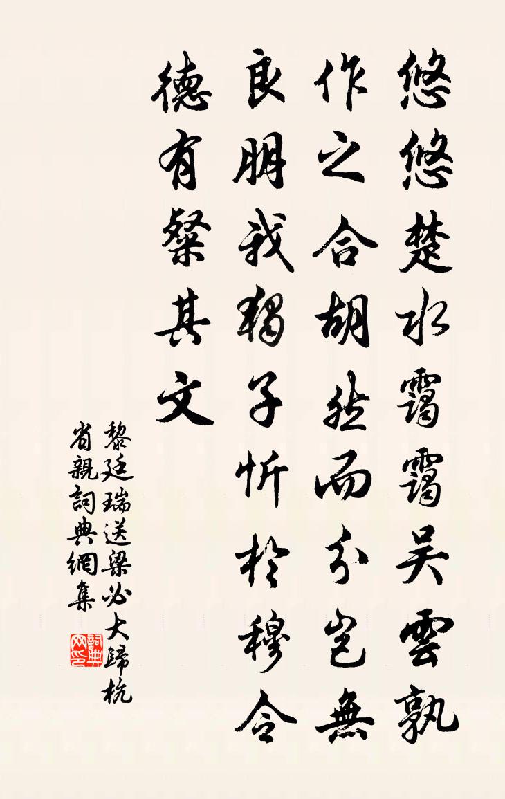 詩詞名句歷史字典書法欣賞書法字典國語詞典說文解字康熙字典古漢語字典標 題 作 者 詩 句 送梁必大歸杭省親作者:黎廷瑞 朝代:宋代送梁必大歸杭省親原文悠悠楚水,靄靄吳雲。孰作之合,胡然而分。豈無良朋,我獨子忻。於穆令德,有粲其文。詩詞問答問:送梁必大歸杭省親的作者是誰?答:黎廷瑞問:送梁必大歸杭省親寫於哪個朝代?答:宋代黎廷瑞送梁必大歸杭省親書法欣賞送梁必大歸杭省親書法作品詩詞推薦三月二日被命祈晴上天竺舟中得六絕句劉克莊〔宋代〕浪說無文字,楞伽面壁看。元來有懷挾,一世被粗瞞。論詩三十首元好問〔金代〕撼樹蚍蜉自覺狂,書生技癢愛論量。老來留得詩千首,卻被何人校短長?偈頌十七首釋智愚〔宋代〕丁寧損君德,無言真有功。任從滄海變,終不為君通。和寄小王徐子晉趙希逢〔宋代〕南溟未擊水三千,涸轍心難一息安。擬向伊吾馳馬武,並於易水吊燕丹。拳拳空自鼓齊瑟,落落真成適越冠。半世琅璫驛姚清叔〔宋代〕弄臣寧復解輸忠,偶契琅璫一語中。富貴難親貧易感,西來方憶曲江公。和子有催歸洪咨夔〔宋代〕卜廬必擇地,買鄰不論金。出機與入機,去心即來心。拗性臨川翁,罷相老境侵。霜竹鍾山寺,雅寄金玉音。強項春意(一題作春怨)孟浩然〔唐代〕佳人能畫眉,妝罷出簾帷。照水空自愛,折花將遺誰。春情多艷逸,春意倍相思。愁心極楊柳,一種亂如絲。曉登柏子岡回望金陵懷寄鍾山泉禪師賀鑄〔宋代〕晨征念王事,駑駕煩屢叱。既陟崔嵬高,稍辭叢薄密。烏牛沾宿露,白鳥明初日。清川舴艋遲,綠岸浮圖出。緬懷大雪陸游〔宋代〕大雪江南見未曾,今年方始是嚴凝。巧穿簾罅如相覓,重壓林梢欲不勝。氈幄擲盧忘夜睡,金羈立馬怯晨興。此生幽事陸游〔宋代〕幽事春來早,晨興即啟閽。掃梁迎燕子,插楥護龍孫。數日招賓友,先期辦酒尊。淋漓衣袖濕,不管漬春痕。戀梅趙時韶〔宋代〕月下敲推到夜深,情知未稱惜花心。玉兒已死雲英嫁,誰唱梅詞伴我吟。辱井王安石〔宋代〕結綺臨春草一丘,尚殘宮井戒千秋。奢淫自是前王恥,不到龍沈亦可羞。步同鄉張君垓壁韻章崇簡〔宋代〕當年杜老最風流,來往清江逸興幽。西蜀好山宣入畫,南龕佳景遠舒眸。民安暫得琴書樂,歲宴間為麋鹿游。記得漫題三首司空圖〔唐代〕亂後他鄉節,燒殘故國春。自憐垂白首,猶伴踏青人。齒落傷情久,心驚健忘頻。蝸廬經歲客,蠶市異鄉人。率怕東坡在惠州窘於衣食以重九近有樽俎蕭然之嘆趙蕃〔宋代〕四皓逃商山,下視衣褐婁。不知建成客,孰與封君酬。夷齊古逸民,食粟猶恥周。何曾墮人計,圖安卒成憂。不然山中吟洪咨夔〔宋代〕蕊珠閒居兮作七言,琴心三疊兮舞胎仙。呼汲日月下上雲煙兮,回紫抱黃入丹田。一面宗泥丸,六府主丹元。五蕤蠟梅楊萬里〔宋代〕天向梅梢別出奇,國香未許世代知。殷懃滴蠟緘封卻,偷被霜風折一枝。一雨宋祁〔宋代〕一雨初收細細涼,碧雲西畔見殘陽。歸期只覺刀頭遠,別恨偏教帶眼長。梅驛使稀誰托信,蕙盤煙冷不成香。酒泉洪駒父泛舟將過潁同張仲宗出錢席間留詩為別王銍〔宋代〕已作分攜計,尤傷送客歸。經行汝南郡,為問漢陰機。晚菊饒秋色,丹楓帶恨飛。平生無別淚,相對倍沾衣。即事示兒輩陸游〔宋代〕今歲霜遲殊未寒,籬東烏桕葉才丹。病輕漸喜免求藥,老甚難誇能據鞍。鄰舍僧貧分米少,酒坊人熟督錢寬。晚來名句推薦春愁難遣強看山,往事驚心淚欲潸。丘逢甲《春愁》 麋鹿成群,虎豹避之;飛鳥成列,鷹鷲不擊劉向《說苑·雜言》 壯年何事憔悴,華發改朱顏。蘇舜欽《水調歌頭·滄浪亭》 母別子,子別母,白日無光哭聲苦。白居易《母別子》 朱顏空自改,向年年、芳意長新。韓縝《鳳簫吟·鎖離愁》 上之為政,得下之情則治,不得下之情則亂。墨子《墨子·13章 尚同(下)》 錦江近西煙水綠,新雨山頭荔枝熟。張籍《成都曲》 耕犁千畝實千箱,力盡筋疲誰復傷?李綱《病牛》 天街曾醉美人畔,涼枝移插烏巾。吳文英《夜飛鵲·蔡司戶席上南花》 花間一壺酒,獨酌無相親。李白《月下獨酌四首·其一》