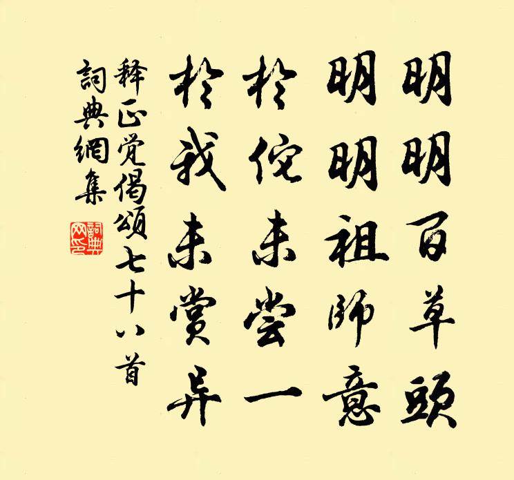 詩詞名句歷史字典書法欣賞書法字典國語詞典說文解字康熙字典古漢語字典標 題 作 者 詩 句 偈頌七十八首作者:釋正覺 朝代:宋代偈頌七十八首原文明明百草頭,明明祖師意。於佗未嘗一,於我未賞異。詩詞問答問:偈頌七十八首的作者是誰?答:釋正覺問:偈頌七十八首寫於哪個朝代?答:宋代釋正覺偈頌七十八首書法欣賞偈頌七十八首書法作品詩詞推薦承天寺李彌遜〔宋代〕宿雨洗蒼骨,峰巒發新秀。尋幽躡奇蹤,騰踏眾山囿。層林銷岩隈,空兀見危構。空高望浮黎,靜聖帶靈鷲。我來南鄉子(高等永嘉諸友相餞)陳亮〔宋代〕人物滿東甌。別我江心識俊游。北盡平蕪南似畫,中流。誰系龍驤萬斛舟。去去幾時休。猶自潮上更來頭。醉墨淋五月十日雨中飲梅堯臣〔宋代〕梅天下梅雨,綏綏如亂絲。梅生獨抱愁,四顧無與期。妻孥解我意,草草陳酒卮。檻外百竿竹,新筍高過之。竹色一日不再飯王安石〔宋代〕一日不再飯,飯已 * 眠。忽忽返照閒,頓羸不可遷。筋骸徽纆束,肺腑鼎鐺煎。長往理不惜,高堂思所牽。夢海山壁間詩不能盡記以其意追補陸游〔宋代〕春殘枕藉落花眠,正是周家定鼎年。睡起不知秦漢事,一尊閒醉華陽川。宮詞王珪〔唐代〕內庫從頭剛舞衣,一番時樣一番宜。才人物地新裝束,生色春衫畫折枝。山園四詠醒心亭姜特立〔宋代〕昔人醒心處,唯恐玉山頹。我今醒心亭,正與醉為媒。醒心非醒酒,所醒遺形骸。如病得大丹,如夢忽驚回。如闇飛鳴蘇泂〔宋代〕飛鳴一雁帶秋回,寂歷黃花傍節開。草木不逃天地役,禽魚常罹網羅災。中年衣食憂妻子,道遠舟車倦往來。未了臨江仙李之儀〔宋代〕知有閬風花解語,從來只許傳聞。光明休詠漢宮新。擁身疑有月,襯步恨無雲。莫把金樽容易勸,坐來幾度銷魂。岳陽別李十七越賓王昌齡〔唐代〕相逢楚水寒,舟在洞庭驛。具陳江波事,不異淪棄跡。杉上秋雨聲,悲切蒹葭夕。彈琴收餘響,來送千里客。平明思歸二首蘇轍〔宋代〕汝南百日留,走遍三男子。思歸非吾計,聊亦為爾耳。行裝理肩輿,客舍卷床笫。兒言世情惡,平地風波起。舟行虞美人(正宮)周邦彥〔宋代〕燈前欲去仍留戀。腸斷朱扉遠。未須紅雨洗香腮。待得薔薇花謝、便歸來。舞腰歌版閒時按。一任傍人看。金爐應梅李嶠〔唐代〕大庾斂寒光,南枝獨早芳。雪含朝暝色,風引去來香。妝面回青鏡,歌塵起畫梁。若能遙止渴,何暇泛瓊漿。次韻徐廷獻機宜送自釀石室酒范成大〔宋代〕清絕仍香如橘露,甘余小苦似松肪。官糟重濁那知此,付與街頭白面郎。雜曲歌辭涼州詞薛逢〔唐代〕昨夜蕃兵報國讎,沙州都護破涼州。黃河九曲今歸漢,塞外縱橫戰血流。詠歌聖德遠懷天寶因題關亭長句四韻杜牧〔唐代〕聖敬文思業太平,海寰天下唱歌行。秋來氣勢洪河壯,霜後精神泰華獰。廣德者強朝萬國,用賢無敵是長城。君王溪庵種蓻六言八首劉克莊〔宋代〕此翁見事常遲,八秩尚移荔枝。何曾無戴白老,會須有擘紅時。司馬季主論卜劉基〔明代〕東陵侯既廢,過司馬季主而卜焉。季主曰:“君侯何卜也?”東陵侯曰:“久臥者思起,久蟄者思啟,久懣者思嚏春晚晁公溯〔宋代〕花輸落蕊歸蜂室,風約疏簾納燕泥。見此令人思故里,山門搔首忘東西。楊白花劉奉世〔宋代〕春風吹百花,楊花飛惱人。誰家芍藥殿春後,花飛楊柳空暮春。春來復春去,春去又春來。陽阿歌白雪,落絮欲成名句推薦一味學吃虧,是處事良方。王永彬《圍爐夜話·第五四則》 小時不識月,呼作白玉盤。李白《古朗月行》 燕子斜陽來又去,如此江山。朱彝尊《賣花聲·雨花台》 枝上流鶯和淚聞,新啼痕間舊啼痕。秦觀《鷓鴣天·枝上流鶯和淚聞》 幾硯昔年游,於今成十秋。司馬光《送龔章判官之衛州·新及第》 來掃千山雪,歸留萬國花。袁枚《春風》 雁過孤峰曉,猿啼一樹霜。賈島《送天台僧》 江春不肯留歸客,草色青青送馬蹄。劉長卿《送李判官之潤州行營》 況復煩促倦,激烈思時康。杜甫《夏夜嘆》 民之從事,常於幾成而敗之。老子《老子·德經·第六十四章》
