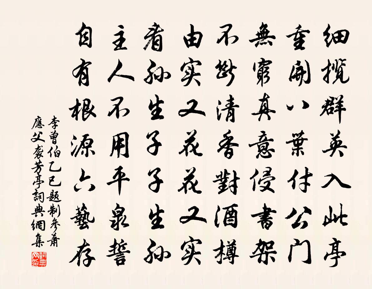 詩詞名句歷史字典書法欣賞書法字典國語詞典說文解字康熙字典古漢語字典標 題 作 者 詩 句 乙已題制參蕭應父襲芳亭作者:李曾伯 朝代:宋代乙已題制參蕭應父襲芳亭原文細攬群英入此亭,重開八葉付公門。無窮真意侵書架,不斷清香對酒樽。由實又花花又實,看孫生子子生孫。主人不用平泉誓,自有根源六藝存。詩詞問答問:乙已題制參蕭應父襲芳亭的作者是誰?答:李曾伯問:乙已題制參蕭應父襲芳亭寫於哪個朝代?答:宋代李曾伯乙已題制參蕭應父襲芳亭書法欣賞乙已題制參蕭應父襲芳亭書法作品詩詞推薦再用前韻贈高縉之三首陳造〔宋代〕晴色與春違,香紅不余漂。出郭縱遠目,草長麥齊腰。詩來慰幽獨,吮諷芬蘭椒。招月作三益,庶用娛中宵。山莊書事方岳〔宋代〕晨興抹兩屨,為口見驅迫。課童督秋刈,野獲夜彭魄。田翁適過予,繿縷黑而瘠。具言土力貧,年登苦囏阨。一飯論語絕句一百首張九成〔宋代〕豈是區區務相師,尋常一事不容欺。及階及席方皆坐,猶告之曰某在斯。白雲庵石安期〔宋代〕白雲寂寂水潺潺,雲出無心水自閒。雲水不知人換世,至今依舊滿溪山。花光十梅平地回春釋師範〔宋代〕萬木千花凍未醒,東君無處覓歸程。抬眸忽見春風面,的皪枝頭數點青。贈長安小主人李涉〔唐代〕上清真子玉童顏,花態嬌羞月思閒。仙路迷人應有術,桃源不必在深山。送方叔二首姜特立〔宋代〕管弦韻勝堪娛客,山水音清好賦詩。底事翩然欲歸去,尊前風月又相思。除夜求屠蘇鄭清之〔宋代〕椒盤為計定春前,客裹那知歲籥遷。行路間關穿履雪,薄官羞澀看囊錢。愧無黃帝屠蘇酒,試謁淵明種秫田。令尹夜興鄧深〔宋代〕官舍渾如僧舍幽,爐香靜坐興悠悠。一窗燈火鳴蛩夜,千里湖山落雁秋。只恐有詩成筆下,自餘無事到心頭。何妨一剪梅姬翼〔元代〕珠樹瑤林氣象嘉。玉龍無力,熟寢銀霞。青童旋撥貯瓊花。瑩徹冰壺,一色無瑕。寶鼎初溶火漸加。濃烹團鳳,極再用前韻袁甫〔宋代〕誠心諭俗淑斯人,莫寶金珠寶此身。昨日偶牛鄉記看,幾家教養漸興仁。和襲美女墳湖(即吳王葬女之所)陸龜蒙〔唐代〕水平波淡繞回塘,鶴殉人沉萬古傷。應是離魂雙不得,至今沙上少鴛鴦。方次雲伏枕久不入城獨宿知稼堂有懷黃公度〔宋代〕吹笛清宵何處聲,隔窗斜月聽人行。夢回案上青熒火,魂斷城頭長短更。三伏故人憐臥病,百年薄宦任浮生。春風題懶庵二首劉子翬〔宋代〕地偏賓至稀,晝靜門常掩。深房紙瓦明,宴坐薄團穩。庭花落未掃,徑草繁不剪。林泉倦出遊,況乃市朝遠。八聲甘州(題維揚摘星樓)王奕〔宋代〕問蒼天、蒼天闃無言,浩歌摘星樓。這茫茫禹跡,南來第一,是古揚州。當日雙龍未渡,風月一家秋。中分胡越後山坡羊·洛陽懷古張養浩〔元代〕天津橋上,憑欄遙望,舂陵王氣都凋喪;樹蒼蒼,水茫茫,雲台不見中興將。千古轉頭歸滅亡。功,也不久長,名望鳴皋山白雲寄洛陽盧主簿李頎〔唐代〕飲馬伊水中,白雲鳴皋上。氛氳山絕頂,行子時一望。照日龍虎姿,攢空冰雪狀。嵡嵸殊未已,崚嶒忽相向。皎皎暮到張氏園和壁間舊題黃庭堅〔宋代〕邵平不見見園瓜,三徑還尋二仲家。莫道暫來無所得,未秋先已碧蓮華。黃筌畫屏李石〔宋代〕阿筌千頃本胸中,學道分明畫手同。筆削來追麟獲後,丹青為洗馬群空。登堂欲與修遺履,空戶何由返大弓。尚有宮詞三十三首曹勛〔宋代〕溥綏聖澤浙江湄,風轉行宮赤羽旗。責己但書農本詔,乘春豈有宴遊詩。名句推薦挽弓當挽強,用箭當用長。杜甫《前出塞九首》 遙知獨聽燈前雨,轉憶同看雪後山。納蘭性德《於中好·送梁汾南還為題小影》 畫閣朱樓盡相望,紅桃綠柳垂檐向。王維《洛陽女兒行》 逍遙以針勞,談笑以藥倦劉勰《文心雕龍·養氣》 垂柳覆金堤,蘼蕪葉復齊。薛道衡《昔昔鹽》 池花春映日,窗竹夜鳴秋。李白《謝公亭·蓋謝朓范雲之所游》 孤雁不飲啄,飛鳴聲念群。杜甫《孤雁 / 後飛雁》 花自飄零水自流。一種相思,兩處閒愁。李清照《一剪梅·紅藕香殘玉簟秋》 綠楊芳草長亭路。年少拋人容易去。晏殊《玉樓春·春恨》 三春白雪歸青冢,萬里黃河繞黑山。柳中庸《征人怨 / 征怨》