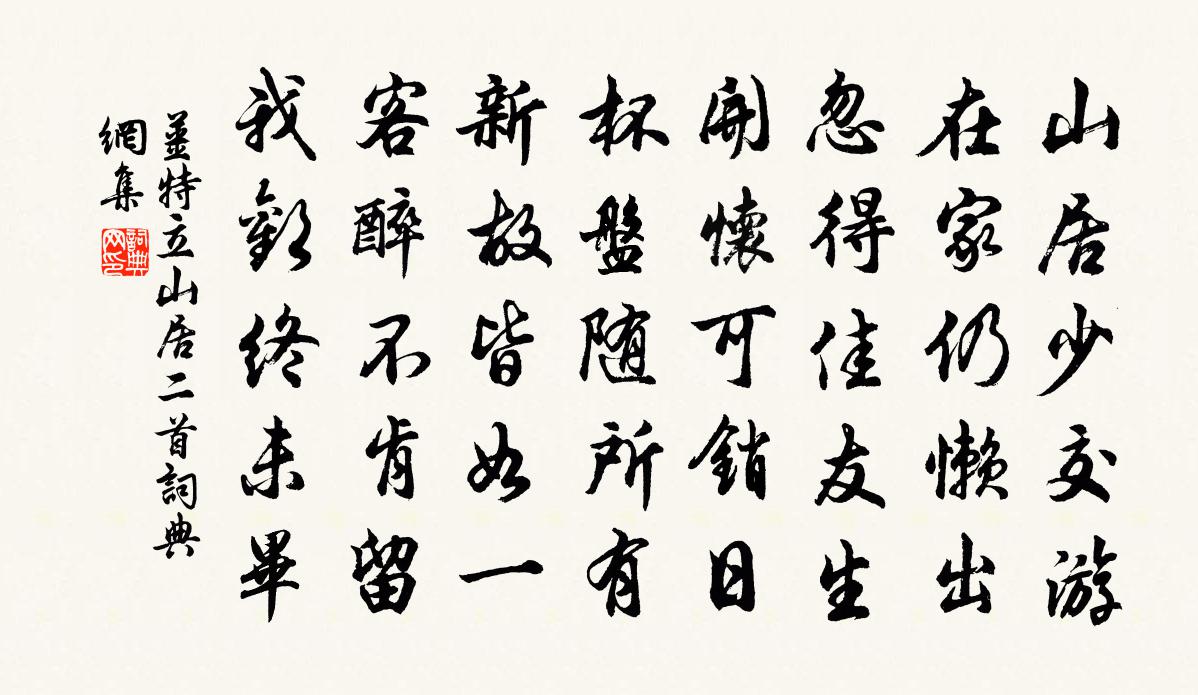 詩詞名句歷史字典書法欣賞書法字典國語詞典說文解字康熙字典古漢語字典標 題 作 者 詩 句 山居二首作者:姜特立 朝代:宋代山居二首原文山居少交遊,在家仍懶出。忽得佳友生,開懷可銷日。杯盤隨所有,新故皆如一。客醉不肯留,我歡終未畢。詩詞問答問:山居二首的作者是誰?答:姜特立問:山居二首寫於哪個朝代?答:宋代姜特立山居二首書法欣賞山居二首書法作品詩詞推薦和慎思初入試院蔡肇〔宋代〕午門錀入斷人行,禁漏稀微出邇英。齊拜勅書期老仗,並驅騶御出西城。諠嘩燈火看如夢,關鎖官曹只寄聲。聊付書懷陸游〔宋代〕濯錦江頭成昨夢,紫芝山下又新年。久因多病疏雲液,近為長齋進玉延。啼鳥傍檐春寂寂,飛花掠水晚翩翩。支離和耕甫弟梅杜范〔宋代〕數點冰葩與雪宜,有人著眼水邊籬。從渠疎影初傳句,自此清吟未有詩。曾到孤山飛鶴處,恰思偃樹跨鯨時。李園虎丘葉茵〔宋代〕心境空時喜地偏,杖藜來勘點頭禪。重門鎖住海心石,一劍截開冰底天。誰記珣珉曾院宇,尚傳吳越共山川。闌風留題郡樓寇準〔宋代〕千里關河一望間,登臨長到夕陽還。欲驅征旆歸朝去,更倚高樓看暮山。武寧茶提舉相台鄭君思恭之萱堂太夫人馮氏大方回〔宋代〕孝子不願為高官,履危未必親心安。孝之不願食厚祿,移此祿為親之福。親家堂上太夫人,九九之算饒五春。令郎晚春張耒〔宋代〕積雨桃李暗,西園已晚春。平池花照影,深樹鳥窺人。飛近燕知主,青分柳過鄰。浮生似群動,聊復共欣欣。挽大溪姚祥叔即南戴復古〔宋代〕慶門今獨盛,舊族有光華。日坐不欺至,天興積善家。山林娛晚境,書史是生涯。手種堂前桂,君看身後花。江樓有感趙嘏〔唐代〕獨上江樓思悄然,月光如水水如天。同來玩月人何在,風景依稀似去年。集賢賓 鳴鶴餘音卷一王哲〔元代〕仔細曾窮究。想六地眾生,強攬閒愁。恰才得食飽,又思量、駿馬輕裘。有駿馬,有輕裘。又思量、建節封侯。假寒食行張嵲〔宋代〕寒食由來古今重,四海人人作丘壠。兩京道上松柏多,儘是王公大家冢。伊莫年年當此時,鈿車寶馬相追隨。紛紛海棠二首任希夷〔宋代〕山碧花尤好,徑長人自閒。錦圍春照耀,紅雨暮闌斑。壬子歲送方叔姜特立〔宋代〕經年懷抱幾曾開,面上康衢一寸埃。已向西偏營小築,高懸一榻待公來。叔度賢良再用游字韻見貽複次韻謝之喻良能〔宋代〕夕郎分閫鎮東秋,幕下揮毫秦少游。一代風流今不泯,百年文物尚堪求。交情莫逆人誰似,吟事方殷歲又遒。他日瑞鷓鴣王哲〔元代〕今朝細細問朱郎。因甚常眠黑鬼房。得與青龍為伴侶,亦令 * 助清涼。便將鉛汞堪成寶,好把刀圭更入鋼。斫斷閩中歲暮懷吳中釋文珦〔宋代〕冉冉年光盡,淒淒客思驚。疎狂輕萬事,行役負平生。海月移松影,山風壯瀑聲。寒宵頻作夢,曾不離吳城。和方泰州見寄徐鉉〔唐代〕逐客淒淒重入京,舊愁新恨兩難勝。雲收楚塞千山雪,風結秦淮一尺冰。置醴筵空情豈盡,投湘文就思如凝。更殘皇風杜牧〔唐代〕仁聖天子神且武,內興文教外披攘。以德化人漢文帝,側身修道周宣王。迒蹊巢穴盡窒塞,禮樂刑政皆弛張。何當寄兄呂希純〔宋代〕江南江北來,昨夜同枝宿。平明一聲起,回顧已極目。黃匏城陳岩〔宋代〕草色濃於野燒煙,春風吹面午陰天。長江搖盪遊人眼,興在悠悠一雁邊。名句推薦春日載陽,有鳴倉庚。佚名《七月》 何時一樽酒,重與細論文。杜甫《春日憶李白》 女蘿發馨香,菟絲斷人腸。李白《古意》 梅花雪,梨花月,總相思。張惠言《相見歡·年年負卻花期》 改章難於造篇,易字艱於代句劉勰《文心雕龍·附會》 春風知別苦,不遣柳條青。李白《勞勞亭》 黃鳥翩翩楊柳垂,春風送客使人悲。高適《東平別前衛縣李寀少府 / 送前衛縣李宷少府》 多情卻似總無情,唯覺樽前笑不成。杜牧《贈別》 黃雲萬里動風色,白波九道流雪山。李白《廬山謠寄盧侍御虛舟》 野店桃花紅粉姿,陌頭楊柳綠菸絲。趙孟頫《東城》