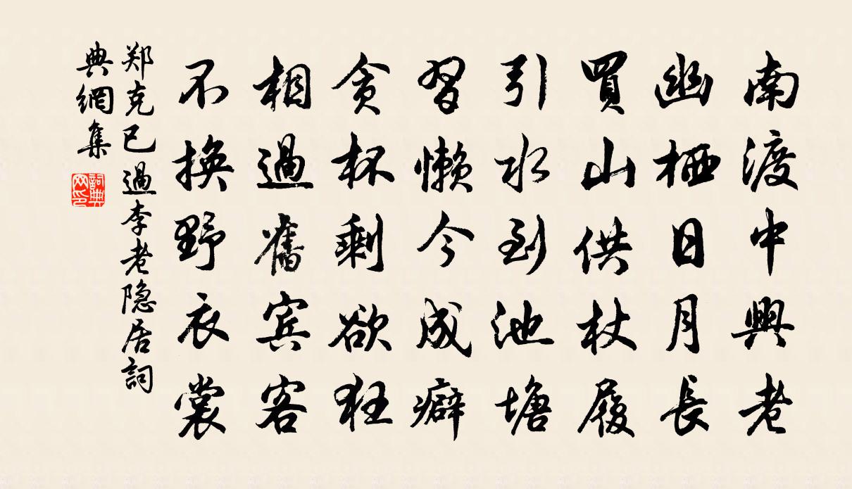 詩詞名句歷史字典書法欣賞書法字典國語詞典說文解字康熙字典古漢語字典標 題 作 者 詩 句 過李老隱居作者:鄭克已 朝代:宋代過李老隱居原文南渡中興老,幽棲日月長。買山供杖履,引水到池塘。習懶今成癖,貪杯剩欲狂。相過舊賓客,不換野衣裳。詩詞問答問:過李老隱居的作者是誰?答:鄭克已問:過李老隱居寫於哪個朝代?答:宋代鄭克已過李老隱居書法欣賞過李老隱居書法作品詩詞推薦和李商隱賦紅梅王洋〔宋代〕公主檐間睡起時,勻紅行繞大安池。北人未識春迷眼,妃子偏憐酒入肌。更若施朱疑太赤,不鬚生女白如脂。由來棋聲黃庚〔宋代〕何處仙翁愛手談。時聞剝啄竹林間。一枰子玉敲雲碎,幾度午窗驚夢殘。緩著應知心路遠,急圍不放耳根閒。爛柯枕上聞蛩有感舒岳祥〔宋代〕桑鳥催耕緣底事,草蟲促織竟何成。春風秋月祗垂淚,北斗南箕空得名。有客悲歌持築擊,何時至治以韶鳴。吾儕雞叫朱元璋〔明代〕一叫一勾勾,兩叫兩勾勾,三叫日出滿天紅,驅散殘星月朦朧。賈師憲望海樓成次韻陳宜中〔宋代〕名與山高千古重,恩如海闊一身輕。門下少年初幕府,夢隨諸吏上崢嶸。弋陽道中晁補之〔宋代〕千日千程不厭行,一丘一壑可鄰生。常憂束縛名韁死,聞健尋山卻稱情。朝中措蕭崱〔宋代〕半山社雨欲黃昏。燕子不過門。楊柳染深綠意,海棠啼損紅痕。綺寮妝束,寶釵歌舞,玉枕溫存。一段舊情有味,晚宿江漲橋李新〔宋代〕鳥徑青山外,人家苦竹邊。江城懸夜鎖,魚市散空船。岸靜涵秋月,林昏宿水煙。又尋僧榻臥,夜冷欲無眠。王大卿輓詩姜特立〔宋代〕少年登雁塔,晚歲列鵷行。賈傅心憂漢,宣公疏奏唐。細氈親沃日,白簡舊凝霜。才大施猶狹,清名玉雪揚。郊廟歌辭。享太廟樂章。肅和魏徵〔唐代〕大哉至德,允茲明聖。格於上下,聿遵誠敬。嘉樂斯登,鳴球以詠。神其降止,式隆景命。香閨十詠紫香囊張玉孃〔宋代〕珍重天孫剪紫霞,沉香羞認舊敏華。紉蘭獨抱靈均操,不帶春風兒女花。佛頭圓相贊釋慧開〔宋代〕生怕雲門打殺伊,韜光晦跡許多時。而今再出頭來也,天上人間更是誰。春日郊外李若水〔宋代〕毿毿官柳綠藏鴉,傍郭人煙三五家。見說今年寒食好,踏青歸路看梨花。題碧落洞高衛〔宋代〕翠竇連空跂可攀,飛仙時下五雲端。公車不暇頻游此,今日才來可謂難。登宛陵條風樓寄竇常侍羅隱〔唐代〕亂罹時節懶登臨,試借條風半日吟。只有遠山含暖律,不知高閣動歸心。溪喧晚棹千聲浪,雲護寒郊數丈陰。自笑往行都至嚴州烏駐館阻水留二日陳宓〔宋代〕村館通宵冷,江鄉五月秋。野梅酸味足,隴麥餌香浮。水滿迷行徑,瀾揚遏去舟。亨衢如可待,莫厭小淹留。與零陵周倅子鎔劉克莊〔宋代〕滿目山河異,南冠十六期。胡羝無乳日,遼鶴有歸時。詗虜幾齏粉,還朝不磷緇。漢家重名節,郎秩未為卑。又次鄭性之懸尉韻樓鑰〔宋代〕閔雨才寬又畏風,從朝愁到夕陽舂。誰教官到二千石,不學當年邴曼容。挽曾東軒二首王夢應〔宋代〕健筆千夫畏,長才四海空。飛騰須掌制,危急逐乘驄。國事箋天疏,臣心救日弓。故人牛斗上,相見氣如虹。憶留紫元古意二首白玉蟾〔宋代〕為山莫太高,太高常苦寒。恩愛莫太深,太深別離難。黃鶴今何之,白雲不復還。暗想紫仙堂,月照雙飛鸞。名句推薦獨上江樓思渺然,月光如水水如天。趙嘏《江樓舊感》 亭皋木葉下,隴首秋雲飛柳惲《搗衣詩》 中心愿,平虜保民安國。宋江《滿江紅·喜遇重陽》 講大經綸,只是實實落落;有真學問,決不怪怪奇奇。王永彬《圍爐夜話·第三一則》 一年春又盡,倚杖對斜暉。左緯《春晚》 譬猶使人負劍,而求其壽也。墨子《墨子·25章 節葬(下)》 美人結長想,對此心悽然。李白《折楊柳》 離心何以贈,自有玉壺冰。駱賓王《送別》 分明久旱逢甘雨,賽過他鄉遇故知。馮夢龍《醒世恆言·卷二十》 耐寒唯有東籬菊,金粟初開曉更清。白居易《詠菊》