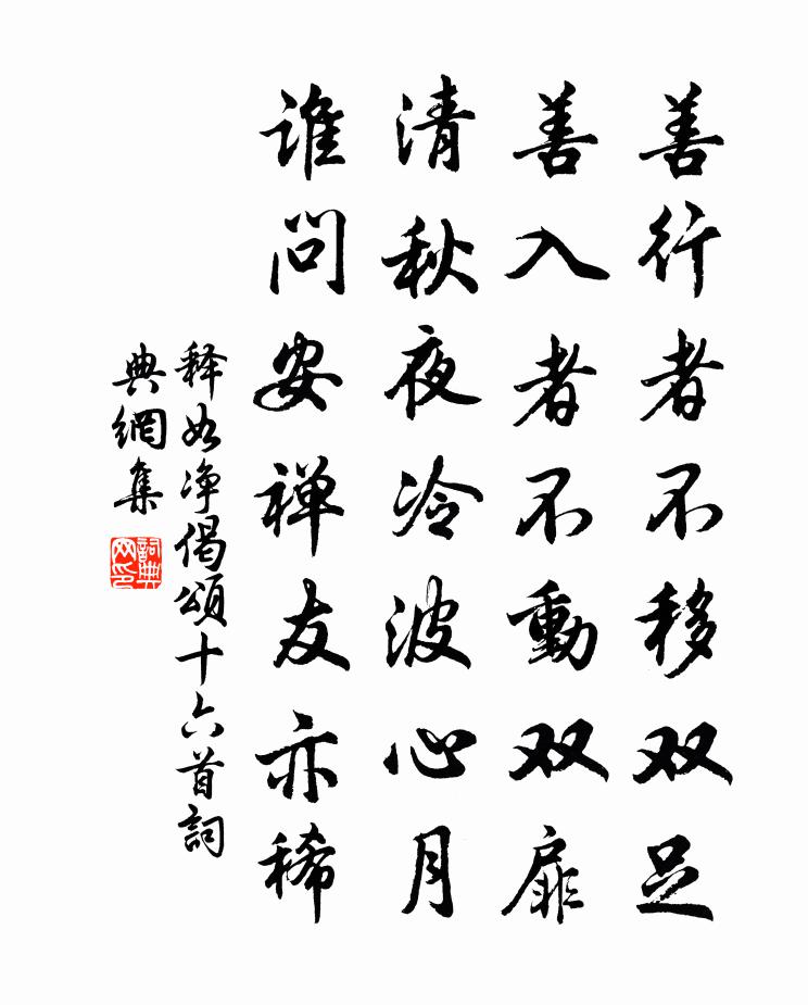 詩詞名句歷史字典書法欣賞書法字典國語詞典說文解字康熙字典古漢語字典標 題 作 者 詩 句 偈頌十六首作者:釋如淨 朝代:宋代偈頌十六首原文善行者不移雙足,善入者不動雙扉。清秋夜冷波心月,誰問安禪友亦稀。詩詞問答問:偈頌十六首的作者是誰?答:釋如淨問:偈頌十六首寫於哪個朝代?答:宋代釋如淨偈頌十六首書法欣賞偈頌十六首書法作品詩詞推薦和徐夢發題超覽亭鄭士懿〔宋代〕幾年江海客,復此預筵賓。地勝山川別,天晴草樹機關報。高歌千佛駭,一笑萬家春。珍重梁間扁,時時為掃塵。端嘉雜詩二十首劉克莊〔宋代〕勢窮斯變變斯通,局面初更便不同。西北怕他小老子,東南有個太平翁。六州歌頭劉過〔宋代〕鎮長淮,一都會,古揚州。昇平日,珠簾十里春風、小紅樓。誰知艱難去,邊塵暗,胡馬擾,笙歌散,衣冠渡,使謝趙昌父寄詩陳宓〔宋代〕先生心事本韜藏,無奈詩名宇宙香。古柏乾隆宜壑臥,野梅心苦不羹嘗。百年忽遇中興主,九帙猶煩告老章。歲晚崇恩顯義院五首宋高宗〔宋代〕管妙弦清韻入神,老人合眼醉醺醺。成知不及當來曲,猶覺聞時勝不聞。送安同知赴闕五首魏了翁〔宋代〕未須多買酇侯田,且可同乘曲逆舡。昨夜皛山雲作雨,東流一水徑通天。八景勝概藥壺閃影方鳳〔宋代〕紫車貯藥壺,日夕發光怪。不道洞府深,翻嫌八荒隘。次韻子由使契丹至涿州見寄四首蘇軾〔宋代〕老人痴鈍已逃寒,子復辭行理亦難。要到盧龍看古塞,投文易水吊燕丹。(余昔年辭免使北。)胡羊代馬得安眠,廬陵別朱觀先輩徐鉉〔唐代〕桂籍知名有幾人,翻飛相續上青雲。解憐才子寧唯我,遠作卑官尚見君。嶺外獨持嚴助節,宮中誰薦長卿文。新詩曇智禪師院韋應物〔唐代〕高年不復出,門徑眾草生。時夏方新雨,果藥發餘榮。疏澹下林景,流暮幽禽情。身名兩俱遣,獨此野寺行。送仲和師歸雪竇兼簡穎禪師梅堯臣〔宋代〕野缽歸松下,將親聞道師。風沙不堪寄,霜笴自相宜。西江月佚名〔宋代〕九曲江頭逆浪,霎時衛過天心。崑崙頂上水澄澄。醞就瓊漿自飲。便向此時採取,河車搬運無停。陰陽一炁自浮沈再賦陳與義〔宋代〕興公賦天台,千字一何少。峴山逢巧匠,籠絡六詩了。余情到娘子,心動雲縹緲。仿佛山阿人,薜荔一身繞。殷勤好事近·花底一聲鶯劉翰〔宋代〕花底一聲鶯,花上半鉤斜月。月落烏啼何處,點飛英如雪。東風吹盡去年愁,解放丁香結。驚動小亭紅雨,舞雙雙歸自明遠醉中作杜范〔宋代〕觴豆論交今豈無,肺肝相與古來少。我今宦遊雙溪上,一見為僚盡傾倒。吏塵終日何沒沒,休汗有盟方皦皦。點檢九吟詩飛玉吳昌裔〔宋代〕誰擘岩扉石竇開,中流玉水潄蒼苔。有時卷雪從天下,端是源頭蓄得來。玉漏遲(夏)劉子寰〔宋代〕翠草侵園徑。陰陰夏木,鳴鳩相應。縱目江天,窈窈雨昏煙暝。屋角黃梅乍熟,聽落顆、時敲金井。深院靜。閒階送張公儀宰安豐王安石〔宋代〕楚客來時雁為伴,歸期只待春冰泮。雁飛南北三兩回,回首湖山空夢亂。秘書一官聊 * ,安豐百里誰復嘆。揚鞭贈道士王介潘閬〔宋代〕頭冠星斗光,七十鬢不蒼。篋有化金方,詩無入俗章。舉步雲霞輕,出語芝術香。約我游羅浮,絕頂天風涼。又五首邵雍〔宋代〕萬物道為樞,其來類自殊。性雖無厚薄,理亦有精麄。未若人為盛,還知物有餘。我生於此日,倖免作庸夫。名句推薦風前欲勸春光住。春在城南芳草路。辛棄疾《玉樓春·風前欲勸春光住》 飛雪帶春風,裴回亂繞空。劉方平《春雪》 觀棋不語真君子,把酒多言是小人。馮夢龍《醒世恆言·卷九》 獨自上層樓,樓外青山遠。程垓《卜運算元·獨自上層樓》 昨夜吳中雪,子猷佳興發。李白《答王十二寒夜獨酌有懷》 能行之者未必能言,能言之者未必能行。司馬遷《史記·孫子吳起列傳》 不吹毛而求小疵,不洗垢而察難知。韓非及後人《韓非子·大體》 遠書歸夢兩悠悠,只有空床敵素秋。李商隱《端居》 堪怨王孫,不記歸期早。梅堯臣《蘇幕遮·草》 春日載陽,有鳴倉庚。佚名《七月》