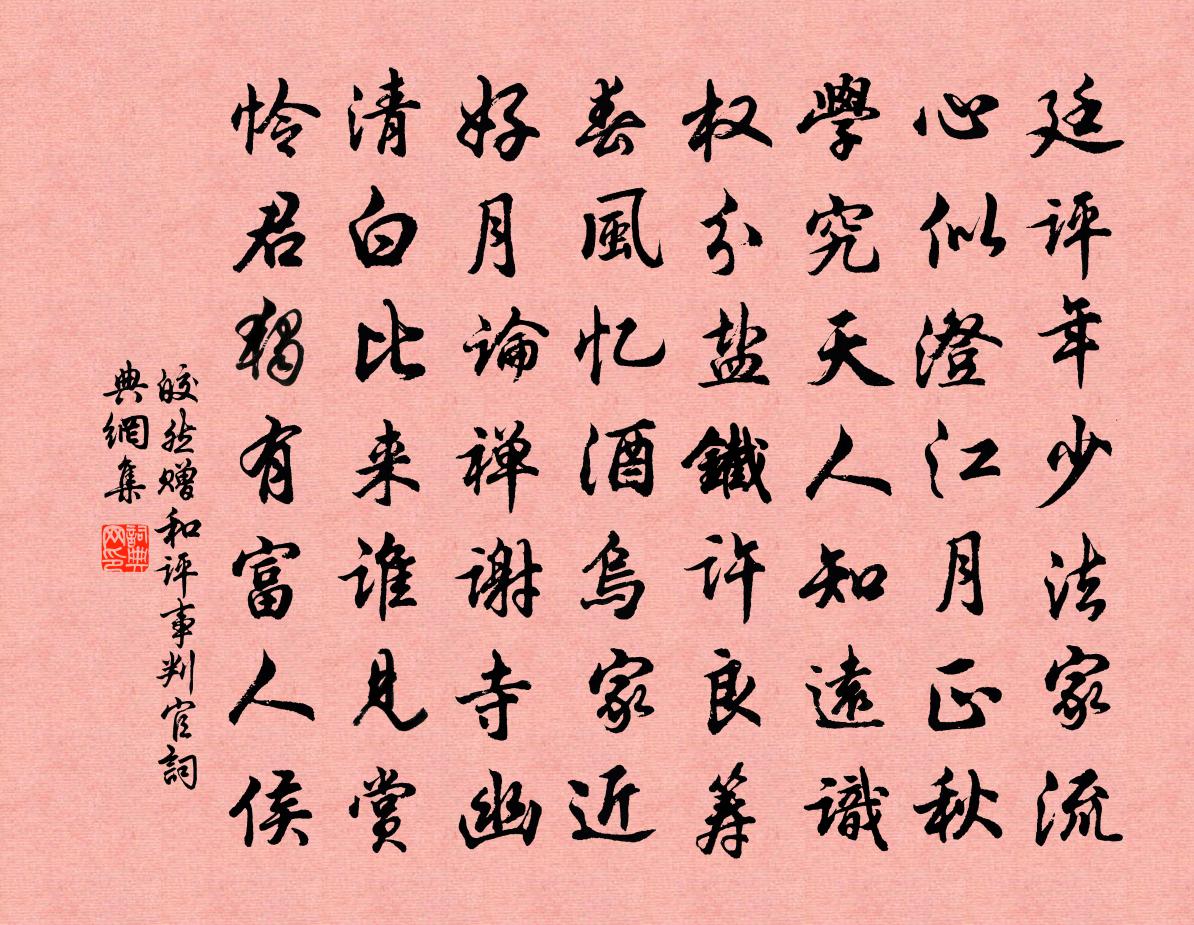 詩詞名句歷史字典書法欣賞書法字典國語詞典說文解字康熙字典古漢語字典標 題 作 者 詩 句 贈和評事判官作者:皎然 朝代:唐代贈和評事判官原文廷評年少法家流,心似澄江月正秋。學究天人知遠識,權分鹽鐵許良籌。春風憶酒烏家近,好月論禪謝寺幽。清白比來誰見賞,憐君獨有富人侯。詩詞問答問:贈和評事判官的作者是誰?答:皎然問:贈和評事判官寫於哪個朝代?答:唐代問:贈和評事判官是什麼體裁?答:七律皎然贈和評事判官書法欣賞贈和評事判官書法作品注釋全唐詩:卷816-47詩詞推薦賀新郎(姑蘇台觀雪)盧祖皋〔宋代〕十頃涵空碧。畫圖中、崢嶸幻玉,亂零吹璧。倚遍危闌吟不盡,把酒風前岸幘。記當日、西湖為客。誰翦吳淞江上廣德早行潘希白〔宋代〕草屨穿籬過,衣濕槿花露。千里浙東人,今踏江南路。曉程猶帶夜,眾星照高樹。家中猶未醒,夢我青雲去。林間釋行海〔宋代〕林間隨分樂清朝,長愛菖蒲對寂寥。客到每嫌聞夜雨,窗前不要種芭蕉。花時對雪張舜民〔宋代〕急霰飄零際,群芳爛熳中。半開先逐水,未落已隨風。兵渡金陵破,塵來繡嶺空。誰能勞樽酒,暫使客顏紅。鶯張明中〔宋代〕柳接飛來影,花翻過後枝。金衣搖日色,簧口弄晴絲。遊子錯回首,何人澀小詞。楊園好風景,莫與負佳期。奉贈蕭二十使君杜甫〔唐代〕昔在嚴公幕,俱為蜀使臣。艱危參大府,前後間清塵。起草鳴先路,乘槎動要津。王鳧聊暫出,蕭雉只相馴。終始長安縣後亭看畫王建〔唐代〕水凍橫橋雪滿池,新排石筍繞巴籬。縣門斜掩無人吏,看畫雙飛白鷺鷥。驀山溪佚名〔宋代〕填河鵲喜,巧夕來時候。深院瑞煙濃,隱隱聽、梨園清奏。蘭車玉佩,飛下蕊宮仙,春鬢綠,醉顏紅,不減年時舊送人赴試陳造〔宋代〕之子是荊璞,溫純仍琢磨。諸公推大手,壯歲合賢科。豹霧三年隱,龍門一躍過。得詩應 * ,老子閱人多。嘉泰二年恭上太皇太后尊號八首佚名〔宋代〕蕩蕩天門,金鋪玉戶。采旄翠旌,流蘇葆羽。千官影從,迺導迺輔。都人從親,填道呼舞。依韻和梅聖俞從登東樓三首王珪〔唐代〕雲日暉暉下碧山,誰從滄海宴初還。香車轤轆紅塵里,紫闕岧嶢瑞氣間。午夜笙歌移法曲,滿城桃李門朱顏。金吾題人畫扇十首曹勛〔宋代〕長沙筆墨妙山林,植立如聽嘯月音。岸槲不妨俱遂性,一溪閒與照清深。西湖清明張蘊〔宋代〕芳天新霽惠風和,軟錄平堤凝不波。桃李無言看客慣,樓台如畫占山多。游裾匝路填車馬,翠榜開延斗綺羅。寂寂頌證道歌證道歌釋印肅〔宋代〕亦無人,亦無佛,廣大樓台彌勒宅。豁開門戶接群生,一念無心全用得。關山月汪元量〔宋代〕關山月,關山月,東邊來,西邊沒。夜夜照關山,□□多戰骨。男兒莫去學弓刀,女兒莫嫁關山□。□□母啼送爺雨陸游〔宋代〕家近蓬萊白玉京,草堂登望不勝清。初驚野色昏昏至,已見波紋細細生。殘醉頓消迎亂點,微吟漸苦入寒聲。只愁賢者之孝二百四十首狄仁傑林同〔宋代〕狄和使絕域,柳甘易播州。為憐劉母在,深恐鄭親憂。舟行 江州路上作。白居易〔唐代〕帆影日漸高,閒眠猶未起。起問鼓枻人,已行三十里。船頭有行灶,炊稻烹紅鯉。飽食起婆娑,盥漱秋江水。平生賀新涼(寄兩吳尚書)方岳〔宋代〕雁向愁邊落。渺汀洲、孤雲細雨,暮天寒角。有美人兮山翠外,誰共霜橋月壑。想朋友、春猿秋鶴。竹屋一燈棋未和徐常丞洪秘監倡和四首劉克莊〔宋代〕孤忠鬱積未全輸,臧氏其如命世儒。歸治隱棲秦系裡,去留遺愛葛仙湖。一辭吾已抽身退,什襲公非待價沽。大手名句推薦山從人面起,雲傍馬頭生。李白《送友人入蜀》 盡人事以聽天命。李汝珍《鏡花緣·第六回》 身未升騰思退步,功成應憶去時言。只因先主丁寧後,星落秋風五丈原。羅貫中《三國演義·第三十八回》 禍之所由生也,生自纖纖也。荀子《荀子·大略》 寄言儔侶,莫負廣寒沈醉。文徵明《念奴嬌·中秋對月》 質勝文則野,文勝質則史。文質彬彬,然後君子。孔子弟子《論語·雍也篇》 一日官軍收海服,驅牛駕車食牛肉,歸來攸得牛兩角。元稹《田家詞 / 田家行》 驚起卻回頭,有恨無人省。蘇軾《卜運算元·黃州定慧院寓居作》 知有兒童挑促織,夜深籬落一燈明。葉紹翁《夜書所見》 糝徑楊花鋪白氈,點溪荷葉疊青錢。杜甫《絕句漫興九首·其七》