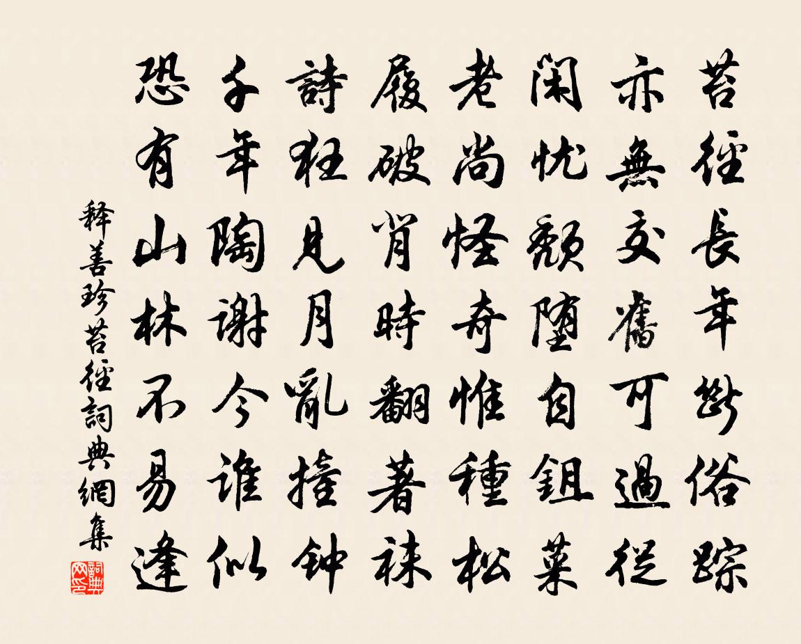 詩詞名句歷史字典書法欣賞書法字典國語詞典說文解字康熙字典古漢語字典標 題 作 者 詩 句 苔徑作者:釋善珍 朝代:宋代苔徑原文苔徑長年斷俗蹤,亦無交舊可過從。閒憂頹墮自鉏菜,老尚怪奇惟種松。履破背時翻著襪,詩狂見月亂撞鐘。千年陶謝今誰似,恐有山林不易逢。詩詞問答問:苔徑的作者是誰?答:釋善珍問:苔徑寫於哪個朝代?答:宋代釋善珍苔徑書法欣賞苔徑書法作品詩詞推薦謁吳傳正因贈孔武仲〔宋代〕宴坐足觀妙,朝歸還閉門。身居丞相第,室似人孤園。競逐浮雲駛,難揩古鏡昏。相期荷君厚,商榷有清言。登思禪寺上方題修竹茂松劉長卿〔唐代〕上方幽且暮,台殿隱蒙籠。遠磬秋山里,清猿古木中。眾溪連竹路,諸嶺共松風。儻許棲林下,甘成白首翁。岳陽樓陶夢桂〔宋代〕朱欄獨倚晚天晴,喚起江湖萬里情。風撼君山波浩蕩,雲歸衡岳月分明。飄飄杜老乘槎興,杳杳軒皇奏樂聲。好把詠懷張籍〔唐代〕老去多悲事,非唯見二毛。眼昏書字大,耳重覺聲高。望月偏增思,尋山易發勞。都無作官意,賴得在閒曹。逢人韓元吉〔宋代〕逢人似相識,初不辨名字。折腰致寒暄,但道久暌異。歸來省眉目,彷佛猶夢寐。自非知心交,君輩定難記。將無甲子日無雨偶成吳芾〔宋代〕連歲人懷水潦憂,年登猶嘆不全收。夏逢甲子天無雨,預喜今年又有秋。讀詔書石介〔宋代〕關中有山生虎狼,虎狼性{左虎右武}不可當。去歲食人十有一,無辜被此惡物傷。守臣具事奏聖帝,聖帝讀之惻慈恩寺貽楚霄上人曹松〔唐代〕在秦生楚思,波浪接禪關。塔礙高林鳥,窗開白日山。樹陰移草上,岸色透庭間。入內談經徹,空攜講疏還。上郡南三十里有相思亭在太山之麓二水所交平司馬光〔宋代〕塞下春寒在,東風雪滿須。河陽機上婦,知我苦辛玩。句馮載〔宋代〕荊軻一去不復返,易水東流無盡期。經廢宮棲白〔唐代〕終日河聲咽暮空,煙愁此地晝濛濛。錦帆東去沙侵苑,玉輦西來樹滿宮。魯客望津天欲雪,朔鴻離岸葦生風。那堪哨遍(春詞)蘇軾〔宋代〕睡起畫堂,銀蒜押簾,珠幕雲垂地。初雨歇,洗出碧羅天,正溶溶養花天氣。一霎暖風回芳草,榮光浮動,掩皺銀閨情(一作夜閨)韓偓〔唐代〕輕風滴礫動簾鉤,宿酒猶酣懶卸頭。但覺夜深花有露,不知人靜月當樓。何郎燭暗誰能詠,韓壽香焦亦任偷。敲折點絳唇·訪牟存叟南漪釣隱周晉〔宋代〕午夢初回,捲簾盡放春愁去。晝長無侶。自對黃鸝語。絮影苹香,春在無人處。移舟去。未成新句。一硯梨花雨。偈傾一百三十三首釋法薰〔宋代〕古人一期恁麽道,白玉地瑕卻有瑕。路途之樂,終不到家。微之宅殘牡丹白居易〔唐代〕殘紅零落無人賞,雨打風摧花不全。諸處見時猶悵望,況當元九小亭前。讀唐人樂府戲擬思婦怨陸游〔宋代〕一自門前征馬嘶,此心常與斷雲西。雙飛空羨雉朝雊,獨泣忍聞烏夜啼!遼海晝昏麈漠漠,杜陵春到草萋萋。孤愁郊廟朝會歌辭紹熙元年恭上壽星聖皇太后至尊佚名〔宋代〕坤德益崇,天壽平格。慶流萬世,子孫千億。刻玉范玉,鋪張赫奕。惟昔妾任,則莫我匹。醉答樂天劉禹錫〔唐代〕洛城洛城何日歸,故人故人今轉稀。莫嗟雪裡暫時別,終擬雲間相逐飛。郫縣春日吟吳泳〔宋代〕曖曖人村翠樹連,鶯拖野色度晴川。新詩無限來供眼,才涉思量又不圓。名句推薦歸裝漸理君知否?笑指廬山古澗藤。陸游《自詠示客》 被酒莫驚春睡重,賭書消得潑茶香,當時只道是尋常。納蘭性德《浣溪沙·誰念西風獨自涼》 子規夜半猶啼血,不信東風喚不回。王令《送春》 瀑布風前千尺影,疑瀉銀河一派。朱栴《念奴嬌·雪霽夜月中登樓望賀蘭山作》 爾來從軍天漢濱,南山曉雪玉嶙峋。陸游《金錯刀行》 惟賢惟德,可以服人。司馬光《資治通鑑·魏紀·魏紀二》 知足之心,可用之以處境,不可用之以讀書。王永彬《圍爐夜話·第一五九則》 孔雀東南飛,五里一徘徊。佚名《孔雀東南飛 / 古詩為焦仲卿妻作》 窮且益堅,不墜青雲之志。王勃《滕王閣序》 惡人自有惡人磨。施耐庵《水滸傳·第三十回》