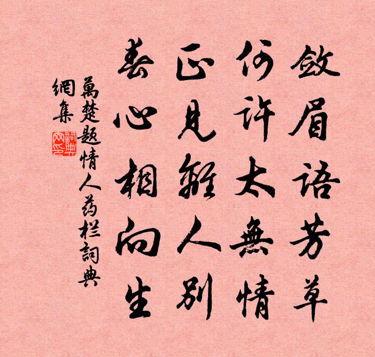 詩詞名句歷史字典書法欣賞書法字典國語詞典說文解字康熙字典古漢語字典標 題 作 者 詩 句 題情人藥欄作者:萬楚 朝代:唐代題情人藥欄原文斂眉語芳草,何許太無情。正見離人別,春心相向生。詩詞問答問:題情人藥欄的作者是誰?答:萬楚問:題情人藥欄寫於哪個朝代?答:唐代問:題情人藥欄是什麼體裁?答:五絕萬楚題情人藥欄書法欣賞題情人藥欄書法作品注釋全唐詩:卷145_18詩詞推薦寺趙葵〔宋代〕溪繞青山山繞溪,溪山勝處只僧知。支閒古木禪關靜,不到禪關又幾時。挽都運徽猷陳君詩虞儔〔宋代〕玉節稽嚴召,琳宮暫列仙。月華方喜見,薤露忽悲纏。回首長安日,傷心蜀道天。初無封禪議,遺藁總堪傳。江南錄曾極〔宋代〕自古嬰鱗或似狂,按誅潘佑事堪傷。憑誰寄語徐常侍,不殺忠臣國未亡。秋居有寄羅隱〔唐代〕端居湖岸東,生計有無中。魘處千般鬼,寒時百種風。性靈從道拙,心事奈成空。多謝金台客,何當一笑同。綺羅香(詠柳外聞蟬三章)陳著〔宋代〕障暑稠陰,梳涼細縷,□□□□□□。露腋玲瓏,多少鬧中幽趣。斷又續、可是無情,□相送、短長亭路。記春風知足吟 和崔十八未貧作。白居易〔唐代〕不種一隴田,倉中有餘粟。不採一枝桑,箱中有餘服。官閒離憂責,身泰無羈束。中人百戶稅,賓客一年祿。樽中偈頌三十八首釋如淨〔宋代〕十五日已前,湖光瀲灩晴方好。十五日已後,山色空濛雨益奇。正當十五日,若把西湖比西子,淡妝濃抹總相宜。司馬溫公輓詞五首范祖禹〔宋代〕上相經綸日,群生化育中。初開仁壽域,重立太平功。海宇還淳俗,朝廷復古風。英靈在王室,應佑宋無窮。次韻子由送千之侄蘇軾〔宋代〕江上松楠深復深,滿山風雨作龍吟。年來老乾都生菌,下有孫枝欲出林。白髮未成歸隱計,青衫倘有濟時心。閉門二月一日郡圃尋春二首楊萬里〔宋代〕花遶朱檐柳遶欄,小亭面面錦團欒。春風橫欲歁詩瘦,且下東窗護嫩寒。郢州道中見剌玫瑰花項安世〔宋代〕酴醾雨後飄春雪,芍藥負前散晚霞。一種繁香伴行客,只應多謝剌玫花。史館凌職方知廣州楊億〔宋代〕番禺出守重,漢殿拜恩初。華省郎官宿,名山太史書。剖符從鎖闥,持節上軺車。左顧金龜印,前驅書隼旟。由來西陵絕句詩十四首李鄴嗣〔清代〕三台夕照尚余曛,相望於墳與岳墳。一自蒼公藏骨後,湖山如畫遂三分。傾杯樂(散水調)柳永〔宋代〕樓鎖輕煙,水橫斜照,遙山半隱愁碧。片帆岸遠,行客路杳,簇一天寒色。楚梅映雪數枝艷,報青春訊息。年華夢悼妓東東竇鞏〔唐代〕芳菲美艷不禁風,未到春殘已墜紅。惟有側輪車上鐸,耳邊長似叫東東。第二百七十二卷次韻和前漳守馬郎中三篇碧波亭感事蘇頌〔宋代〕華堂直北望雲煙,勞遠勤歸此待賢。下榻喜逢徐稚至,登舟常羨李膺仙。知君將奉三年最,感舊曾歌一夜憐。紅粉和康伯可重陽吳芾〔宋代〕過了重陽又一陽,梅開亦擬共壺觴。病中無復成狂飲,且作前賢醒里狂。人日宋庠〔宋代〕陽律初回七日春,誰將靈品占佳辰。鏤金翦采空迎福,無奈牛羊已勝人。河南府試十二月樂詞。五月李賀〔唐代〕雕玉押簾額,輕縠籠虛門。井汲鉛華水,扇織鴛鴦紋。回雪舞涼殿,甘露洗空綠。羅袖從徊翔,香汗沾寶粟。富池祠李流謙〔宋代〕蕭何識信在逡巡,此事從來妙若神。不是將軍難著眼,正應黃祖是凡人。名句推薦命將征西極,橫行陰山側。李白《塞上曲》 朱顏空自改,向年年、芳意長新。韓縝《鳳簫吟·鎖離愁》 榮螈,蜥蜴。佚名《爾雅·釋魚》 正身直行,眾邪自息。劉安及其門客《淮南子·繆稱訓》 國破山河在,城春草木深。杜甫《春望》 四寸之管無當,必不滿也。授官、予爵、出祿不以功,是無當也。商鞅《商君書·靳令》 筆落驚風雨,書成泣鬼神。馮夢龍《醒世恆言·卷二十一》 夕陽牛背無人臥,帶得寒鴉兩兩歸。張舜民《村居·水繞陂田竹繞籬》 好水好山看不足,馬蹄催趁月明歸。岳飛《池州翠微亭》 雲雨朝還暮,煙花春復秋。李珣《巫山一段雲·古廟依青嶂》
