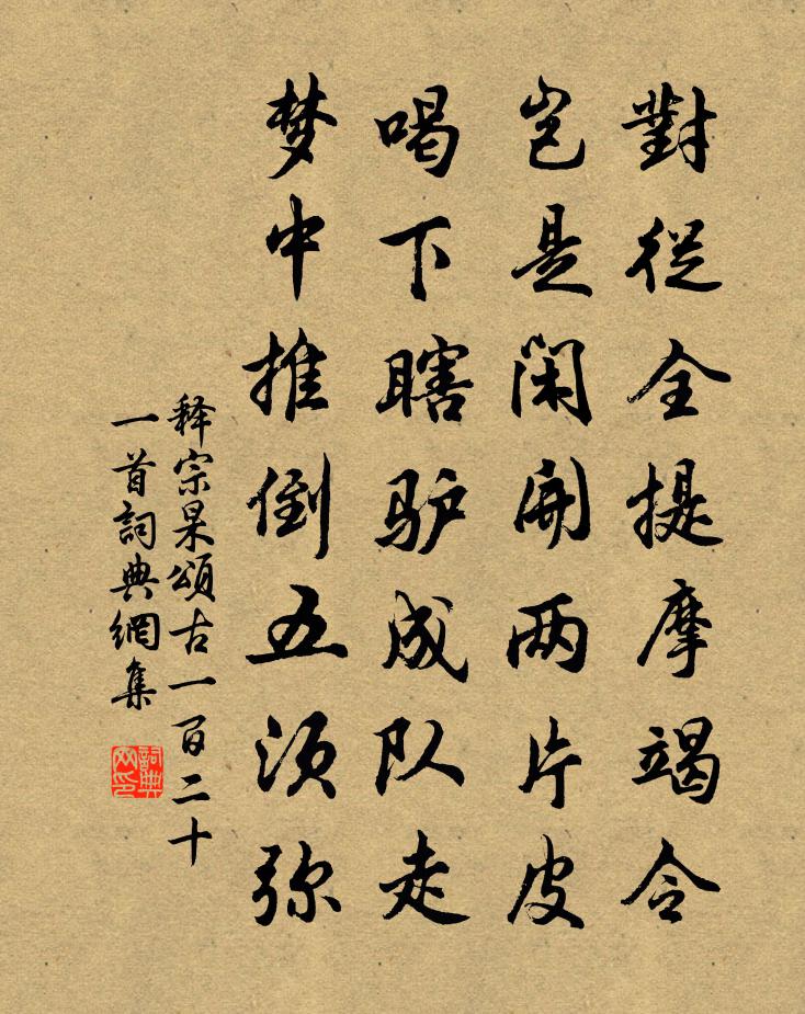 詩詞名句歷史字典書法欣賞書法字典國語詞典說文解字康熙字典古漢語字典標 題 作 者 詩 句 頌古一百二十一首作者:釋宗杲 朝代:宋代頌古一百二十一首原文對從全提摩竭令,豈是閒開兩片皮。喝下瞎驢成隊走,夢中推倒五須彌。詩詞問答問:頌古一百二十一首的作者是誰?答:釋宗杲問:頌古一百二十一首寫於哪個朝代?答:宋代釋宗杲頌古一百二十一首書法欣賞頌古一百二十一首書法作品詩詞推薦游溪宋之源〔宋代〕不因黨論到元符,安得溪山著一儒。時有詘伸須直道,天開靈傑豈歸愚。泉疏陰潤詩餘派,手拓蒼崖節轉孤。自送冬至後三日三首張耒〔宋代〕梅柳有情態,江城過歲除。山村見霜橘,江市出寒魚。謫久衣冠懶,身閒故舊疏。傍籬挑翠甲,憶我故園蔬。閨怨董以寧〔清代〕流蘇空系合歡床,夫婿長征妾斷腸。留得當時臨別淚,經年不忍浣衣裳。賀筵占贈營妓楊汝士〔唐代〕郎君得意及青春,蜀國將軍又不貧。一曲高歌紅一匹,兩頭娘子謝夫人。城傍曲王昌齡〔唐代〕秋風鳴桑條,草白狐兔驕。邯鄲飲來酒未消,城北原平掣皂雕。射殺空營兩騰虎,回身卻月佩弓弰。題瑞昌良田寺覽秀軒一首王阮〔宋代〕無心軒冕難招我,到眼雲山輒起予。不必憑欄更清賞,此身元在此山居。蠨蛸方回〔宋代〕窗眼蠨蛸粟許微,早能結網伺蟲飛。都來口腹容多少,狼虎操心伏殺機。宿山中十首劉克莊〔宋代〕玉轡上沙堤,金鞍戌磧西。何如寒潼底,落日蹇驢嘶。清湘驛送王柳州南歸二絕范成大〔宋代〕南歸北去路茫茫,不是行人也斷腸。可惜湘江春夜月,落花時節照離觴。題柳狄煥〔唐代〕天南與天北,此處影婆娑。翠色折不盡,離情生更多。雨余籠灞岸,煙暝夾隋河。自有佳名在,秦松繼得么。與樂天同葬杓直元稹〔唐代〕元伯來相葬,山濤誓撫孤。不知他日事,兼得似君無。劉邦直送早梅水仙花四首黃庭堅〔宋代〕錢塘昔聞水仙廟,荊州今見水仙花。暗香靜色撩詩句,宜在林逋處士家。正初和鄂州邊郎中見寄徐鉉〔唐代〕潦倒含香客,淒涼賦鵩人。未能全捲舌,終擬學垂綸。故友暌離久,音書問訊頻。相思俱老大,又見一年新。白公草堂孔武仲〔宋代〕達士因忘世,非求高尚名。林泉得佳處,風物有餘清。貝錦傷才舌,浮雲寄宦情。詩才今古備,性理死生明。蓮沼月色催花王鎡〔宋代〕湖中暖動采香船,晴入泥痕鬥草天。紅影一闌春欲透,趲開桃杏向陽邊。代和陳郎中丹桂三首陳耆卿〔宋代〕春蘭愧死菊羞黃,世上龍涎不敢香。獨有含香人晚步,搘筇一笑倚斜陽。用厚後弟強甫韻劉克莊〔宋代〕素昧清真與順庵,偶然愛唱望江南。世因玉佩輕秦七,天把簑衣貴謝三。郢可憂虞成永嘆,漢方隆盛勿多談。古今一籮金/蝶戀花佚名〔宋代〕新冬十葉蓂添一。良辰喜是翁生日。金鴨爇沉香。祥煙繞畫堂。遐齡方五十。厚福猶千百。看取小甥孫。年年捧壽登裴公亭借用杜牧之登齊山詩韻二首趙善括〔宋代〕春晚風花片片飛,登臨共惜景熹微。人生待足誰如意,官況苦無胡不歸。且向園林窮勝事,更憑山水發清暉。酒酣玉京山王哲〔元代〕失笑迷陰化不來。頑愚心鎖硬,怎生開。直饒富貴沒殃災。天年限,終久落輪迴。鬼使早相催。兒孫難替得,有何名句推薦提出西方白帝驚,嗷嗷鬼母秋郊哭。李賀《春坊正字劍子歌》 兵可千日而不用,不可 一日而不備。李大師、李延壽《南史·列傳·卷六十一》 柏府樓台銜倒影,茅茨松竹瀉寒聲。王守仁《次韻陸僉憲元日春晴》 楊花落,燕子橫穿朱閣。李清臣《謁金門·楊花落》 五月五日午,贈我一枝艾。文天祥《端午即事》 春花秋月何時了?往事知多少。李煜《虞美人·春花秋月何時了》 試問春歸誰得見?飛燕,來時相遇夕陽中。辛棄疾《定風波·暮春漫興》 富貴本無根,盡從勤里得。馮夢龍《醒世恆言·卷三十五》 漸秋闌、雪清玉瘦,向人無限依依。李清照《多麗·詠白菊》 林中有奇鳥,自言是鳳凰。阮籍《詠懷八十二首·其七十九》