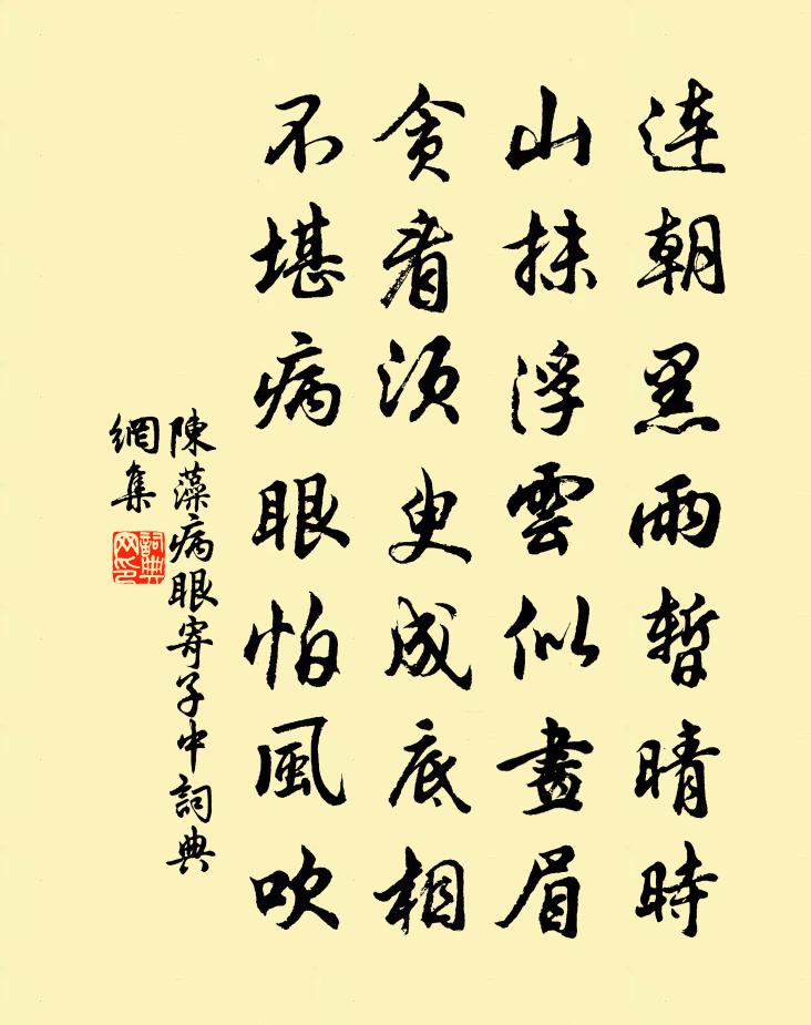詩詞名句歷史字典書法欣賞書法字典國語詞典說文解字康熙字典古漢語字典標 題 作 者 詩 句 病眼寄子中作者:陳藻 朝代:宋代病眼寄子中原文連朝黑雨暫晴時,山抹浮雲似畫眉。貪看須臾成底相,不堪病眼怕風吹。詩詞問答問:病眼寄子中的作者是誰?答:陳藻問:病眼寄子中寫於哪個朝代?答:宋代陳藻病眼寄子中書法欣賞病眼寄子中書法作品詩詞推薦和答韓子華餉子魚梅堯臣〔宋代〕南方海物難具名,子魚珍美無與並。完鱗全乙異臭腥,素鹽漬曝生花輕。其頭戢戢筠篋盈,出自通印時所評。遠涉烏棲曲吳龍翰〔宋代〕風敲玉鉤暇須垂,寒烏棲月萬年枝。香薰翠被春宵冷,玉臂曲作珊瑚枕。西江月薛式〔宋代〕一炁初回遇朔,鼎中神水溫溫。剛柔相會氣均勻。妙在無過渾沌。八卦循回循繞,推排九竅追奔。東西沉靜合朝昏辛亥二月望祭齋公因游甘園朱繼芳〔宋代〕山入湖光碧四圍,棋枰零落葑田稀。蒲芽短短鴛鴦冷,惟有漁師幾綱歸。十一月十五夜方回〔宋代〕竟與鰥魚似,無由濁蟻持。百為元有命,一往復何疑。殘夢終難續,深憂暗自知。鄰雛夜啼忽,吾亦憶吾兒。巫山一段雲 西江風雪李齊賢〔元代〕過海風淒緊,連雲雪杳茫。落花飄絮滿江鄉。偷放一春狂。漁市關門早,征帆入浦忙。酒樓何處咽絲簧。愁殺孟襄暮春游九言〔宋代〕已過清明穀雨天,燕忙鶯懶蝶蜂翾。風和日暖才三月,花落春歸又一年。得意自應談事業,有懷誰肯臥林泉。荷鋤贈別張堯詢晁補之〔宋代〕趣操幾前輩,詞章近古風。身名沉飲外,生事放言中。鵠騖從龜吉,船車送鬼窮。支離不征戍,高臥有奇功。呈萬菴十章火候白玉蟾〔宋代〕無位真人煉大丹,倚天長劍逼人寒。玉爐火煅天尊膽,金鼎湯煎佛祖肝。百刻寒溫忙裡準,六爻文武靜中看。有人刮鼓社王哲〔元代〕刮鼓社,這刮鼓本是仙家樂。見個靈童,於中傻俏,自然能做作。長長把玉繩輝霍。金花一朵頭邊爍。便按定五方江神子(初至休寧冬夜作)葛勝仲〔宋代〕昏昏雪意慘雲容。獵霜風。歲將窮。流落天涯,憔悴一衰翁。清夜小窗圍獸火,傾酒綠,借顏紅。官梅疏艷小壺中游齊覺寺二首曾豐〔宋代〕不謂僧游息,猶容俗往還。薰爐煙縷縷,茗碗雨班班。剟坐移門外,攜樽置竹間。小詩題歲月,多助得江山。三月二十四日自東山到金峨一宿而歸偶題壁上鄭清之〔宋代〕橋石天台水谷簾,峰迴秀擁更深嚴。我來便欲兼忘世,少立清風為指髯。白頭吟曹勛〔宋代〕相如素貧賤,羽翼依文君。一朝富貴擅名價,文君見棄如束薪。五羖自傭賃,釋褐歸強秦。鳴鐘列華屋,膳羞羅八錢塘懷古率堵無傲同賦楊維楨〔元代〕天山乳鳳飛來小,南渡衣冠又六朝。劫火 * 楊璉塔,箭鋒猶抵伍胥潮。磷光夜附山精出,龍氣秋隨海霧消。惟有好事近 過南雲門王惲〔元代〕南北兩雲門,竹圃稻畦如畫。罷亞黃雲萬頃,自長渠飛灑。太行鍾秀盡三鄉,形勝*高下。笑我年來用舍,似田間插田邵定〔宋代〕明朝蚤蚤起插田,東方未明雲漫漫。阿婆拊床呼阿三,阿三莫學阿五眠。汝起□火燒破鐺,麥飯雜菽炮鯗羹,邱嫂五泄山三學院十題禱雨潭釋鹹潤〔宋代〕嘗聞越邑民,禱雨碧岩畔。神龍如有期,為霖通旱暵。念奴嬌袁去華〔宋代〕竹陰窗戶薦微涼,積雨郊墟新霽。萬里飛雲都過盡,天闕星河如洗。檐隙風來,流螢飄墮,苒苒還飛起。魂清骨冷句蘇紳〔宋代〕一篇此日摛鴻藻,五色它年浴鳳文。名句推薦德者事業之基,未有基不固而棟宇堅久者洪應明《菜根譚·概論》 從善如登,從惡如崩司馬光《資治通鑑·魏紀·魏紀三》 越人語天姥,雲霞明滅或可睹。李白《夢遊天姥吟留別 / 別東魯諸公》 歌沉玉樹,古寺空有疏鍾發。李綱《六么令·次韻和賀方回金陵懷古鄱陽席上作》 平生不下淚,於此泣無窮。李白《江夏別宋之悌》 交河城邊鳥飛絕,輪台路上馬蹄滑。岑參《天山雪歌送蕭治歸京》 審定有無與其實虛,隨其嗜欲以見其志意。王詡《鬼谷子·捭闔》 試問閒愁都幾許?賀鑄《青玉案·凌波不過橫塘路》 柳如眉,雲似發,鮫綃霧縠籠香雪。魏承班《漁歌子·柳如眉》 良辰當五日,偕老祝千年。權德輿《端午日禮部宿齋有衣服彩結之貺以詩還答》