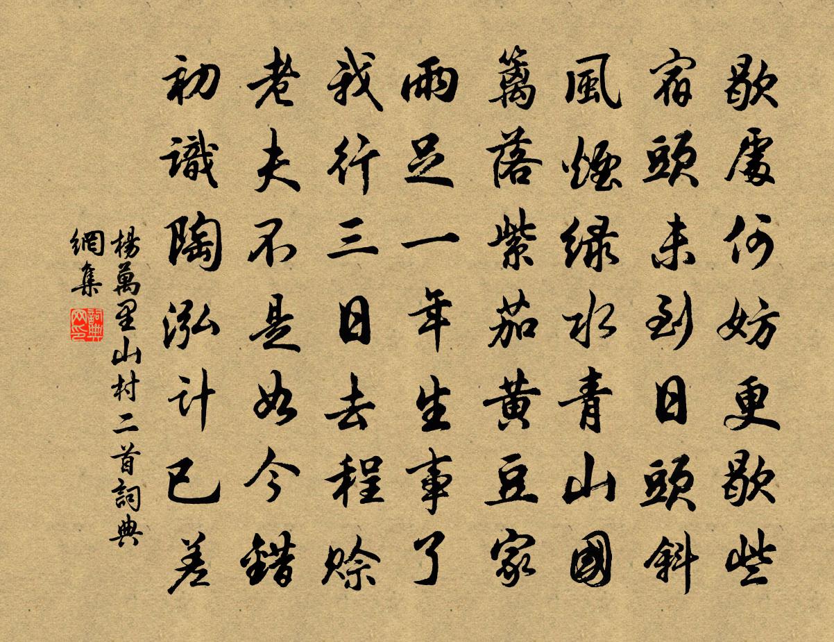 歇處何妨更歇些,宿頭未到日頭斜。風煙綠水青山國,籬落紫茄黃豆家。