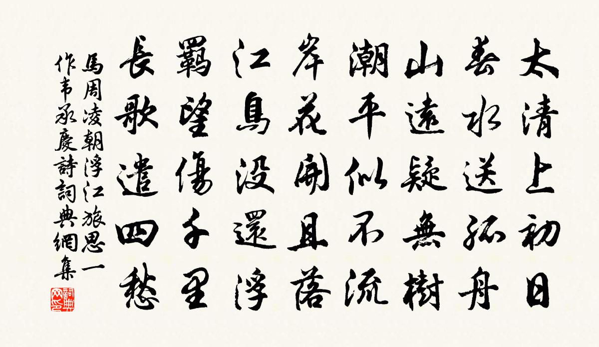 詩詞名句歷史字典書法欣賞書法字典國語詞典說文解字康熙字典古漢語字典標 題 作 者 詩 句 凌朝浮江旅思(一作韋承慶詩)作者:馬周 朝代:唐代原文太清上初日,春水送孤舟。山遠疑無樹,潮平似不流。岸花開且落,江鳥沒還浮。羈望傷千里,長歌遣四愁。詩詞問答問:《凌朝浮江旅思(一作韋承慶詩)》的作者是誰?答:馬周問:該詩寫於哪個朝代?答:唐代書法欣賞凌朝浮江旅思(一作韋承慶詩)書法作品譯文和注釋譯文(清朗的)天空升起一輪朝陽,(碧綠的)春水載送著一葉孤舟。青山渺遠,似乎沒有樹木;江水平淌,好像不動不流。兩岸的春花開而復落,江中的水鳥載沉載浮。羈旅中遠望千里,感傷無限,放聲高歌排遣浩茫的愁緒。注釋凌朝:早晨。太清:一作“天晴”,天空。沒還浮:時而鑽入水中,時而浮出水面羈:停留。詩詞推薦減字木蘭花·鶯初解語蘇軾〔宋代〕鶯初解語。最是一年春好處。微雨如酥。草色遙看近卻無。休辭醉倒。花不看開人易老。莫待春回。顛倒紅英間綠秋懷十首張耒〔宋代〕西風吹前林,壯士中夜興。感此歲月晚,白髮來無情。少年讀詩書,意與屈賈爭。口談霸王略,銳氣虹霓橫。天衢再用前韻贈子勉四首黃庭堅〔宋代〕胸中有度澤人,事上無心活身。只麽情親魚鳥,儻然圖畫麒麟。句石延年〔宋代〕震出坤柔變,乾成太極虛。和楊誠齋韻謝惠南海集詩三首袁說友〔宋代〕斯文宗主賴公歸,不使它楊僭等夷。四海聲名今大手,萬人辟易幾降旗。天方欲治將焉往,用不崇朝尚竊遲。整頓漁家傲梵琦〔元代〕聽說娑婆無量苦。如今業債前來負。賊劫貨財身被虜。逢狼虎。挑生咒死兼巫蠱。奴婢辛勤依惡主。黑瘡白癩聾和山中楚辭江淹〔南北朝〕予將禮於太一。乃雄劍兮玉鉤。日華粲於芳閣。月金披於翠樓。舞燕趙之上色。激河淇之名謳。薦西海之異品。傾以人參遺段成式周繇〔唐代〕人形上品傳方誌,我得真英自紫團。慚非叔子空持藥,更請伯言審細看。治圃雜書二十首方回〔宋代〕徑捷人蹤雜,牆頹地界斜。織籬呼野老,烹茗諭鄰家。舊穴通羊豕,新畦隔芋瓜。尚當分汝果,幸勿竊予花。攝事齋宮偶書歐陽修〔宋代〕齋宮岑寂偶偷閒,猶覺閒中興未闌。美酒清香銷晝景,冷風殘雪作春寒。丹心未死惟憂國,白髮盈簪盍掛冠。誰為句齊賢良〔宋代〕依微謝女吟來雪,零落襄王夢後雲。次韻寄史彥明牟巘五〔宋代〕等閒看盡弁衡毗,旁郡聊從捧檄馳。候管乍披新定志,郵筒忽見故人詩。君方清絕行明鏡,我正摧頹據槁枝。為喜千秋嶺虞儔〔宋代〕輕陰漠漠雨班班,嶺上風來一解顏。已是去天才尺五,卻令緩步有躋攀。飛泉百道縈羅帶,列岫千峰擁翠鬟。應是和興化趙令君二首劉克莊〔宋代〕自古名高眾責全,幾人齎恨到重泉。世傳戇叟難□節,士謂周侯惜末年。扶電駿翻成跛鱉,鳴陽鳳化作寒蟬。嗟予立春日禊亭偶成張栻〔宋代〕律回歲晚冰霜少,春到人間草木知。便覺眼前生意滿,東風吹水綠差差。謁漢高帝廟韓維〔宋代〕魂魄應游沛,空嗟廟貌殘。蒼碑火剝裂,畫壁雨蘭乾。帳幙虛風肅,松槐白日寒。升堂欲進拜,猶怯戴儒冠。記畫方岳〔宋代〕閒雲古木山藏寺,野渡孤舟水落磯。秋色無人空黯淡,竹門未掩待僧歸。拜靖節墓羅洪先〔明代〕久憎折腰事,再拜向高墳。東晉非前日,南山還暮雲。將持斗酒酹,更以輓歌聞。不飲緣何事,低回心已醺。頌古十一首釋子益〔宋代〕拋磚引玉老香嚴,打著南邊動北邊。聽事不真鍾作翁,至今千古錯流傳。和子瞻渦口遇風蘇轍〔宋代〕長淮暮生風,來自渦河口。新舟雖雲固,波浪亦難受。詩來話艱厄,驚恐及兒婦。憶同溯荊峽,終夜愁石首。余飈名句推薦綠竹入幽徑,青蘿拂行衣。李白《下終南山過斛斯山人宿置酒》 記得年時臨上馬,看人眼淚汪汪。劉彤《臨江仙·千里長安名利客》 雖萬被戮,豈有悔哉!班固《漢書·傳·司馬遷傳》 窗含西嶺千秋雪,門泊東吳萬里船。杜甫《絕句》 家有千口,主事一人。佚名《增廣賢文·下集》 朽木不可雕也,糞土之牆不可圬也!佚名《宰予晝寢》 握手一長嘆,淚為生別滋蘇武《留別妻》 且夫義者,政也。無從下之政上,必從上之政下。墨子《墨子·26章 天志(上)》 桃李風前多嫵媚,楊柳更溫柔。辛棄疾《武陵春·桃李風前多嫵媚》 帝王之道,以寬仁為大。令狐德棻《周書·本紀·卷四》