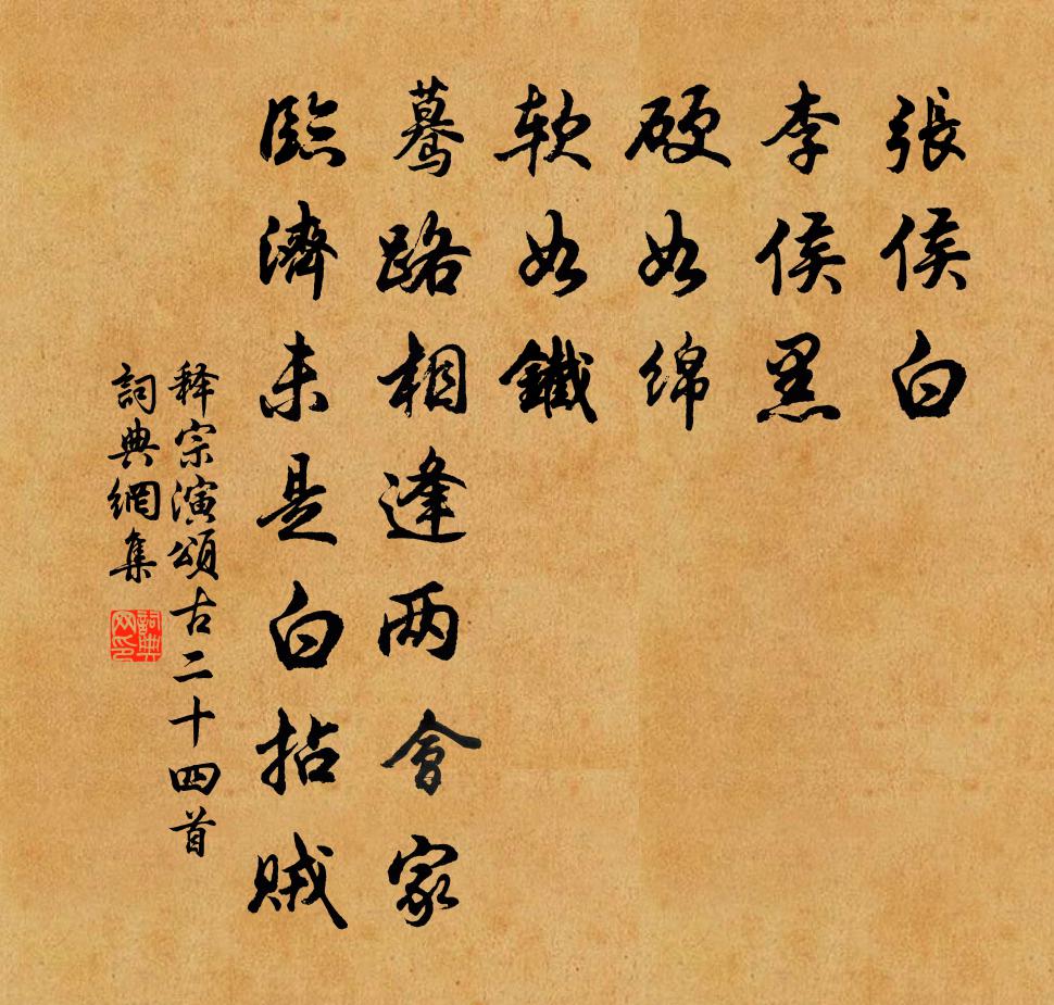 詩詞名句歷史字典書法欣賞書法字典國語詞典說文解字康熙字典古漢語字典標 題 作 者 詩 句 頌古二十四首作者:釋宗演 朝代:宋代頌古二十四首原文張侯白,李侯黑。硬如綿,軟如鐵。驀路相逢兩會家,臨濟未是白拈賊。詩詞問答問:頌古二十四首的作者是誰?答:釋宗演問:頌古二十四首寫於哪個朝代?答:宋代釋宗演頌古二十四首書法欣賞頌古二十四首書法作品詩詞推薦金明池楊簡〔宋代〕燕語鶯啼,杏壇春色。為甚無人領略,又添個山青水綠。是多多少少明明白白,對面不識。方且蕩然放逸,不亦文送丁子章將漕湖南三首楊萬里〔宋代〕半世行天下,同心寡友生。故人今又去,此意向誰傾。白髮三更語,青燈一點明,看渠還玉署。老我正歸耕。對菊花二首張耒〔宋代〕官閒身世兩悠悠,種竹栽花一散愁。 * 叢邊對疏雨,一年懷抱此時秋。題張太尉畫曹勛〔宋代〕一帶煙沙接冷雲,平林寂歷夕陽昏。輕舟急槳歸何處,應住山前黃葉村。二風詩亂風詩五篇至亂元結〔唐代〕嘻乎王家,曾有凶王,中世失國,豈非驕荒。復復之難,令則可忘。嘻乎亂王,王心何思? * 虐惑,無思不為;追懷甲戌清明宇文信仲知郡大卿同尤張二倅過方回〔宋代〕甲戌清明鬢未翁,邦君過我小園中。牡丹初喜開千朵,劫火何知村一空。展轉干戈春夢斷,淒涼風雨客途窮。九原挽張梅坦二首陳著〔宋代〕之子吾鄉秀,生來踏上風。蘭亭高擢穎,芹泮早稱雄。科第孫山秀,吟情灞雪中。□□□□□,□□□□□。偈頌七十一首釋了惠〔宋代〕無病之藥,不傳之方。昨朝用不得,今日恰相當。如何是相當處,往往呼為百草霜。太白詞蘇軾〔宋代〕風為幄,云為蓋。滿堂爛,神既至。紛醉飽,錫以雨。百川溢,施溝渠,歌且舞兮。示槱錢時〔宋代〕詩成正自不因題,看取風人發興時。語到口頭無可奈,未須搜攪古吟詩。望東湖五首袁燮〔宋代〕世上功名姑置之,微茫心事要深思。水光月色精神好,長使襟懷似此時。晚雨鄭剛中〔宋代〕連日午後雨,勢欲漂茅屋。雨從炎海來,初不洗煩溽。殘虹掛雲端,落照明如燭。舍中不勝困,散步眺林簏。渾地宿延慶院錢昆〔宋代〕水繞門牆竹繞堂,滿窗春綠更山光。坐來苔蘚侵衣潤,吟處松花落硯香。汀鷺雙雙翻亂石,溪風裊裊弄修篁。遊人大覺高僧蘭若(和尚去冬往湖南)杜甫〔唐代〕巫山不見廬山遠,松林蘭若秋風晚。一老猶鳴日暮鍾,諸僧尚乞齋時飯。香爐峰色隱晴湖,種杏仙家近白榆。飛錫二十八日同臨湘尉曹呂益卿登岳陽樓趙蕃〔宋代〕草沒重湖路,帆孤一葉舟。飄風來復斷,凍雨落還收。游目窮天末,題詩欠筆頭。登臨有如此,好在岳陽樓。畫山水扇邵清甫〔宋代〕岩脈交橫簇亂峰,顛崖懸絕隱仙翁。不須遠看連天色,盡在吾人掌握中。南鄉子晏幾道〔宋代〕眼約也應虛,昨夜歸來鳳枕孤。且據如今情分里,相於。只恐多時不似初。深意托雙魚,小剪蠻箋細字書。更把此挽曹處士二首杜范〔宋代〕年才四十未雲遲,勇謝文場意已奇。獨抱古心欣有得,肯同時好浪相追。回神自是平生學,徹底還看處死時。援筆病眼寄子中陳藻〔宋代〕連朝黑雨暫晴時,山抹浮雲似畫眉。貪看須臾成底相,不堪病眼怕風吹。杭州開元寺牡丹張祜〔唐代〕濃艷初開小藥欄,人人惆悵出長安。風流卻是錢塘寺,不踏紅塵見牡丹。名句推薦夜來小雨新霽,雙燕舞風斜。万俟詠《訴衷情·送春》 今朝此為別,何處還相遇。韋應物《初發揚子寄元大校書》 教子弟求顯榮,不如教子弟立品行。王永彬《圍爐夜話·第四五則》 盧家少婦鬱金堂,海燕雙棲玳瑁梁。沈佺期《古意呈補闕喬知之 / 古意 / 獨不見》 三歲為婦,靡室勞矣。夙興夜寐,靡有朝矣。佚名《氓》 所謂敬天者,不獨嚴而有禮,當有其實。張廷玉《明史·本紀·卷三》 花無人戴,酒無人勸,醉也無人管。黃公紹《青玉案·年年社日停針線》 閒來無事不從容,睡覺東窗日已紅。程顥《秋日》 蠻姜豆蔻相思味。算卻在、春風舌底。吳文英《杏花天·詠湯》 春山煙欲收,天淡星稀小牛希濟《生查子·春山煙欲收》