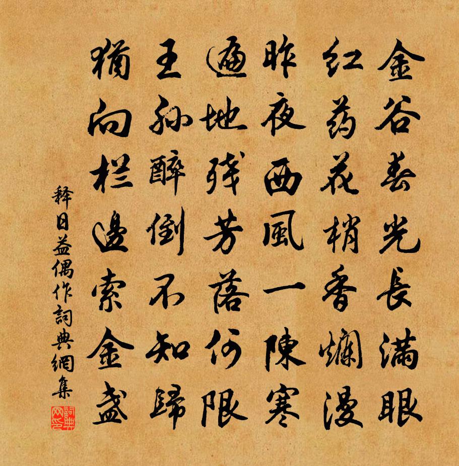 詩詞名句歷史字典書法欣賞書法字典國語詞典說文解字康熙字典古漢語字典標 題 作 者 詩 句 偶作作者:釋日益 朝代:宋代偶作原文金谷春光長滿眼,紅藥花梢香爛漫。昨夜西風一陳寒,遍地殘芳落何限。王孫醉倒不知歸,猶向欄邊索金盞。詩詞問答問:偶作的作者是誰?答:釋日益問:偶作寫於哪個朝代?答:宋代釋日益偶作書法欣賞偶作書法作品詩詞推薦呈張左曹郎中張鎡〔宋代〕持節江湘公去久,浙西風月我孤吟。相逢未敘三年話,此事先拋一寸心。風調不因通宦汩,世塗尤見故情深。隨人道逢過軍投宿山寺真山民〔宋代〕窮途欲焉往,薄暮此相投。蟋蟀數聲雨,芭蕉一寺秋。鄉關來枕畔,時事上眉頭。長嘆為僧好,今逢更說愁。大雪復用前韻呈王尚書陳造〔宋代〕密雪何自來,雨襧雲其祖。史臣紀上瑞,外此可無語。帝豈為詩設,偏為詩人取。梁園謝家庭,麗句傳今古。玄冥賦鐵柱艾性夫〔宋代〕淮川鎖支祁,民免其魚苦。誰謂旌陽翁,功可配神禹。小試青蛇鋒,橫絕長蛟膂。聚彼數州鐵,鑄此千民柱。沉江楊居士送眼藥陽枋〔宋代〕去來雲去不乾山,花落花開春又還。世事總歸明眼裡,皇王帝伯恁催班。寄信州交代錢德循孔武仲〔宋代〕處君以西軒之爽氣,贈君以仙府之名花。名花芬敷隨曉日,爽氣蕭颯凌朝霞。山川從此增秀色,塵埃不復留君家。樂語王義山〔宋代〕戲袞玉球添一笑。笑道輕狂,似恁人間少。偏倚龍池依鳳沼。隨風得得低迴繞。掠麵點衣夸百巧。似雪飛花,點束送僧游五台山釋簡長〔宋代〕五峰橫絕漢,寒翠倚蒼冥。積雪無煩暑,高杉礙落星。磧雪簷外見,邊角坐中聽。師到棲禪夜,龍湫獨灌瓶。連雪不已復作絕句詠之及六而止殆未免不愁凍趙蕃〔宋代〕對岸初封屋,臨流已蔽汀。長江停袞袞,去鳥失冥冥。送頵道人還西山徐鉉〔唐代〕嘗憶洪崖澗,穿雲路萬尋。曾經照玄鬢,未得卸朝簪。老去馳莊蝶,年來有越吟。羨師從此去,舊隱翠微深。得台檄視堰至上皇設黃籙會北友自無而於得孫程公許〔宋代〕肅敞芝壇大面峰,擬憑方寸逆璇穹。夜窗滴盡三更雨,曉霧吹開萬壑風。孤鶴上來隨伴去,十龜相農賞心同。未應賀友人絲桐復歸陳起〔宋代〕春到牡丹花事闌,惜春約客游湖山。煙光萬態屬吟思,白石清泉流指間。雙成解後蘭舟駐,索紙大書春草句。成此菩薩蠻陳師道〔宋代〕銀潢清淺填烏鵲。畫檐急雨長河落。初月未成圓。明星惜此筵。愁來無斷絕。歲歲年年別。不用淚紅滋。年年歲歲送本中上人王冕〔元代〕上人飛錫何方去?笑指東南咫尺間。黃葉落時行細路,白雲生處看青山。欲求古道殊難得,悵望高風或可攀。朋舊花仙館張鎡〔宋代〕煙火心腸詠不真,風流嬌貴卻無塵。何須更問花仙姓,便是扁舟共載人。寒山把蕉葉執筆贊釋子益〔宋代〕吟詩吟未就,執筆且搜枯。欲寫芭蕉上,依前一字無。用梅山醉中韻三首陳著〔宋代〕一窗桃李夾垂陽,一卷離騷一炷香。閉眼坐來開眼笑,到笑言處是春光。驀山溪(春半)張震〔宋代〕青梅如豆,斷送春歸去。小綠間長紅,看幾處、雲歌柳舞。偎花識面,對月共論心,攜素手,采香游,踏遍西池路同年楊謹仲教授以詩慶予得郡次韻二首周必大〔宋代〕才氣崢嶸早斷鰲,詩豪不獨酒中豪。其誰代匠頻傷斲,之子良庖卻善刀。莫嘆廣文官獨冷,絕勝州郡職徒勞。泮宮洞仙歌(七夕)姚述堯〔宋代〕金風玉露,正清秋初霽。天上星郎夜遊戲。喜鵲兒、向織女報佳期,停機杼,草草便諧歡會。情深悄無寤,雲雨須名句推薦天之生民,非為君也;天之立君,以為民也。荀子《荀子·大略》 拜華星之墜幾,約明月之浮槎。文天祥《回董提舉中秋請宴啟》 家國興亡自有時,吳人何苦怨西施。羅隱《西施》 誰家玉笛暗飛聲,散入春風滿洛城。李白《春夜洛城聞笛 / 春夜洛陽城聞笛》 無善而致人譽,不如無惡而致人毀。洪應明《菜根譚·概論》 言而當、知也;默而當,亦知也荀子《荀子·非十二子》 誤用聰明,何若一生守拙王永彬《圍爐夜話·第四一則》 霜降碧天靜,秋事促西風。葉夢得《水調歌頭·九月望日與客習射西園余偶病不能射》 醉折殘梅一兩枝,不妨桃李自逢時。陸游《落梅》 應是夜寒凝。惱得梅花睡不成。黃升《南鄉子·冬夜》