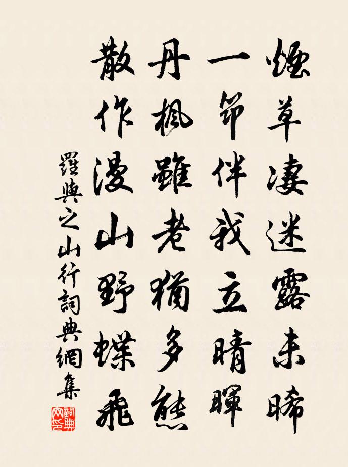 詩詞名句歷史字典書法欣賞書法字典國語詞典說文解字康熙字典古漢語字典標 題 作 者 詩 句 山行作者:羅與之 朝代:宋代山行原文菸草淒迷露未晞,一筇伴我立晴暉。丹楓雖老猶多態,散作漫山野蝶飛。詩詞問答問:山行的作者是誰?答:羅與之問:山行寫於哪個朝代?答:宋代羅與之山行書法欣賞山行書法作品詩詞推薦予頃從穰下移涖河陽洎出中書復領分陝惟茲二寇準〔宋代〕岸闊檣稀浪渺茫,獨憑危檻思何長。蕭蕭遠樹疏林外,一半秋山帶夕陽。溪上醉吟陸游〔宋代〕行行不知溪路深,但怪素月生遙岑。不辭醉袖拂花絮,與子更醉青蘿陰。野水橫舟釋道璨〔宋代〕望之一葉輕,即之萬鈞重。天風吹不去,世波搖不動。送盡千帆飛,濟川已無夢。月冷蘋花秋,此興白鷗共。九月初十日山房午睡恍見梅枝已吐白矣驚喜而舒岳祥〔宋代〕生愛梅花是性情,故園陰絕淚縱橫。夢中驚見南枝曝,起繞山邊水畔行。不俗軒耐閒軒頌黃庭堅〔宋代〕不愛孔方乃不俗,放下利慾是耐閒。棒打石獅子,論實不論虛。送惠縣丞歸陽羨葉適〔宋代〕三嶺描成翠骨堆,一川罨畫繡徘徊。三年塵土無人識,山水虛閒與喚回。桐廬寺曉鍾張伯玉〔宋代〕扁舟下桐圃,霜月滿寒潭。疏鍾一聲起,清與天地參。春容逗萬壑,窈窕出層嵐。羈魂不成寐,洗耳滌塵貪。鏤雞子駱賓王〔唐代〕幸遇清明節,欣逢舊練人。刻花爭臉態,寫月競眉新。暈罷空餘月,詩成並道春。誰知懷玉者,含響未吟晨。賜陳摶宋太宗〔宋代〕曾向前朝出白雲,後來訊息杳無聞。如今若肯隨徵召,總把三峰乞與君。初夏旅中五首楊公遠〔宋代〕烏兔雙飛去若梭,又逢天氣正清和。綠空桑柘蠶成趼,青遍田疇犢臥莎。好景常供詩料足,浮生每嘆客愁多。家山楊仲遠輓詩魏了翁〔宋代〕屬我銘先竁,元符事益光。十年黃壤夢,再世短松崗。樓外焄蒿集,閣前名節香。吳鉤無處掛,芻束寄諸郎。赤日楊億〔宋代〕赤日亭亭晝正賒,長風萬里憶星槎。銅盤瓊蕊三危露,素綆寒漿五色瓜。蘭室冷光浮玉簟,柳營清吹逐金笳。翠微夜遊宮毛滂〔宋代〕長記勞君送遠。柳煙重、桃花波暖。花外溪城望不見。古槐邊,故人稀,秋鬢晚。我有凌霄伴。在何處、山寒雲亂生查子·東風不解愁納蘭性德〔清代〕東風不解愁,偷展湘裙衩。獨夜背紗籠,影著纖腰畫。爇盡水沉煙,露滴鴛鴦瓦。花骨冷宜香,小立櫻桃下。送張中丞赴桂州錢起〔唐代〕出守求人瘼,推賢動聖情。紫台初下詔,皂蓋始專城。寵借飛霜簡,威加卻月營。雲衢降五馬,林木引雙旌。夙仰寓嘆陸游〔宋代〕裘薄便冬暖,簞空畏午飢。臨成乞米帖,看入借車詩。學古心猶壯,憂時語自悲。公卿闕自重,社稷欲誰期?題長蘆方丈章甫〔宋代〕笑別靈岩日當午,籃輿輒輒轉江浦。眼明初入菩提場,一燈傳自西來祖。老禪留客苦殷勤,汲泉煮茗添爐薰。空江酴醿閣郭印〔宋代〕春風高閣上,雪片又能香。琢玉全天質,施朱笑晚妝。梅花如許瘦,柳絮不勝狂。況此偏宜釀,逢人問酒方。留樊亭三日王覺民檢詳日攜酒來飲海棠下比去陸游〔宋代〕石衛尉家錦步障,移在樊家園館中。醉到花殘呼馬去,聊將俠氣壓春風。送侄邁赴河間令蘇轍〔宋代〕老去那堪用,恩深未敢歸。誰能告民病,一一指吾非。爾赴河間治,無嫌野老譏。仍將尺書報,勿復問從違。名句推薦白雪卻嫌春色晚,故穿庭樹作飛花。韓愈《春雪》 群芳過後西湖好,狼籍殘紅。歐陽修《採桑子·群芳過後西湖好》 幽微靈秀地,無可奈何天。曹雪芹《紅樓夢·第五回》 木蘭舟上,何處吳娃越艷:藕花紅照臉。孫光憲《河傳·風颭》 冰,水為之,而寒於水。荀子《勸學》 雙眼自將秋水洗,一生不受古人欺。袁枚《隨園詩話·補遺 卷三》 望章台路杳,金鞍遊蕩,有盈盈淚。章楶《水龍吟·燕忙鶯懶芳殘》 風住塵香花已盡,日晚倦梳頭。李清照《武陵春·春晚》 幸災不仁,乘危不武張廷玉《明史·列傳·卷一百三十六》 閒倚博山長嘆,淚流沾皓腕。韋莊《歸國遙·春欲晚》