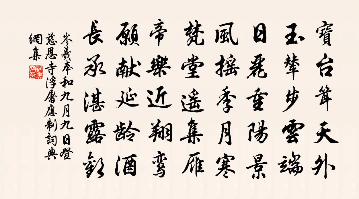 詩詞名句歷史字典書法欣賞書法字典國語詞典說文解字康熙字典古漢語字典標 題 作 者 詩 句 奉和九月九日登慈恩寺浮屠應制作者:岑羲 朝代:唐代原文寶台聳天外,玉輦步雲端。日麗重陽景,風搖季月寒。梵堂遙集雁,帝樂近翔鸞。願獻延齡酒,長承湛露歡。詩詞問答問:《奉和九月九日登慈恩寺浮屠應制》的作者是誰?答:岑羲問:該詩寫於哪個朝代?答:唐代問:該詩是什麼體裁?答:五律書法欣賞奉和九月九日登慈恩寺浮屠應制書法作品注釋全唐詩:卷93_10詩詞推薦太常引馬熙〔元代〕園中風物水中亭。消得兩娉娉。濁酒卷荷傾。早洗盡、箏聲笛聲。四堤晴柳,一天花氣,付與晚山青。飛絮挾雲輕紅牙板歌楊維楨〔元代〕百花樓前花倡樂作,花長鼻彎彎花舞金絡花。生憐為齒焚雄軀,枯魄應節如何虞?良工削出紅冰片,脫木生前豈容送楊氏女韋應物〔唐代〕永日方戚戚,出行復悠悠。女子今有行,大江溯輕舟。爾輩苦無恃,撫念益慈柔。幼為長所育,兩別泣不休。對此新澗亭白居易〔唐代〕煙蘿初合澗新開,閒上西亭日幾回。老病歸山應未得,且移泉石就身來。山中酬楊補闕見過錢起〔唐代〕日暖風恬種藥時,紅泉翠壁薜蘿垂。幽溪鹿過苔還靜,深樹雲來鳥不知。青瑣同心多逸興,春山載酒遠相隨。卻慚次韻吳伯庸竹間梅花十絕釋紹嵩〔宋代〕竹與梅花相併枝,月明還見影參差。捻梅細比新詩看,酷似梅花太瘦時。七里瀨周弼〔宋代〕瞬息沿流七里遙,感時回纜木蘭橈。高台未變陵兼谷,故國頻更市與朝。風散亂雲通去驛,雨消殘雪助歸期。漁翁別俞君任通判三首陳造〔宋代〕房陵書望毗陵,書計舍六十書余。今我書從遠役,羨君方逸居。逸勞不足道,會合嗟愈疎。向來江南北,二年能幾戲呈吳馮皎然〔唐代〕世人不知心是道,只言道在他方妙。還如瞽者望長安,長安在西向東笑。首尾吟邵雍〔宋代〕堯夫非是愛吟詩,詩是堯夫樂事時。天道虧盈如橐籥,聖人言語似著龜。光陰去後繩難系,筋力衰時藥不醫。莫把送侃禪者之丹丘釋重顯〔宋代〕石橋多古蹟,路嶮少人過。如同白日閒,冷拂青苔坐。寒老若相逢,為吾略嘲破。從元衡借廬山記偶成三首趙蕃〔宋代〕山南山北富深幽,羽服方袍占上頭。吾道才余白鹿洞,寂寥幾載有新修。宿東魯父居二首張耒〔宋代〕夕陽低欲盡,春淺色蕭蕭。暝色催歸牧,炊煙向晚樵。疏星臨水際,遠火隔村橋。黯黯柴門夜,棲鴉對寂寥。虎丘方仲荀〔宋代〕海湧起平田,禪扉古木間。出城先見塔,入寺始登山。堂靜參徒散,巢喧乳鶴還。祖龍求寶劍,曾此鑿孱顏。顏魯公祠堂詩李廌〔宋代〕朅來游汝海,初識魯公真。盛德宜蒙祀,英姿儼若神。典刑雖異代,勳績在蒸民。憶昔艱難際,生逢歷數屯。羯胡送許戶曹唐彥謙〔唐代〕沙頭小燕鳴春和,楊柳垂絲煙倒拖。將軍樓船發浩歌,雲檣高插天嵯峨。白虹走香傾翠壺,勸飲花前金叵羅。神鰲中秋月許晝〔唐代〕應是蟾宮別有情,每逢秋半倍澄清。清光不向此中見,白髮爭教何處生。閒地占將真可惜,幽窗分得始為明。殷勤送人之金陵周文璞〔宋代〕江山不逐寒潮晚,陵墓猶含古木春。君入台城須訪問,箇中定有六朝人。打魚梅堯臣〔宋代〕插葦截灣流,寒魚未能越。安知罟師意,設網遮其闕。不須芳餌懸,何待清歌發。所獲勝綸竿,寧聞憂澤遏。總題葛紹體〔宋代〕車馬不來山意朴,市廛都遠土風淳。又無僧寺閒鐘鼓,流水聲中自有春。名句推薦倉稟無宿儲,徭役猶未已。韋應物《觀田家》 誰知江上酒,還與故人傾。周紫芝《臨江仙·送光州曾使君》 不堪腸斷思鄉處,紅槿花中越鳥啼。李德裕《謫嶺南道中作》 京口瓜洲一水間,鐘山只隔數重山王安石《泊船瓜洲》 晴風初破凍,柳眼梅腮,已覺春心動。李清照《蝶戀花·暖雨晴風初破凍》 同心一人去,坐覺長安空。白居易《別元九後詠所懷》 三年遇寒食,盡在洛陽城。白居易《洛橋寒食日作十韻》 隋堤上、曾見幾番,拂水飄綿送行色。周邦彥《蘭陵王·柳》 不信比來長下淚,開箱驗取石榴裙。武則天《如意娘》 積學以儲寶,酌理以富才劉勰《文心雕龍·神思》