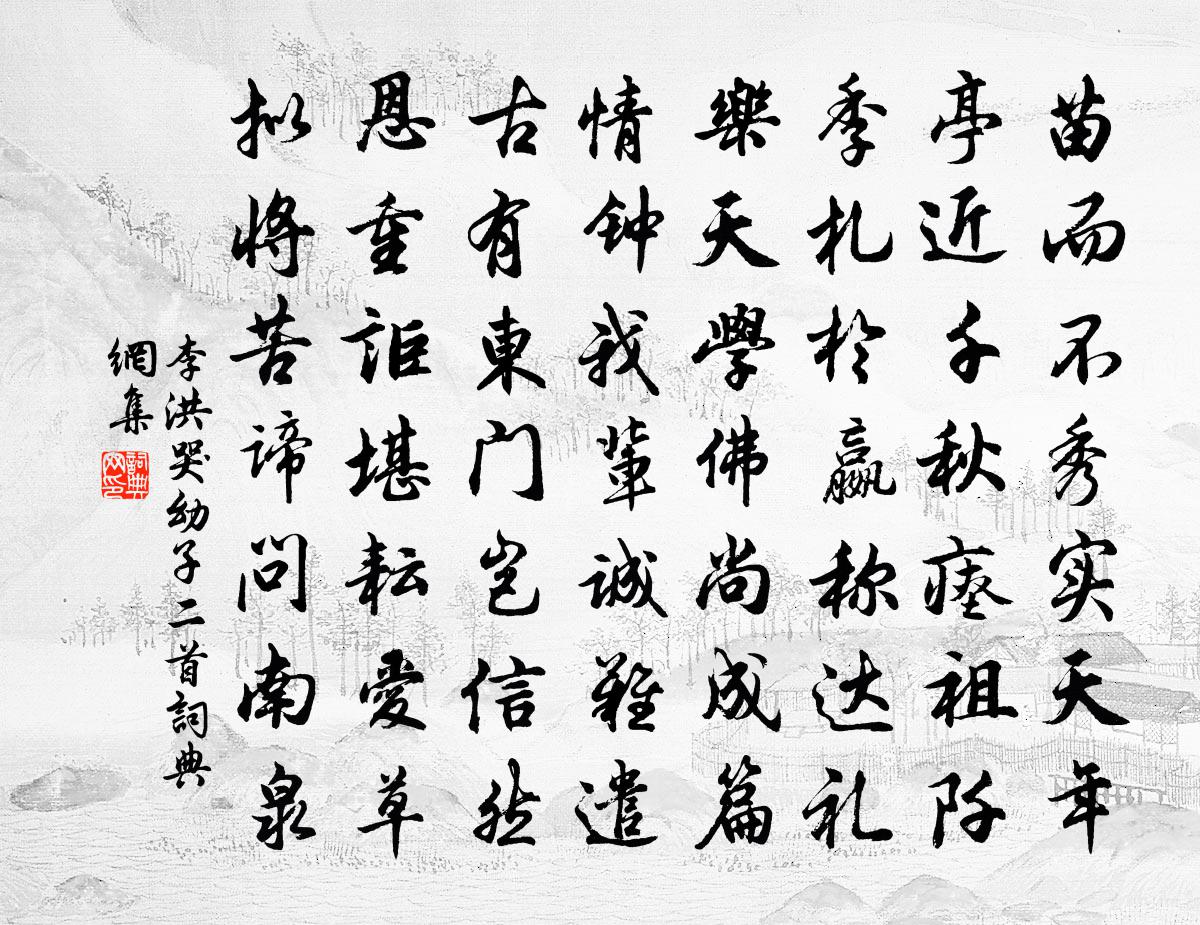 詩詞名句歷史字典書法欣賞書法字典國語詞典說文解字康熙字典古漢語字典標 題 作 者 詩 句 哭幼子二首作者:李洪 朝代:宋代哭幼子二首原文苗而不秀實天年,亭近千秋瘞祖阡。季札於嬴稱達禮,樂天學佛尚成篇。情鍾我輩誠難遣,古有東門豈信然。恩重詎堪耘愛草,擬將苦諦問南泉。詩詞問答問:哭幼子二首的作者是誰?答:李洪問:哭幼子二首寫於哪個朝代?答:宋代李洪哭幼子二首書法欣賞哭幼子二首書法作品詩詞推薦四月九日幽谷見緋桃盛開歐陽修〔宋代〕經年種花滿幽谷,花開不暇把一卮。人生此事尚難必,況欲功名花鼎彝。深紅淺紫看雖好,顏色不柰東風吹。緋桃三堂宋肇〔宋代〕林巒十里上巉岩,飛檻初憑縹緲間。夔子風煙依白帝,夜郎耕稼接鳥蠻。砌橫亂石遙臨澗,門對高峰近帶山。咫尺奉和御製讀三國志詩夏竦〔宋代〕白馬當塗兆,黃家得歲興。金符威既重,玉版事堪憑。漢火承前運,誰龍合舊徵。青雲開後葉,下武倍兢兢。凝翠白玉蟾〔宋代〕香穟飛紫煙,茗花涌白雪。坐對松竹林,已換塵俗骨。前山多翠色,凝然暮欲滴。憑欄拍掌呼,天外鶴來一。胭脂井楊維楨〔元代〕井無水,荒龍倚。不知如,巴馬子。仰天夜見黃姑星,水底嘍嘍話紅鬼,長繩捲起天河水。井中人,不殉死,宮人虞美人草舒岳祥〔宋代〕鹹陽一炎燒天戲,重瞳將軍帝業空。欲據彭城作盟主,漢王隨手定關中。垓下楚歌聞太晚,帳前驚起途已窮。當時和許伯修韻馬廷鸞〔宋代〕秋風孤憤只心知,接得詩筒為色怡。句眼獨參成佛後,吟肩聳徹欲仙時。俗衰競覓胡奴飽,節在何妨臣朔飢。此話途次三絕寇準〔宋代〕大澤荒草闊,行人心慘淒。邊雲時斷續,流水自東西。生查子彭元遜〔宋代〕痴多故惱人,妝晚翻嫌趣。只為眼波長,嗔笑嬌難觸。春心不肯深,春睡何曾足。莫待柳花飛,飛去無拘束。代書寄劍州普安令周士彥屯田邵雍〔宋代〕作官休用嘆奚為,未有升高不自卑。君子屈伸方為道,吾儒進退貴從宜。即今彭澤歸何地,他日東門去未遲。痛恨浣溪沙(餞范子芬行)洪适〔宋代〕整頓春衫欲跨鞍。一杯相屬少開顏。愁眉不似舊時彎。未見兩星添柳宿,忍教三疊唱陽關。相思空望會稽山。韓耕道交八絕句韻見寄因和答之曹彥約〔宋代〕羽檄交馳駭電奔,詔書頻下想天恩。舊時懶惰如魔去,祗有書生習尚存。偈頌六十五首釋普濟〔宋代〕經行及坐臥,常在於其中。要識其中事,長汀江水東。頌古四十四首釋師範〔宋代〕閃爍旌旗驟往來,幾人遙望起疑猜。此時若得樊公腳,一踏鴻門兩扇開。寄尋萍公齊己〔唐代〕聞在湓城多寄住,隨時談笑渾塵埃。孤峰恐憶便歸去,浮世要看還下來。萬頃野煙春雨斷,九條寒浪晚窗開。虎溪次韻見贈簡吳夫人朱淑真〔宋代〕南北常嗟見未因,停舟今喜笑談親。張姬淑德同冰玉,李白高吟泣么神。和管幸聽鳴鳳侶,濫竽還愧賞音人。佳篇詞笑令(⑤灼灼)秦觀〔宋代〕詩曰:錦城春暖花欲飛。灼灼當庭舞柘枝。相君上客河東秀,自言那復旁人知。妾願身為樑上燕。朝朝暮暮長相見桐柏山瓊台高似孫〔宋代〕翠岳竦神秀,玉衡直三台。上有長生君,含光赤城台。陽崖燁金芝,陰壑生碧苔。獨立雲在下,一嘯仙俱來。丹郎和芙蓉和尚四句偈頌妙唱不乾舌釋慧暉〔宋代〕如如寂滅自無情,一句從來本見成。舌運廣長元不間,雪峰相見望州亭。和人有感吳融〔唐代〕莫愁家住石城西,月墜星沈客到迷。一院無人春寂寂,九原何處草萋萋。香魂未散煙籠水,舞袖休翻柳拂堤。蘭棹名句推薦君不見,高堂明鏡悲白髮,朝如青絲暮成雪。李白《將進酒》 一生大笑能幾回,斗酒相逢須醉倒。岑參《涼州館中與諸判官夜集》 男兒西北有神州,莫滴水西橋畔淚。劉克莊《玉樓春·戲林推》 不誘於譽,不恐於誹。荀子《荀子·非十二子》 東門之楊,其葉牂牂。佚名《東門之楊》 池塘生春草,園柳變鳴禽。謝靈運《登池上樓》 花枝出建章,鳳管發昭陽。皇甫冉《婕妤怨》 黃昏寒立更披襟,露浥清香悅道心。司空圖《白菊雜書四首》 人不通今古,馬牛如襟裾。佚名《增廣賢文·上集》 牛刀可以割雞,雞刀難以屠牛。王充《論衡·卷十二·程材篇》