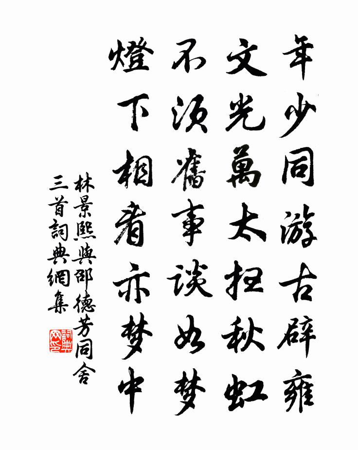 詩詞名句歷史字典書法欣賞書法字典國語詞典說文解字康熙字典古漢語字典標 題 作 者 詩 句 與邵德芳同舍三首作者:林景熙 朝代:宋代與邵德芳同舍三首原文年少同游古辟雍,文光萬太掃秋虹。不須舊事談如夢,燈下相看亦夢中。詩詞問答問:與邵德芳同舍三首的作者是誰?答:林景熙問:與邵德芳同舍三首寫於哪個朝代?答:宋代林景熙與邵德芳同舍三首書法欣賞與邵德芳同舍三首書法作品詩詞推薦十絕句呈章茂深安撫陳造〔宋代〕右史文章海倒流,淮南異政古人儔。親聞撫幾推雙美,獨向夫君放一頭。元豐己未三院東閣作元豐戊午夏予尹京治陳蘇頌〔宋代〕防人不善自為謀,對吏方知口起羞。本為追胥寬逮系,何期僚屬致增尤。溺灰竟欲焚安國,書牘誰將念絳侯。惟有挽余正叔趙蕃〔宋代〕半生初未識,一見驟相親。九曲泛舟日,紫溪沽酒晨。我曹俱蹇薄,吾子固真醇。竟爾縈何疾,胡為遽沒身。聖人之孝十首武王林同〔宋代〕經言事父孝,所以事天明。疾間加再飯,夢中與九齡。春夜雪再用韻十首楊公遠〔宋代〕瓊林玉樹競奢華,老眼光搖眩有花。莫是幻成銀 * ,樓台勝處梵王家。題筆架山積翠樓白玉蟾〔宋代〕萬頃平田指掌間,松梢直上與檐乾。雲粘暮色月華濕,樹顫秋聲天籟寒。窗外好山千翡翠,屋頭修竹萬琅玕。樓中游日山錢暄〔宋代〕清晨渡水陟秋山,日上高原葉葉丹。已傍松筠尋磴道,更瞻台殿倚層巒。梁間雲氣蒸衣潤,窗外嵐光照席寒。顧我詠主人壁上畫鶴寄喬主簿崔著作陳子昂〔唐代〕古壁仙人畫。丹青尚有文。獨舞紛如雪。孤飛暖似雪。自矜彩色重。寧憶故池群。江海聯翩翼。長鳴誰復聞。秋居幽興王禹偁〔宋代〕謫居人事慵,幽興與誰同。僧到烹秋菌,兒啼索草蟲。掃苔留嫩綠,寫葉惜殘紅。歲晏琴罇好,籬邊有菊叢。劉晁之家園六詠浸碧姜特立〔宋代〕澄潭喬木插晴煙,樹影溪光相接連。我欲呼兒操小艇,醉時坐看水中天。春暮書房陳宓〔宋代〕春晴無十日,秉燭亦須游。冷笑鯫生面,黐粘蠹簡頭。方殫義理樂,蚤覺鬢髯秋。幾欲拋書坐,痴成不自由。避地傷春六絕句葛立方〔宋代〕洛陽宮闕半成灰,草草花枝濺淚開。國色開香訊息斷,妝檯誰奉紫金杯。詠瀑布馮雲山〔清代〕穿天透地不辭勞,到底方知出處高。溪澗焉能留得住,終須大海作波濤。寄題蕭民望扶疏堂二首楊萬里〔宋代〕不栽繁杏試晴紅,不種垂楊拂暖茸。堂下生涯無一物,月中修竹雪中松。情詩其二十七倉央嘉措〔清代〕柳枝經風葉未凋,當時愁損畫眉鳥。今日重入歌舞地,逢見卿卿又魂銷。和張功父梅詩十絕句楊萬里〔宋代〕不是春光不早回,卻緣春雪勒疏梅。詩人縰有催花手,有雪堪推花只推。合流河堤上亭子梅堯臣〔宋代〕隔河桑榆晚,藹藹明遠川。寒漁下灘時,翠鳥飛我前。山藥植瑣細,野性仍所便。令人思濠上,獨詠莊叟篇。施明可自湘潭還霅川以詩編相示摘其中重陽一程公許〔宋代〕倦遊保似雁隨陽,愁緒知添幾線長。歸路驛梅多未破,吟邊汀芷藹余香。寄聲鷗路舊同社,可奈鷖鳧紛著行。乞與水調歌頭(五首選三)張惠言〔清代〕東風無一事,妝出萬重花。閒來閱遍花影,椎有月鉤斜。我有江南鐵笛,要倚一枝香雪,吹徹玉城霞。清影渺難即楊柳詞四解宋祁〔宋代〕垂楊無態不堪夸,猶有餘情解作花。三月紛紛飛似雪,白門啼殺叛兒鴉。名句推薦翠娥執手送臨歧,軋軋開朱戶柳永《採蓮令·月華收》 對菱花、與說相思,看誰瘦損。陸叡《瑞鶴仙·梅》 後夜相思,塵隨馬去,月逐舟行。劉過《柳梢青·送盧梅坡》 輕陰池館水平橋,一番弄雨花梢。陳子龍《畫堂春·雨中杏花》 大凡物不得其平則鳴韓愈《送孟東野序》 其旨遠,其辭文,其言曲而中,其事肆而隱。佚名《易傳·繫辭傳下·第六章》 漢家天子今神武,不肯和親歸去來。王之渙《涼州詞二首》 舉棋不定,不勝其耦。左丘明《左傳·襄公·襄公二十五年》 馬嘶人散後,秋風換、故園夢裡。吳文英《丁香結·夷則商秋日海棠》 秦樓月,年年柳色,灞陵傷別。李白《憶秦娥·簫聲咽》