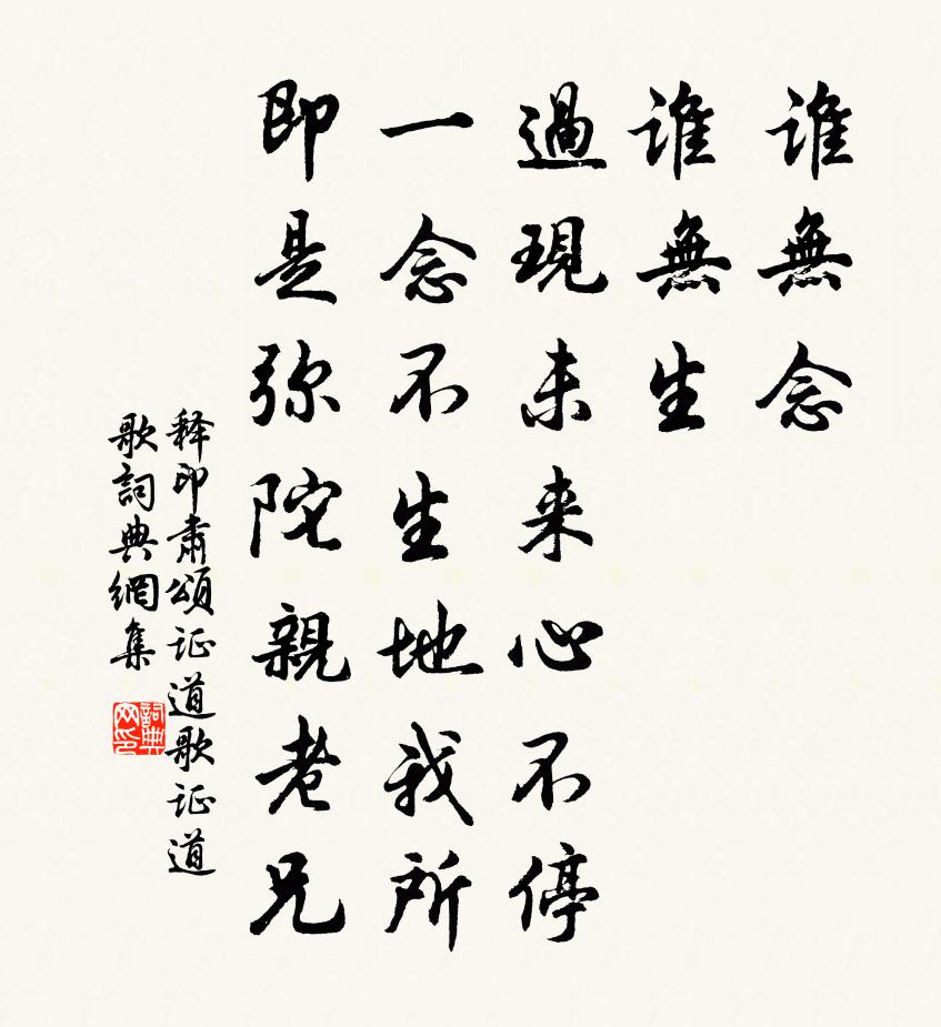 詩詞名句歷史字典書法欣賞書法字典國語詞典說文解字康熙字典古漢語字典標 題 作 者 詩 句 頌證道歌證道歌作者:釋印肅 朝代:宋代頌證道歌證道歌原文誰無念,誰無生,過現未來心不停。一念不生地我所,即是彌陀親老兄。詩詞問答問:頌證道歌證道歌的作者是誰?答:釋印肅問:頌證道歌證道歌寫於哪個朝代?答:宋代釋印肅頌證道歌證道歌書法欣賞頌證道歌證道歌書法作品詩詞推薦飲酒 其七陶淵明〔魏晉〕秋菊有佳色,裛露掇其英。汎此忘憂物,遠我遺世情。一觴雖獨進,杯盡壺自傾。日入群動息,歸鳥趨林鳴。嘯傲京都元夕元好問〔金代〕袨服華妝著處逢,六街燈火鬧兒童。長衫我亦何為者,也在遊人笑語中。感事二首張耒〔宋代〕自古衣食勤,物生無時閒。春耕望時雨,厚土常苦幹。舉頭呼天公,天遠安得聞。幸此中夜雨,瀟瀟灑中田。天人汪務玄降睡有作張繼先〔宋代〕萬籟沉沉丹滿空,一枰初勝務玄翁。金壺飲罷前村酒,玉軫閒歌太古風。羨我無眠神已爽,笑渠貪睡意何濃。回頭偈頌三十四首釋如淨〔宋代〕筆頭禿盡一毫通,至治寥寥靜極中。點起風雲傳號令,雷霆潑墨振綱宗。游亭晚酌趙崇潔〔宋代〕一樽對酌晚臨溪,詩景撩人興不迷。風約灘聲侵座冷,月移花影落檐低。銀箋白雪心先吐,玉斝黃流手漫提。自慶古態陸龜蒙〔唐代〕古態日漸薄,新妝心更勞。城中皆一尺,非妾髻鬟高。酬孫侍御春日見寄盧綸〔唐代〕經過里巷春,同是謝家鄰。顧我覺衰早,荷君留醉頻。松高猶覆草,鶴起暫縈塵。始悟達人志,患名非患貧。壽春進祝聖七首守在四夷貫休〔唐代〕天將興大蜀,有道遂君臨。四塞同諸子,三邊共一心。闍婆香似雪,回鶻馬如林。曾讀前皇傳,巍巍冠古今。江亭鄧深〔宋代〕村舍隨山遠,沙寮傍岸還。輕煙魚復浦,殘雪手巾山。句李邴〔宋代〕柳老拋綿後,梅酸著骨時。觀社楊萬里〔宋代〕作社朝祠有足觀,山農祈福更迎年。忽然簫鼓來何處,走殺兒童最可憐。虎面豹頭時自顧,野謳市舞各爭妍。王侯代人送常州致仕張待制王令〔宋代〕心貪進退適全宜,上印飛書劇去翬。薦口不加張柬老,明朝竟放孔戣歸。黃堂合有遺思在,青史還留後世稀。此去登州中新閣詩庾信〔南北朝〕跨虛凌倒景。連雲詎少陽。璇極龍鱗上。雕甍鵬翅張。千尋文杏照。十里木蘭香。開窻對高掌。平坐望河梁。歌響自詠李少和〔宋代〕寶珠探妙得真宗,五色分明煥太空。解下連環竟超越,郁羅深處宴鴻蒙。和象翁絕句衛宗武〔宋代〕浮生一夢寄南柯,烏兔雙馳迅若梭。世事如棋如幾變,捄時無著奈時何。題劉夷叔詩稿後釋寶曇〔宋代〕蜜蜂於花似不薄,肥出兩股中邊甜。嗅香嚼蠟總風味,不損花艷何其廉。劉郎平生墮香國,老鬢不下花飛粘。可憐棲賢寺王士禎〔清代〕李渤讀書處,乃在棲賢谷。何年作招提,來尋愜幽獨。僧舍如蜂房,高下傅山麓。雲來漢陽峰,時就檐下宿。古寺四禽周必大〔宋代〕人言百舌巧,暑至輒無聲。不如鳩雖拙,四時知陰晴。提壺勸我飲,我醉誰解酲。布穀獨可聽,要當早歸耕。登雲錦閣有感錢聞詩〔宋代〕五老峰前一醉休,長空目斷水雲浮。要將心地同山色,莫放煙嵐翳上頭。名句推薦明眸皓齒誰復見,只有丹青余淚痕。蘇軾《虢國夫人夜遊圖》 但責己,不責人,此遠怨之道也王永彬《圍爐夜話·第八五則》 微風搖紫葉,輕露拂朱房。沈約《詠芙蓉》 芳菲歇。故園目斷傷心切。向子諲《秦樓月·芳菲歇》 秋逼暗蟲通夕響,征衣未寄莫飛霜。張仲素《秋夜曲》 半壁橫江矗起,一舟載雨孤行。歸莊《錦堂春·半壁橫江矗起》 漢兵已略地,四方楚歌聲。虞姬《和項王歌》 故人何在,煙水茫茫。柳永《玉蝴蝶·望處雨收雲斷》 林下春晴風漸和,高崖殘雪已無多。王守仁《春晴》 使君宏放,談笑洗盡古今愁。陸游《水調歌頭·多景樓》