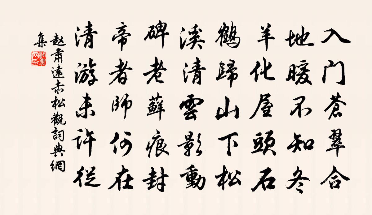 詩詞名句歷史字典書法欣賞書法字典國語詞典說文解字康熙字典古漢語字典標 題 作 者 詩 句 赤松觀作者:趙肅遠 朝代:宋代赤松觀原文入門蒼翠合,地暖不知冬。羊化屋頭石,鶴歸山下松。溪清雲影動,碑老蘚痕封。帝者師何在,清游未許從。詩詞問答問:赤松觀的作者是誰?答:趙肅遠問:赤松觀寫於哪個朝代?答:宋代趙肅遠赤松觀書法欣賞赤松觀書法作品詩詞推薦臨江仙(戲為期思詹老壽)辛棄疾〔宋代〕手種門前烏臼樹,而今千尺蒼蒼。田園只是舊耕桑。杯盤風月夜,簫鼓子孫忙。七十五年無事客,不妨兩鬢如霜。題壽安甘棠館二首劉禹錫〔唐代〕公館似仙家,池清竹徑斜。山禽忽驚起,沖落半岩花。門前洛陽道,門裡桃花路。塵土與煙霞,其間十餘步。宿登山樓鑰〔宋代〕竹輿來訪小梅山,山在空濛紫翠間。嵐霧滿林朝漠漠,溪聲和雨夜潺潺。峰頭丹井隨潮信,松下禪房舊祖關。誰是和叔夏水仙時見於宣卿坐上叔夏折一枝以歸八胡寅〔宋代〕葉是青霞剪作衣,花如靜女不爭時。豈應更浥薔薇露,撩得窺園不下帷。游安樂山任伋〔宋代〕安樂溪上峰,萬木森翠羽。孤撐切天心,橫拓壓刊股。氣勢西吞夷,光芒南定楚。雲泉出石竇,淋漓灑玉宇。煙蘿金陵十二釵正冊——賈元春曹雪芹〔清代〕二十年來辨是非,榴花開處照官闈。三春爭及初春景,虎兔相逢大夢歸。戊戌冬仆客桂林雪中趙叔愚書張司業逢賈島絕樂雷發〔宋代〕朔風於水浸瓊沙,曾共騷翁理釣槎。對酒又吟端木葉,論詩還憶款冬花。飢能驅我瓶儲罄,老不饒人鏡影華。擬喚即事章甫〔宋代〕俯仰憐身世,飄零玩歲時。道途多異說,客子有新詩。日落乾坤慘,風生草木悲。高樓空北望,清淚不勝垂。過九里灣二首錢時〔宋代〕溶溶泛日桃溪浪,濯濯拋風柳岸春。天地十分和氣裹,此時無語倚蓬人。次韻張季長紅梅七言三首李壁〔宋代〕江路悠悠無驛使,道南特寄愜公心。似嫌大潔驚凡卉,故染輕紅伴醉吟。絕艷偷春來雪徑,絳葩翻露出瓊淋。病餘相見歡朱敦儒〔宋代〕當年兩上蓬瀛。燕殊庭。曾共群仙攜手、斗吹笙。雲濤晚。霓旌散。海鷗輕。卻釣松江煙月、醉還醒。漁父詞(其二)薛師石〔宋代〕鄰家船上小姑兒。相問如何是別離。雙墜髻,一灣眉。愛看紅鱗比目魚。偈頌八十五首釋妙倫〔宋代〕禪禪,斷貫索左穿右穿。道道,生苕菷橫掃豎掃。用韻謝諸客和章文天祥〔宋代〕傳鼓發船去,我秦君向湘。持螯思太白,占鵲問東方。世味秋雲薄,交情江水長。相期天路曉,陣馬度風檣。岷江愁二首挽陳持中知府郎中嫂恭人葉適〔宋代〕岷江諸峰如獻酬,岷江潭頭紺碧流。不愁水生勸人去,只愁人死送山林。游洪福寺孔武仲〔宋代〕清晨戒童僕,匹馬出皇州。欲探逍遙趣,因成爛漫遊。藤蘿回書暝,雲雨送春愁。傍近緋桃塢,尋春亦少留。和吳九王二十八雪詩韓維〔宋代〕方冬氣潛溫,得晚陰始重。狂隨風力翻,怒若雲面涌。中微玉霏屑,後盛毛紛氄。寒光動城闕,甘滋入田壟。鵬騫戴肖望輓詞葉適〔宋代〕岩岩蕭太傅,謇謇鄭尚書。可惜流光晚,翻無急詔除。交情梅蕊盡,哀意柳芽疎。只有安江滿,長涵夜月虛。至端州驛見杜五審言沈三佺期閻五朝隱王二無競題壁慨然宋之問〔唐代〕逐臣北地承嚴譴,謂到南中每相見。豈意南中岐路多,千山萬水分鄉縣。雲搖雨散各翻飛,海闊天長音信稀。處處挽薛艮齋二首徐嘉言〔宋代〕卓犖才名四十秋,屢攄良策動宸旒。傾河議論誰能敵,唾手功勳未肯休。方快九霄摶鸑鷟,俄驚長坂蹶驊騮。天公名句推薦秋容淺淡映重門,七節攢成雪滿盆。曹雪芹《詠白海棠》 歌聲未盡處,先淚零周邦彥《綺寮怨·上馬人扶殘醉》 若耶溪傍採蓮女,笑隔荷花共人語。李白《採蓮曲》 清明過了,不堪回首,雲鎖朱樓。朱淑真《眼兒媚·風日遲遲弄輕柔》 試問閒愁都幾許?賀鑄《青玉案·凌波不過橫塘路》 世人解聽不解賞,長飆風中自來往。李頎《聽安萬善吹觱篥歌》 父母呼,應勿緩。父母命,行勿懶。李毓秀《弟子規·入則孝》 小舟橫截春江,臥看翠壁紅樓起。蘇軾《水龍吟·閭丘大夫孝終公顯嘗守黃州》 教子弟求顯榮,不如教子弟立品行。王永彬《圍爐夜話·第四五則》 峰巒如聚,波濤如怒,山河表里潼關路。張養浩《山坡羊·潼關懷古》