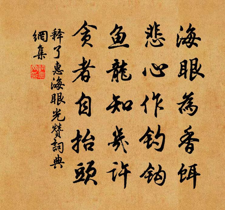 詩詞名句歷史字典書法欣賞書法字典國語詞典說文解字康熙字典古漢語字典標 題 作 者 詩 句 海眼光贊作者:釋了惠 朝代:宋代海眼光贊原文海眼為香餌,悲心作釣鉤。魚龍知幾許,貪者自抬頭。詩詞問答問:海眼光贊的作者是誰?答:釋了惠問:海眼光贊寫於哪個朝代?答:宋代釋了惠海眼光贊書法欣賞海眼光贊書法作品詩詞推薦送周魯日辰州法曹陳傅良〔宋代〕團欒妻子是誰家,獨被飢驅天一涯。遠地豈無人晤語,長才能免世驚嗟。好於書作千年計,勿為官驅兩鬢華。為問高士詠楚狂接輿夫妻吳筠〔唐代〕接輿耽沖玄,伉儷亦真逸。傲然辭徵聘,耕績代祿秩。鳳歌誡文宣,龍德遂隱密。一游峨嵋上,千載保靈術。出塞曲陸游〔宋代〕千騎為一隊,萬騎為一軍,朝踐狼山雪,暮宿榆關雲。將軍羽箭不虛發,直到祁連無雁群。隆隆春雷收陣鼓,蜿蜿韋員外家花樹歌岑參〔唐代〕今年花似去年好,去年人到今年老。始知人老不如花,可惜落花君莫掃。君家兄弟不可當,列卿御史尚書郎。朝回和陳器之詩四首過韓城張耒〔宋代〕周京無人吊禾黍,七雄按劍分周土。秦人匹馬出函關,六王割地愁為虜。宜陽古堞故韓都,地接強秦爭戰苦。謀窮對竹丘葵〔宋代〕此君無媚色,耿耿合予衷。外直形容瘦,中虛忿慾空。炎涼多變熊,瀟瀟獨清風。倖免斧斤患,蒼然保令終。寄衡陽尉徐智伯三首曾豐〔宋代〕刺眼縣門柳,縈心家圃梅。懶為彭澤住,羞見督郵來。藉有湯行聘,要無石作媒。吾非痴謝令,自去不須推。北風張耒〔宋代〕北風捲地寒侵骨,凍雪連山鳥不飛。試問朱門余酒肉,幾人回首念無衣。門前松棚汪若楫〔宋代〕突兀山邊屋數間,每嫌斜照上闌乾。當門只得添松蓋,未到秋來夜已寒。酒德孟郊〔唐代〕酒是古明鏡,輾開小人心。醉見異舉止,醉聞異聲音。酒功如此多,酒屈亦以深。罪人免罪酒,如此可為箴。送道士薛季昌還山李隆基〔唐代〕洞府修真客,衡陽念舊居。將成金闕要,願奉玉清書。雲路三天近,松溪萬籟虛。猶期傳秘訣,來往候仙輿。水調歌頭 和張都運李氏柳塘賞荷韻王旭〔元代〕我愛此塘好,碧水映紅蕖。垂楊裊裊煙籠,綠髮倩風梳。醫卻塵埃俗病,喚起滄浪幽興,懷抱一時舒。更把直鉤釣皇帝上平上皇帝壽樂曲三舉酒用瑞鶴之曲崔敦詩〔宋代〕彼肅者羽,名紀仙經。芝田下啄,容止安停。引吭警露,響徹青冥。聖德格物,來儀帝庭。次韻葉宰植竹四絕喻良能〔宋代〕蒼煙翠霧兩冥迷,秋雨叢深不作泥。冷葉寒枝須管領,亭亭會見拂雲齊。八歸 庚辰七夕,與衛立禮同用此調邵亨貞〔元代〕涼欺羽扇,風生蘄竹,秋意漸滿院落。商聲又過梧桐井,還誤剖瓜佳會,泛槎仙約。漫憶中庭兒女夜,幾*語、花題張許雙廟曾伋〔宋代〕國憑節義壯洪基,激厲頹風屬聖時。曾屈帝尊親降輦,可因祈福幸公祠。卜運算元慢(歇指調)張先〔宋代〕溪山別意,煙樹去程,日落采苹春晚。欲上征鞍,更掩翠簾相眄。惜彎彎淺黛長長眼。奈畫閣歡游,也學狂花亂絮偈頌一百二十三首釋普度〔宋代〕二大老,一人船行,一人步到。狹路相逢,掀眉一笑。又四首劉克莊〔宋代〕已藁忠言未及輸,豈知窮鬼迫臞儒。諸生蕝就漢朝野,一束芻留孺子湖。室有瓶儲聊自給,簾夸碗□□人沽。風濤寄遠田娥〔唐代〕憶昨會詩酒,終日相逢迎。今來成故事,歲月令人驚。淚流紅粉薄,風度羅衣輕。難為子猷志,虛負文君名。名句推薦金陵津渡小山樓,一宿行人自可愁。張祜《題金陵渡》 但得一片橘皮吃,莫便忘了洞庭湖。施耐庵《水滸傳·第二十四回》 望處雨收雲斷,憑闌悄悄,目送秋光。柳永《玉蝴蝶·望處雨收雲斷》 千古興亡多少事?悠悠。辛棄疾《南鄉子·登京口北固亭有懷》 西風酒旗市,細雨菊花天。歐陽修《秋懷》 親朋無一字,老病有孤舟。杜甫《登岳陽樓》 素娥無賴,西去曾不為人留。蘇轍《水調歌頭·徐州中秋》 火冷燈稀霜露下,昏昏雪意雲垂野。蘇軾《蝶戀花·密州上元》 誰愛風流高格調,共憐時世儉梳妝。秦韜玉《貧女》 未覺池塘春草夢,階前梧葉已秋聲。朱熹《偶成》