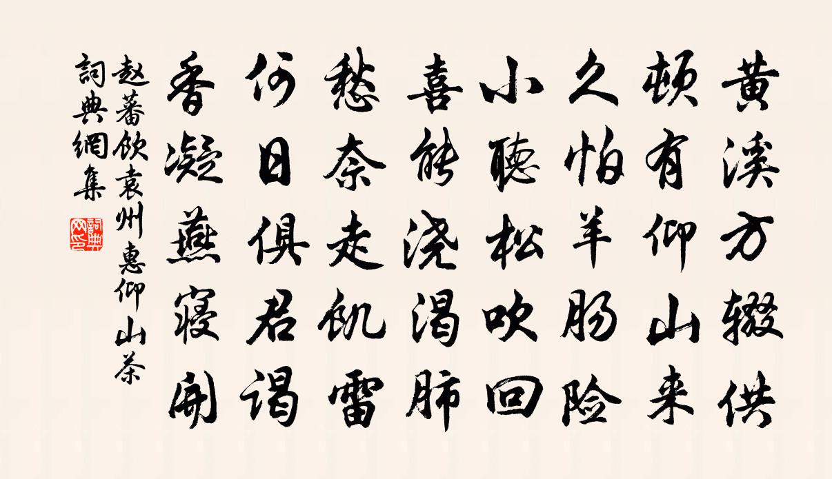 詩詞名句歷史字典書法欣賞書法字典國語詞典說文解字康熙字典古漢語字典標 題 作 者 詩 句 飲袁州惠仰山茶作者:趙蕃 朝代:宋代飲袁州惠仰山茶原文黃溪方輟供,頓有仰山來。久怕羊腸險,小聽松吹回。喜能澆渴肺,愁奈走飢雷。何日俱君謁,香凝燕寢開。詩詞問答問:飲袁州惠仰山茶的作者是誰?答:趙蕃問:飲袁州惠仰山茶寫於哪個朝代?答:宋代趙蕃飲袁州惠仰山茶書法欣賞飲袁州惠仰山茶書法作品詩詞推薦瑪瑙寶勝寺陳俞〔宋代〕雨霽佛屋明,苔逕深曲折。樹搖高露驚,草密暗泉咽。前林忽清磬,煙燈遠欲滅。寄謝塵中人,與君從此別。憶鹿鶴吳芾〔宋代〕山中鹿鶴久相疏,恨不歸來與汝俱。飛舞尚如前日否,奔騰還上後山無。不聞警露來庭下,猶想銜花近座隅。嘆我劉遜子架閣餉江茶方岳〔宋代〕琵琶亭下春寒夜,濕盡青衫竟為誰。江草江花恨何極,雪甌如此卻無詩。和平江府倪教授送行項安世〔宋代〕拜辭初下九天來,乞得斑衣學老萊。六月火雲烘去艇,三山風露隔飛埃。多情送我詩盈軸,何意辭君酒一杯。後夜螢王鎡〔宋代〕竹風吹動草根塵,熠熠高底自照身。每夜囊盛光到曉,書齋送輿少燈人。送鄉友歸釋文珦〔宋代〕青春欲盡時,鳥啼花亂飛。共起思鄉恨,君歸吾未歸。臨分重執手,老淚涇荷衣。贈同溪客張籍〔唐代〕幽居得相近,煙景每寥寥。共伐臨谿樹,因為過水橋。自教青鶴舞,分采紫芝苗。更愛南峰住,尋君路恐遙。寄趙青山同舍檔四首汪元量〔宋代〕謝傅東山喜劫棋,劉生南嶽怕聯詩。君侯自有通身膽,用舍行藏且順時。書蔡秀才屏風頌四首黃庭堅〔宋代〕讀經一字禮一拜,瘦骨稜稜心苦辛。看伊冷淡教人笑,定作閻浮百歲人。倦倚羅與之〔宋代〕蟬聲燕語細相和,池面才浮點點荷。倦倚闌乾消永日,葡萄陰薄柳風多。欲到東洛,得楊使君書,因以此報白居易〔唐代〕向公心切向財疏,淮上休官洛下居。三郡政能從獨步,十年生計復何如。使君灘上久分手,別駕渡頭先得書。且喜歲晚烹試小春建茶張栻〔宋代〕陽月藏春妙莫窺,靈芽粟粒露全機。煮泉獨啜寒窗夜,已覺東風天際歸。珙侍者之沔釋智愚〔宋代〕漢江漠漠向東流,摝蜆撈蝦休未休。蒲葉半凋秋著岸,子歸無口笑岩頭。九月初十日值宿玉堂七絕劉克莊〔宋代〕內廚進膳惟蔬素,御帕封香遍竹宮。明日金烏迎玉輅,始知聖主與天通。新栽竹魏野〔宋代〕蒼翠兩三枝,親和凍塊移。旋吟酬得處,就刻記栽時。已任雪頻灑,未禁風苦吹。幽人心自足,千畝復堪嗤。送陸君重五首方回〔宋代〕謂生無廉吏,吾猶見此人。政聲口碑在,陰德□□新。薄俗難開眼,亨途易致身。一清當百濁,端肯混光塵。用前韻答黃一翁二首王炎〔宋代〕緼袍敵狐裘,晚飯可當肉。諱窮竟未免,豈不愛儲蓄。嗜利顙有泚,恐愧王承福。財固禍之媒,越鄉忌懷玉。君看贈淨慈主人五首陳造〔宋代〕師似蜚雲未定居,我方薄宦走江湖。鼎山他日過從約,借問今猶記得無。偶題杜范〔宋代〕雪外亂山才約略,雨中平野更淒迷。有人支枕篷窗底,臥看群牛渡野溪。行香子張翥〔元代〕謝董糟丘。罷醉鄉侯。更開除、從事青州。長瓶盡臥,大白休浮。本欲成歡,翻引病,不銷愁。今日空喉。明日扶名句推薦金陵子弟來相送,欲行不行各盡觴。李白《金陵酒肆留別》 夜合花開香滿庭,夜深微雨醉初醒。竇叔向《夏夜宿表兄話舊》 君子遵道而行,半途而廢:吾弗能已矣。子思《中庸·第十一章》 家家乞巧望秋月,穿盡紅絲幾萬條。林傑《乞巧》 貧者士之常也,死者人之終也,處常得終,當何憂哉?列子及其弟子《列子·天瑞》 如來說諸心皆為非心是名為心。鳩摩羅什譯《金剛經·一體同觀》 白草黃沙。月照孤村三兩家。蔣氏女《減字木蘭花·題雄州驛》 請君試問東流水,別意與之誰短長。李白《金陵酒肆留別》 樹陰滿地日當午,夢覺流鶯時一聲。蘇舜欽《夏意》 桃李春風一杯酒,江湖夜雨十年燈。黃庭堅《寄黃幾復》