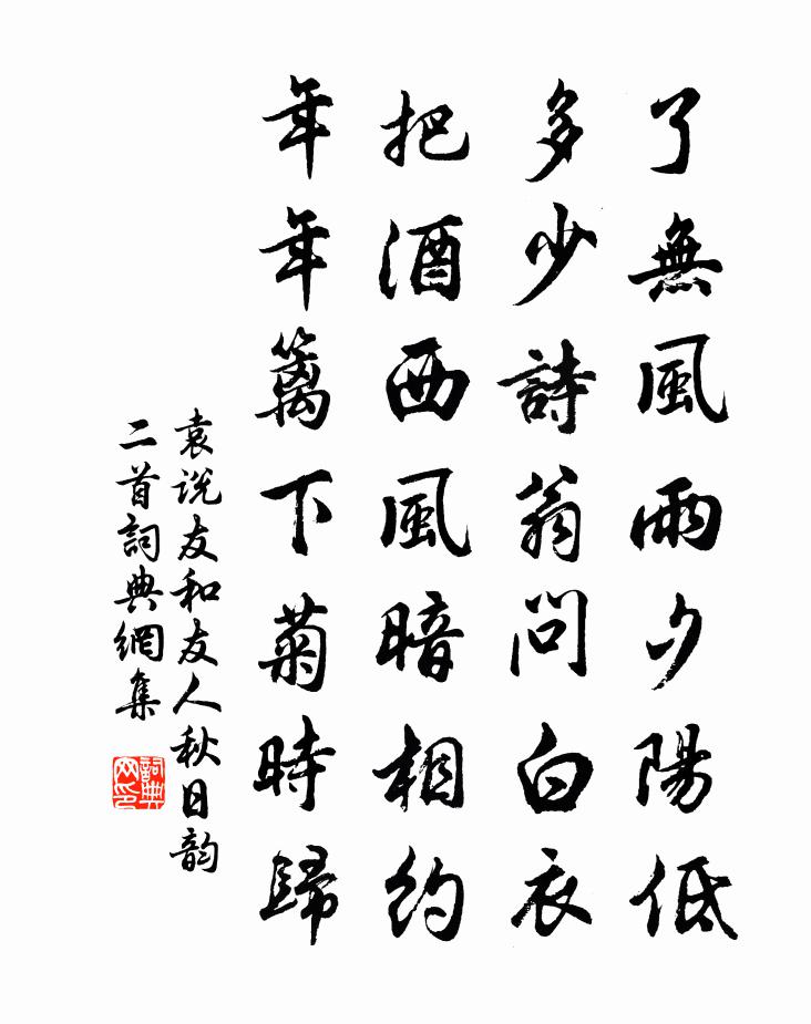 詩詞名句歷史字典書法欣賞書法字典國語詞典說文解字康熙字典古漢語字典標 題 作 者 詩 句 和友人秋日韻二首作者:袁說友 朝代:宋代和友人秋日韻二首原文了無風雨夕陽低,多少詩翁問白衣。把酒西風暗相約,年年籬下菊時歸。詩詞問答問:和友人秋日韻二首的作者是誰?答:袁說友問:和友人秋日韻二首寫於哪個朝代?答:宋代袁說友和友人秋日韻二首書法欣賞和友人秋日韻二首書法作品詩詞推薦過雪溪周南〔宋代〕晴溪帆卷艣聲柔,兩岸青紅濕未收。欲問三吳清絕處,碧瀾堂下採蓮舟。郢州贈別王八使君白居易〔唐代〕昔是詩狂客,今為酒病夫。強吟翻悵望,縱醉不歡娛。鬢髮三分白,交親一半無。郢城君莫厭,猶校近京都。奉使道中作歐陽修〔宋代〕客夢方在家,角聲已催曉;匆匆行人起,共怨角聲早。馬蹄終日踐冰霜,未到思回空斷腸。少貪夢裡還家樂,早起西山桐十詠桐葉陳翥〔唐代〕吾有西山桐,下臨百丈溪。布葉雖遲遲,庇根亦萋萋。密類張翠幄,青堪翦封圭。滑澤經日久,濡毳隨乾躋。近風夢中江行過鄉豪家賦詩二首既覺猶歷歷能記也陸游〔宋代〕蒲蓆乘風健,江潮帶雨渾。樹余梢纜跡,崖有刺篙痕。酒酹湘君廟,歌招屈子魂。客途嗟草草,無處采芳蓀。賀新郎(游西湖)葛長庚〔宋代〕倚劍西湖道。望瀰漫、蒼葭綠葦,翠蕪青草。華表淒涼市朝古,極目暗傷懷抱。秋色與、芰荷俱老。桂棹蘭舟聊遣送謝懷英道士歸廬山陳傅良〔宋代〕場屋收余策,匡廬寄一瓢。款門如有欲,委幣輒難招。菜甲留終夕, * 共小橋。崆峒他日問,應記說神霄。冬至前月赴季父梅花之集與韓蒲向憲唐乾諸人胡寅〔宋代〕好花不恨好詩遲,國色須蒙國士知。漫比玉容歌璧月,空將鷺羽斗瓊枝。旁無綽約天仙對,中有甘酸鼎味宜。聞說偈頌一百二十三首釋祖欽〔宋代〕四月八,生悉達。九龍吐水浴金軀,雲門一捧要打殺。水調歌頭(為施少儀作)黃機〔宋代〕此日足可惜,心事正崔嵬。江淮踏遍,經歲相識定誰來。每向酒邊長嘆,更向花邊長笑,意慮叵能猜。邂逅忽相遇南歌子(代張仲宗賦)向子諲〔宋代〕碧落飛明鏡,晴煙冪遠山。扁舟夜下廣陵灘。照我白苹紅蓼、一杯殘。初望同盤飲,如何兩處看。遙知香霧濕雲鬟夷門汪遵〔唐代〕晉鄙兵回為重難,秦師收旆亦西還。今來不是無朱亥,誰降軒車問抱關。湖西雜感詩釋智圓〔宋代〕月照閒軒虧復盈,吉凶消長勢相傾。須知人事同天道,寵辱由來盡可驚。雜題二首張耒〔宋代〕蒼蒼落月井梧西,睡覺幽人自卷帷。只有林鶯知夢斷,曉庭人靜語移時。代李居士謁王去非制乾三首劉宰〔宋代〕家山目斷古幽州,百口來歸路阻修。丁字無端輕介胃,蟬冠卻羨出兜鍪。箕裘忍墜先人業,甔石誰客子謀。不惜飢中秋夜月黃庶〔宋代〕人間共賞中秋月,酒社詩家意味長。天上必應霜露早,桂叢凋盡飽青光。偈頌一百二十三首釋普度〔宋代〕一佛出世,祥光布地。一念萬年,壽山增翠。曉來風起滿庭香,吹綻蟠桃三五蕊。秋日將歸長安留別王尚書喻鳧〔唐代〕朔漠正秋霖,西風傳夕砧。滄洲未歸跡,華發受恩心。露色岡莎冷,蟬聲塢木深。清晨鈇鉞內,只獻白雲吟。沁園春(壽韋軒八十一歲·九月初二)佚名〔宋代〕 * 十翁,似嬰兒戲,漢司馬遷。記渭川垂釣,一年之長,龍山吹帽,七日之前。口角春風,襟期秋月,萬事從來賀新涼(壽壑相母夫人)張榘〔宋代〕萸菊香凝霧。記重陽、才經三日,帨懸朱戶。紫殿玉垣稱壽斝,瀲灩瓊花清露。正萬里、塵清淮浦。地寶從來標瑞名句推薦六曲闌乾偎碧樹,楊柳風輕,展盡黃金縷。馮延巳《鵲踏枝·清明》 凡令之行也,必待近者之勝也,而令乃行。管仲《管子·重令》 應酬都不暇,一嶺是梅花。張道洽《嶺梅》 去年米貴闕軍食,今年米賤大傷農。杜甫《歲晏行》 日日望鄉國,空歌白薴詞。張籍《薊北旅思 / 送遠人》 落葉委埏側,枯荄帶墳隅。潘安《悼亡詩三首》 東風有恨致玄都,吹破枝頭玉,夜月梨花也相妒。周文質《小桃紅·詠桃》 玉樓金闕慵歸去,且插梅花醉洛陽朱敦儒《鷓鴣天·西都作》 乍咽涼柯,還移暗葉,重把離愁深訴王沂孫《齊天樂·蟬》 不是花中偏愛菊,此花開盡更無花。元稹《菊花》