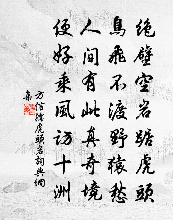 詩詞名句歷史字典書法欣賞書法字典國語詞典說文解字康熙字典古漢語字典標 題 作 者 詩 句 虎頭岩作者:方信孺 朝代:宋代虎頭岩原文絕壁空岩踞虎頭,鳥飛不渡野猿愁。人間有此真奇境,便好乘風訪十洲。詩詞問答問:虎頭岩的作者是誰?答:方信孺問:虎頭岩寫於哪個朝代?答:宋代方信孺虎頭岩書法欣賞虎頭岩書法作品詩詞推薦贈談數陳改之艾性夫〔宋代〕投老江南黃葉村,菊花時節雨昏昏。矮窗孤夢正欹枕,拄杖一聲誰打門。三字頭銜康節數,一編心易華山孫。吾年訴衷情沈蔚〔宋代〕深深院宇小池塘。一徑碧梧長。青春又歸何處,新筍綠成行。多少事,惱人腸。懶思量。香消一炷,睡起霎時,日書城北尼庵二首陳造〔宋代〕小搖蛇影鳥驚墮,已落背毛牛自如。瞢欲分朋慚老病,與渠甘作典籌舒。秋思堙郁忽蒙圓機寵示祟賦欣然開豁為惠大矣晁說之〔宋代〕秋霜先著白髯翁,始信讀書未有功。幽恨不隨流水去,壯懷每共暮雲空。敢嗟落葉留無術,但惜巢危死孰從。賴有呈何縣丞趙蕃〔宋代〕古屋無多客掛包,占風政類鳥居巢。誰能故賦感不遇,亦莫空書廣絕交。開闔屢搖塵戶牡,{戛中加冖}磨時裊竹減字木蘭花劉志淵〔元代〕忘機索妙。萬法皆空心上了。無徼無邊。一片清光萬里天。明明淨體。不放星塵蠅點翳。內外圓融。正住空空法界題浯溪李祐孫〔宋代〕明皇何以倒顛危,林甫國忠成禍基。妃子良心猶不悟,此機惟有九齡知。再游頭陀寺李涉〔唐代〕無因暫泊魯陽戈,白髮兼愁日日多。只恐雪晴花便盡,數來山寺亦無他。宋玉對楚王問宋玉〔先秦〕楚襄王問於宋玉曰:“先生其有遺行與?何士民眾庶不譽之甚也!” 宋玉對曰:“唯,然,有之!願大王寬其上知府大同王太尉六首魏野〔宋代〕子細曾看九老圖,科名官職盡難如。更思呂望同君歲,猶自磻溪坐釣魚。摸魚子 早春作謝應芳〔元代〕看東風、柳搖金縷。精神頓美如許。獨憐老我雙蓬鬢,無復少年張緒。桃葉渡。任山水清妍,可柰非吾土。借人茅春晚陸游〔宋代〕五十六翁身百憂,年來轉覺此生浮。山川信美故鄉遠,天地無情雙鬢秋。社後燕如歸客至,春殘花不為人留。一觴得王介甫常州書梅堯臣〔宋代〕斜封一幅竹膜紙,上有文字十七行。字如瘦棘攢黑刺,文如溫玉爛虹光。別時春風吹榆莢,及此已變蒹葭霜。道途偈頌二百零五首釋正覺〔宋代〕不是心,不是物。非天非人,非僧非俗。南北東西莫我尋,長短方圓莫我測。牛飲星河,兔眠月窟,徹底靈明破昏贈李愬僕射王建〔唐代〕唐州將士死生同,盡逐雙旌舊鎮空。獨破淮西功業大,新除隴右世家雄。知時每笑論兵法,識勢還輕立戰功。次第過沈氏山居錢起〔唐代〕雞鳴孤煙起,靜者能卜築。喬木出雲心,閒門掩山腹。貧交喜相見,把臂歡不足。空林留宴言,永日清耳目。泉聲秋出近郊宋庠〔宋代〕修邙才轉便維嵩,都占黃河小曲中。秋助峰巒相倚碧,日催梨棗一番紅。煙蕪雖歇猶藏野,霜葉能飛不待風。關輔洛陽春吟邵雍〔宋代〕桃李花開人不窺,花時須是牡丹時。牡丹花發酒增價,夜半遊人猶未歸。送李明府赴連州韓翃〔唐代〕萬里向南湘,孤舟入桂陽。諸侯迎上客,小吏拜官郎。春服橦花細,初筵木槿芳。看承雨露速,不待荔枝香。綿州錄參廳觀姜楚公畫鷹少陵為作詩者陸游〔宋代〕我來訪古涪之濱,不辭百岡冀一真。走馬朝尋海棕館,斫膾夜醉魴魚津。越王高樓亦已換,俯仰今古堪悲辛。督郵名句推薦目不能兩視而明,耳不能兩聽而聰。荀子《荀子·勸學》 執一者至貴也,至貴者無敵。呂不韋《呂氏春秋·覽·離俗覽》 更可惜,雪中高樹,香篝熏素被。周邦彥《花犯·小石梅花》 臣無隱忠,君無蔽言,國之祿也。劉向《戰國策·趙二·武靈王平晝閒居》 獨有宦遊人,偏驚物候新。杜審言《和晉陵陸丞早春遊望》 日照香爐生紫煙,遙看瀑布掛前川。李白《望廬山瀑布》 萬里悲秋常作客,百年多病獨登台。杜甫《登高》 明歲秋風知再會,暫時分手莫相思。曹雪芹《殘菊》 何意更觴昌歜酒,為君擊節一長歌。趙蕃《端午三首》 桐花半畝,靜鎖一庭愁雨。周邦彥《瑣窗寒·寒食》