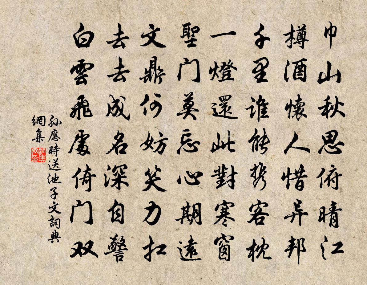 詩詞名句歷史字典書法欣賞書法字典國語詞典說文解字康熙字典古漢語字典標 題 作 者 詩 句 送池子文作者:孫應時 朝代:宋代送池子文原文巾山秋思俯晴江,樽酒懷人惜異邦。千里誰能攜客枕,一燈還此對寒窗,聖門莫忘心期遠,文鼎何妨笑力扛。去去成名深自警,白雲飛處倚門雙。詩詞問答問:送池子文的作者是誰?答:孫應時問:送池子文寫於哪個朝代?答:宋代孫應時送池子文書法欣賞送池子文書法作品詩詞推薦子駿游沙溪洞文同〔宋代〕聞有沙溪洞,公將核使輪。還如探禹穴,應見避秦人。石繖形容古,琳房氣象春。若逢丹輦客,問取虎文巾。偈頌七十二首釋祖欽〔宋代〕量外機,格外句。凡聖 * ,佛祖罔措。有來由,無本據,聲前切忌錯舉。頌古十六首釋明辯〔宋代〕人人有個生緣,從來罪大彌天。不是牽犁拽把,便須鼎鑊油煎。天台邵明府履病況遺牡丹各賦一絕林表民〔宋代〕一春苦雨又憂花,爛盡秧根榖再芽。見說雲頭紅可喜,老宵猶恐是朝霞。回鄉偶書二首賀知章〔唐代〕少小離鄉老大回,鄉音難改鬢毛衰。兒童相見不相識,笑問客從何處來。離別家鄉歲月多,近來人事半銷磨。唯有和姚山長一甫陳杰〔宋代〕潭影悠悠白日閒,千年如畫此江山。高人徐孺死已朽,上疏梅仙去不還。底是憂堪埋地下,誰能遠不在人間。相逢雨中題壁張耒〔宋代〕去年此日泊瓜州,衰柳蕭蕭系客舟。白髮天涯嘆流落,今年對雨古宣州。初夏登北山衛宗武〔宋代〕推篷數峰出,野色弄新晴。雷復陽初長,雪消山更青。嶺坳孤塔露,木杪片雲生。何日塵緣了,來尋猿鶴盟。頌古十六首釋道寧〔宋代〕思量有個悟因由,萬疊雲山障路頭。更話煎茶並掃地,泥中洗土轉添愁。次韻凌義山二首楊公遠〔宋代〕自憐老境漸侵尋,檢點頭顱雪旋深。無酒澆愁還獨嘯,有時得句但長吟。一天月色涵秋意,四壁蛩聲惱客心。好是如夢令(宮詞)孫道絢〔宋代〕翠柏紅蕉影亂。月上朱欄一半。風自碧空來,吹落歌珠一串。不見。不見。人被繡簾遮斷。示弟許渾〔唐代〕自爾出門去,淚痕長滿衣。家貧為客早,路遠得書稀。文字何人賞,煙波幾日歸。秋風正搖落,孤雁又南飛。寄潼川漕虞齊年邵博〔宋代〕盡略威嚴拊困窗,使車三出未論功。交遊善者疑多可,節義臨之凜不同。惜我已生前輩後,求君須向古人中。北堂題義公禪房孟浩然〔唐代〕義公習禪寂,結宇依空林。戶外一峰秀,階前眾壑深。夕陽連雨足,空翠落庭陰。看取蓮花淨,方知不染心。貴溪徐氏招隱園昔王表避亂居此山依之者數千晁補之〔宋代〕鬼谷西來一丈清,三山箕拱慰高情。時平尚欲依王表,南斗逍遙畢此生。贈無相禪師羅隱〔唐代〕人人盡道事空王,心裡忙於市井忙。惟有馬當山上客,死門生路兩相忘。宴桃源·頻日雅歡幽會白居易〔唐代〕頻日雅歡幽會,打得來來越殺。說著暫分飛,蹙損一雙眉黛。無奈,無奈,兩個心兒總待。謝高縣尹釋雲岫〔宋代〕家家戶戶擎拳拜,一邑三鄉無枉情。百里襟懷秋水淨,風生波浪月生明。白日晁公溯〔宋代〕白日寒無色,黃流漲未平。雲低催夕暝。江濁污秋清。尚覺物多累,敢期詩有聲。窮愁今至骨,書或似虞卿。嵩山十二首玉女窗歐陽修〔宋代〕玉女不可邀,蒼崖郁迢直。石乳滴空竇,仰見泬寥碧。徙倚難久留,桂樹含春色。名句推薦雖萬被戮,豈有悔哉!班固《漢書·傳·司馬遷傳》 報國無門空自怨,濟時有策從誰吐。吳潛《滿江紅·送李御帶珙》 明者防於無形,治者制其未亂魏徵《隋書·列傳·卷四》 機心信隱,交接靡密,庶下者知威而畏也。來俊臣《羅織經·治下卷第三》 一夜雨聲涼到夢,萬荷葉上送秋來。陳文述《夏日雜詩》 臥聞兒女夸翁健,詩句年光一樣新劉克莊《戊午元日二首》 首夏猶清和,芳草亦未歇。謝靈運《游赤石進帆海》 霜降碧天靜,秋事促西風。葉夢得《水調歌頭·九月望日與客習射西園余偶病不能射》 為問花何在,夜來風雨,葬楚宮傾國。周邦彥《六醜·落花》 笑殺陶淵明,不飲杯中酒。李白《嘲王歷陽不肯飲酒》