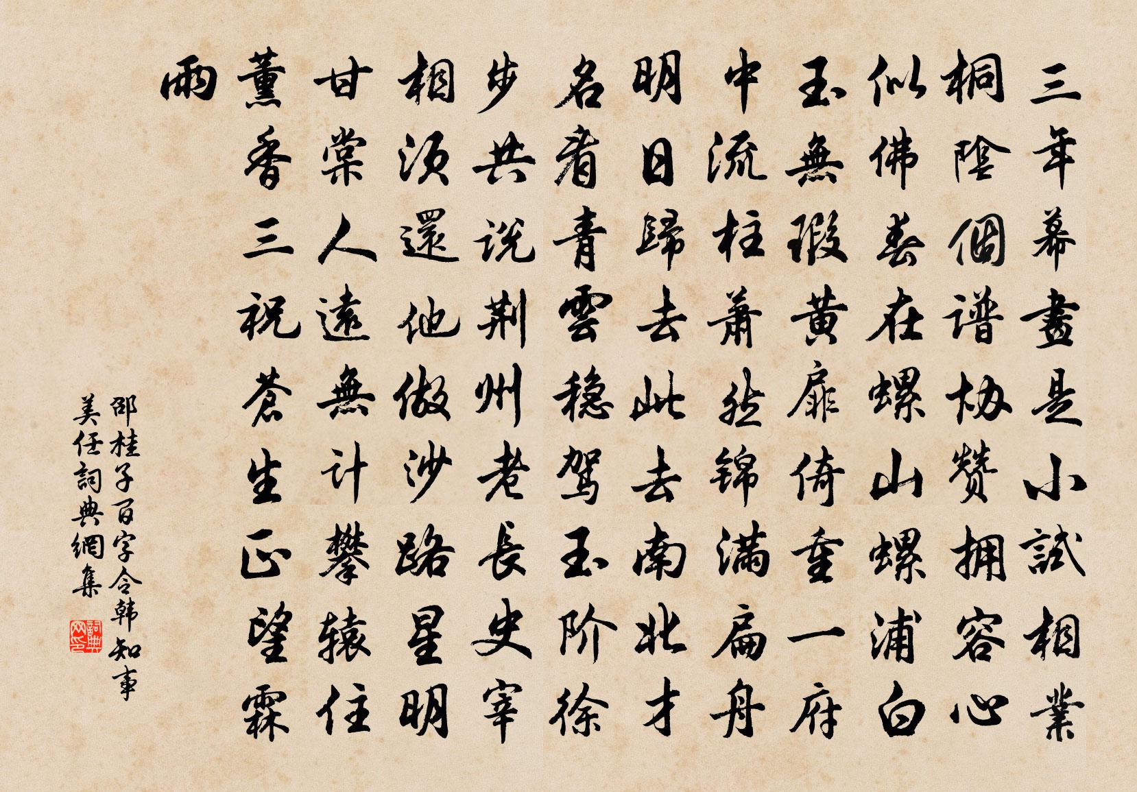 詩詞名句歷史字典書法欣賞書法字典國語詞典說文解字康熙字典古漢語字典標 題 作 者 詩 句 百字令(韓知事美任)作者:邵桂子 朝代:宋代百字令(韓知事美任)原文三年幕畫,是小試相業,桐陰個譜。協贊擁容心似佛,春在螺山螺浦。白玉無瑕,黃扉倚重,一府中流柱。蕭然錦滿,扁舟明日歸去。此去南北才名,看青雲穩駕,玉階徐步。共說荊州老長史,宰相須還他做。沙路星明,甘棠人遠,無計攀轅住。薰香三祝,蒼生正望霖雨。詩詞問答問:百字令(韓知事美任)的作者是誰?答:邵桂子問:百字令(韓知事美任)寫於哪個朝代?答:宋代邵桂子百字令(韓知事美任)書法欣賞百字令(韓知事美任)書法作品詩詞推薦水調歌頭辛棄疾〔宋代〕秋水之約。八月十四日,余臥病博山寺中,因用韻為謝,兼簡子似我志在寥闊,疇昔夢登天。摩挲素月,人世俯仰六嘆(集已載三首)李涉〔唐代〕蓬萊島邊採珠客,西望人寰星漢隔。千重疊浪聳雲高,萬里平沙連月白。海中洞穴尋難極,水底鮫人半相識。玄蚌和丁大詠史君禱雨之韻陳淳〔宋代〕史君持志一恭謙,何間幽明與巨纖。渴雨方將為旱閔,臥龍便不復泥潛。連宵頗作霶沱注,闔郡均蒙優渥沾。竊喜梁縣界虸蚄蟲生羅處約〔宋代〕方喜雲油布,俄聞葉螣生。田神何縱虐,稼政自非明。潁鳳那充食,吳牛已絕耕。送春白居易〔唐代〕銀花鑿落從君勸,金屑琵琶為我彈。不獨送春兼送老,更嘗一酌更聽看。次題曉上人閒靜軒韻樓鑰〔宋代〕我居城郭子居山,兩地相望數裡間。我已得閒猶未靜,子雖處靜少曾閒。莫將花與夢相似,之用心如石樣頑。要識宋玉楊億〔宋代〕蘭台清吹指冠緌,薙草新居對渺瀰。麗賦朝雲無處所,羈懷秋氣動齎咨。三年送目愁鄰媛,七澤 * 怨楚辭。獨有紙衾三首沈說〔宋代〕一幅新裁碧澗冰,野人留客宿雲層。山房恰好松醪熟,夜半無眠話葛藤。詩二首余翼〔宋代〕偶閒如到女媧天,深入何殊葛稚川。何必東山隨謝守,盡游終日恣陶然。如夢令許有壬〔元代〕昨夜庭梧隕翠。詩思尤便爽氣。無事要生悲,可笑宋家多事。衰矣。衰矣。但校鄰翁酒味。夜宴即席作陸游〔宋代〕宣華輦路牧牛羊,摩訶龍池草茫茫。宮殿犁盡余繚牆,南風遠吹禾黍香。草間白骨橫秋霜,何由喚起釂一觴?痴人畫魚歌(湖州道中作。)蘇軾〔宋代〕天寒水落魚在泥,短鉤畫水如耕犁。渚蒲拔折藻荇亂,此意豈復遺鰍鯢。偶然信手皆虛擊,本不辭勞幾萬一。一魚夏日游山家同夏少府駱賓王〔唐代〕返照下層岑,物外狎招尋。蘭徑薰幽珮,槐庭落暗金。谷靜風聲徹,山空月色深。一遣樊籠累,唯餘松桂心。懷素秋風帖贊岳珂〔宋代〕憭栗之秋,騷人所悲。彼僧何為,乃寫以辭。絕藝出塵,亦寄焉耳。雲煙蒼茫,在此幅紙。雜詩李復〔宋代〕善學必探本,知本貴善養。種木既得地,柯葉日滋長。紛紛綺語工,汩汩良心喪。多聞竟無益,不如雞犬放。陪中書李紓舍人夜泛東池盧綸〔唐代〕看月復聽琴,移舟出樹陰。夜村機杼急,秋水芰荷深。石靜龜潛上,萍開果暗沈。何言奉杯酒,得見五湖心。錢塘有作張繼先〔宋代〕紅霞映朱欄,白雲隱青山。塵中人不到,雙鶴舞柴關。瑤琴一曲詩數篇,山童煮茗爐無煙。為思塵世去遊樂,一別句沈端節〔宋代〕讀書渾不問家事,得酒但知看延友生。油溪嶺周惠〔宋代〕油溪何淼漫,油嶺復巑屼。白日蛇龍起,青林虎豹摶。乾坤誰設險,登陟壯遐觀。刀劍今牛犢,須知帝德寬。望曉詞施肩吾〔唐代〕攬衣起兮望秋河,濛濛遠霧飛輕羅。蟠桃樹上日欲出,白榆枝畔星無多。名句推薦斜陽照墟落,窮巷牛羊歸。王維《渭川田家》 扁舟去作江南客,旅雁孤雲。朱敦儒《採桑子·彭浪磯》 東風裊裊泛崇光,香霧空濛月轉廊。蘇軾《海棠·東風裊裊泛崇光》 斜日更穿簾幕,微涼漸入梧桐。晏殊《破陣子·燕子欲歸時節》 此曲有意無人傳,願隨春風寄燕然,憶君迢迢隔青天。李白《長相思三首·其二》 嵩雲秦樹久離居,雙鯉迢迢一紙書。李商隱《寄令狐郎中》 挫其銳,解其紛,和其光,同其塵。湛兮,似或存。老子《老子·道經·第四章》 昭君拂玉鞍,上馬啼紅頰。李白《王昭君二首》 人不閒,勿事攪。人不安,勿話擾。李毓秀《弟子規·泛愛眾》 老農家貧在山住,耕種山田三四畝。張籍《野老歌 / 山農詞》
