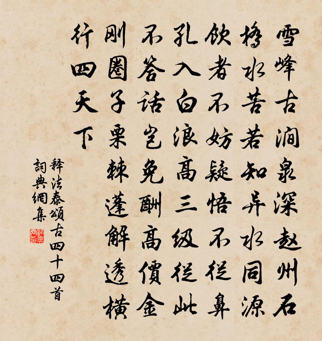 詩詞名句歷史字典書法欣賞書法字典國語詞典說文解字康熙字典古漢語字典標 題 作 者 詩 句 頌古四十四首作者:釋法泰 朝代:宋代頌古四十四首原文雪峰古澗泉深,趙州石橋水苦。若知異水同源,飲者不妨疑悟。不從鼻孔入,白浪高三1/1級。從此不答話,豈免酬高價。金剛圈子栗棘蓬,解透橫行四天下。詩詞問答問:頌古四十四首的作者是誰?答:釋法泰問:頌古四十四首寫於哪個朝代?答:宋代釋法泰頌古四十四首書法欣賞頌古四十四首書法作品詩詞推薦浣溪沙·山滴嵐光水拍堤姜彧〔元代〕山滴嵐光水拍堤,草香沙暖淨無泥。只疑誤入武林溪。兩岸桃花烘日出,四圍高柳到天垂。一尊心事百年期。和秉國芙蓉五章司馬光〔宋代〕但見涉江求水際,豈知緣木采霜中。微紅未肯全衰歇,正似酡顏鶴髮翁。和何長官六言次韻蘇軾〔宋代〕作邑君真伯厚,去官我豈曼容。一廛願托仁政,六字難賡變風。五噫已出東洛,三復願比南容。學道未從潘盎,(九日二首劉克莊〔宋代〕拒霜過了菊又慳,紈扇知收覺薄寒。鄰有新篘謀醉易,家無舊繡補衣難。今誰狂客同吹帽,老不中書合免冠。人到訓小童華岳〔宋代〕飯罷令人喚小童,敢煩捉耳為開蒙。芎茶不用焦湯點,紙被還將艷火烘。醉欲伴眠當倩月,熱求揮汗合邀風。它時秋至葉茵〔宋代〕節序暗推移,清商漸戒期。旅懷{上艹中大下蟲}早計,涼信柳先知。萬事到雙鬢,餘生消幾詩。最憐樑上燕,巢風流子(郭縣尹美任)佚名〔宋代〕西風吹錦水、朝天路、冉冉兩鳧飛。看父老裊花,苦遮去轍,兒童騎竹,爭問歸期。帳簇馬前紛蔽日,實績紀行碑如夢令許有壬〔元代〕牆角黃葵都謝。開到玉簪花也。老子恰知秋,風露一庭清夜。瀟灑。瀟灑。高臥碧窗下。暮春滻水送別 / 一作暮春送客韓琮〔唐代〕綠暗紅稀出鳳城,暮雲樓閣古今情。行人莫聽官前水,流盡年光是此聲。雜劇·沙門島張生煮海李好古〔元代〕第一折(外扮東華仙上,詩云)海東一片暈紅霞,三島齊開爛熳花。秀出紫芝延壽算,逍遙自在樂仙家。貧道乃東黃羅{左衤右羅}宋祁〔宋代〕袁褚聲華約略同,到頭忠佞兩成功。先皇謾賜黃羅{左衤右羅},不識明眸有貫虹。山居雜詩九十首曹勛〔宋代〕隨春動草木,微和入池閣。群芳爭妍媸,紅翠媚寥廓。一枝姑到眼,萬態便如昨。春深風雨來。固已任開落。跋虞丞相與趙撙節使帖還其猶子濟二首楊萬里〔宋代〕虞丞相與趙將軍,同策江淮第一勛。大羽進賢今寂寞,凌煙頌里感風雲。古傾杯(林鐘商)柳永〔宋代〕凍水消痕,曉風生暖,春滿東郊道。遲遲淑景,煙和露潤,偏繞長堤芳草。斷鴻隱隱歸飛,江天杳杳。遙山變色,海口皇甫明子〔宋代〕窮島迷孤青,颶風盪頑寒。不知是海口,萬里空波瀾。蛟龍恃幽沈,怒氣雄屈蟠。崢嶸抉秋陰,掛席潮如山。熒惑青樓曲鄒登龍〔宋代〕青樓女兒十五六,翠掠雲鬟妙裝束。千金學舞拜部頭,新來教得涼州曲。錦韉少年被花惱,醉把金釵換香草。西風予方臥病稅院劉君以畫梅堅索詩口占遣之牟巘五〔宋代〕今年四野赤如赭,安有吟情至此花。何況病夫空百妄,只於真實認根芽。懷寄周元翁十首賀鑄〔宋代〕周郎妙雅道,五字可人師。許與非不嚴,奈何取我詩。我詩如秋蟲,徒增長年悲。指疵固有望,逐臭得無嗤。詩鳴壽鐵石翁宋自遜〔宋代〕梅傳春信伴持觥,壽數新年滿六庚。長與白雲分屋住,閒騎黃犢趁山行。不因問藥深深隱,除卻能詩事事生。看到譚仁季以二詩見貽走筆次韻曹彥約〔宋代〕詩才清不羨滄浪,曾向歐曾接瓣香。萬里相逢書遜志,百年幾見易含章。君溫有腳開春盎,我暗無心得夜光。可奈名句推薦夢後樓台高鎖,酒醒簾幕低垂。晏幾道《臨江仙·夢後樓台高鎖》 臣強則死,念妄則亡。來俊臣《羅織經·事上卷第二》 幾硯昔年游,於今成十秋。司馬光《送龔章判官之衛州·新及第》 新園鎖卻愁陰,露黃漫委,寒香半畝。吳文英《瑞龍吟·送梅津》 客有哀時失職而聽者,淚淋浪以沾襟。李白《幽澗泉》 浩氣清英,仙材卓犖,下土難分別丘處機《無俗念·靈虛宮梨花詞》 先拂商弦后角羽,四郊秋葉驚摵摵。李頎《聽董大彈胡笳聲兼寄語弄房給事》 淒涼別後兩應同,最是不勝清怨月明中。納蘭性德《虞美人·曲闌深處重相見》 漠漠黃雲,濕透木棉裘。蔣捷《梅花引·荊溪阻雪》 綠竹半含籜,新梢才出牆。杜甫《嚴鄭公宅同詠竹》