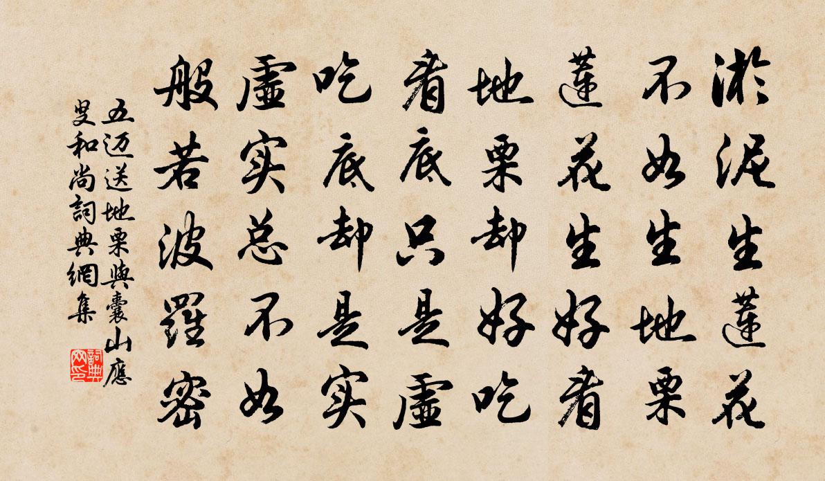 詩詞名句歷史字典書法欣賞書法字典國語詞典說文解字康熙字典古漢語字典標 題 作 者 詩 句 送地栗與囊山應叟和尚作者:五邁 朝代:宋代送地栗與囊山應叟和尚原文淤泥生蓮花,不如生地栗。蓮花生好看,地栗卻好吃。看底只是虛,吃底卻是實。虛實總不如,般若波羅密。詩詞問答問:送地栗與囊山應叟和尚的作者是誰?答:五邁問:送地栗與囊山應叟和尚寫於哪個朝代?答:宋代五邁送地栗與囊山應叟和尚書法欣賞送地栗與囊山應叟和尚書法作品詩詞推薦親耕籍田七首佚名〔宋代〕肇新帝藉,率我農人。三推終畝,祗事鹹均。陟降也時,粲然有文。受天之祐,多透如雲。雪後龜堂獨坐陸游〔宋代〕兩手龜坼愁出袖,閉戶垂帷坐清晝。朝陽破雲雪漸消,點滴無窮聽檐溜。士生百行雖相補,第一要能安飯糗。詩書題第五司戶侍御歐陽詹〔唐代〕曾稱野鶴比群公,忽作長松向府中。驄馬不騎人不識,泠然三尺別生風。憶江南白居易〔唐代〕江南憶,最憶是杭州:山寺月中尋桂子,郡亭枕上看潮頭,何日更重遊?藥軒司馬光〔宋代〕雨余倏甲繞介生,往往桐群昔未名。采貯不須勤暴熭,秋陽日日滿檐楹。滿庭芳(詠茶)陳師道〔宋代〕閩嶺先春,琅函聯璧,帝所分落人間。綺窗縴手,一縷破雙團。雲里游龍舞鳳,香霧起、飛月輪邊。華堂靜,松風蘇武慢 鳴鶴餘音全真馮尊師,本燕趙書生,虞集〔元代〕曲,高潔雄暢,最傳者蘇武慢二十篇。前十篇道遺世之樂,後十篇論修仙之事。曾稽費無隱獨善歌之,聞者有凌雲玉笈齋書事陸游〔宋代〕莫笑新霜點鬢須,老來卻得少工夫。晨占上古連山易,夜對西真五嶽圖。叔夜曾聞高士嘯,孔賓豈待異人呼。眉間贈張次律司理三首趙蕃〔宋代〕及是凡幾見,於今乃白頭。殷勤蒙飯設,緩急與醫謀。夫子自為德,畸人何足憂。諸家何所歷,更有若人不。聞應德茂先離棠溪唐彥謙〔唐代〕落日蘆花雨,行人谷樹村。青山時問路,紅葉自知門。苜蓿窮詩味,芭蕉醉墨痕。端知棄城市,經席許頻溫。鷓鴣天 詠紅梅壽守節婦沈禧〔元代〕萼綠仙姝慶誕辰。酡顏暈酒粲朱唇。霞綃翦袂雲裁佩,絳雪為肌玉作神。超俗態,斷凡塵。飄然風韻奪天真。能堅梔子花舒岳祥〔宋代〕六 * 成一寸心,銀盤裡許貯金簪。月中不著蠅點璧。春過翻疑蝶滿林。陸地水光山院靜,炎天冰片石壇深。楊州和陶郭主簿二首蘇軾〔宋代〕雀{彀弓換成鳥}含淳音,竹萌抱靜節。誦我先君詩,肝肺為澄澈。猶如鳴鶴和,未作獲麟絕。願因騎鯨李,追此寄芸居胡仲弓〔宋代〕京塵方袞袞,君獨此安居。竹簡編科斗,芸香辟蠹魚。眼空湖海士,兒讀聖賢書。一樣吟樽樂,公卿未必如。挽趙秋曉張登辰〔宋代〕羈貫分燈讀,論交若弟兄。羨君先得雋,嗟我老無成。幾載同憂患,終年隔死生。夢中猶歷歷,笑語若生平。和學士吳元昭釋彌光〔宋代〕通身一穿金鎖骨,正眼觀來猶剩物。縱使當機覿面提,敢保敢士猶未徹。送陳賢良忠正軍簽判梅堯臣〔宋代〕書對三千字,恩科第一人。鯤魚飛北海,龍劍躍平津。直悟聰文主,深論險克臣。已能明世弊,枉作幕中賓。偶作李洪〔宋代〕小雨纖纖未肯晴,歸程猶趁欲宵征。潮來江浦綠如染,雲抹山腰練許橫。九月初四日大風雨近重陽無酒夜成二首方回〔宋代〕怕見秋深秋又深,青燈白髮厭愁霖。百年剩幾重陽日,萬事都無一稱心。自揣老懷饒感慨,可須佳節強登臨。在陳愧謝詩河湄鬼〔唐代〕我本邯鄲士,祇役死河湄。不得家人哭,勞君行路悲。名句推薦山僧過嶺看茶老,村女當壚煮酒香。祝允明《首夏山中行吟》 愁與西風應有約,年年同赴清秋。史達祖《臨江仙·閨思》 刑天舞乾戚,猛志固常在。陶淵明《讀山海經·其十》 人情若比初相識,到底終無怨恨心。馮夢龍《醒世恆言·卷一》 風遞幽香出,禽窺素艷來。齊己《早梅》 不為燥濕輕重,不為窮達易節。范曄《後漢書·列傳·周黃徐姜申屠列傳》 所向泥活活,思君令人瘦。杜甫《九日寄岑參》 三千丈清愁鬢髮,五十年春夢繁華。喬吉《折桂令·客窗清明》 欲祭疑君在,天涯哭此時。張籍《沒蕃故人》 四海無閒田,農夫猶餓死。李紳《古風二首 / 憫農二首》