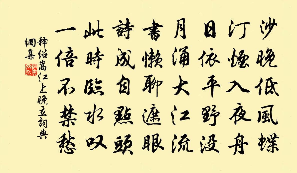 詩詞名句歷史字典書法欣賞書法字典國語詞典說文解字康熙字典古漢語字典標 題 作 者 詩 句 江上晚立作者:釋紹嵩 朝代:宋代江上晚立原文沙晚低風蝶,汀煙入夜舟。日依平野沒,月涌大江流。書懶聊遮眼,詩成自點頭。此時臨水嘆,一倍不禁愁。詩詞問答問:江上晚立的作者是誰?答:釋紹嵩問:江上晚立寫於哪個朝代?答:宋代釋紹嵩江上晚立書法欣賞江上晚立書法作品詩詞推薦寄題正倫侄舫齋詩二首陳瓘〔宋代〕此道若長川,行藏比泝沿。浪恬寧在我,維泛且隨緣。野色連幽岸,溪光接遠天。欲離平險地,常使意超然。鄰女劉駕〔唐代〕君嫌鄰女丑,取婦他鄉縣。料嫁與君人,亦為鄰所賤。菖蒲花可貴,只為人難見。謝御賜紫金魚袋烏紗象簡冷應澂〔宋代〕日映罦罳曉殿深,君恩稠疊駕親臨。褒衣紅濯天機錦,束帶黃分風帑金。何幸清班容宦轍,自慚白髮點朝簪。撥亂望蓬萊 贈小童王處一〔元代〕諸童稚,謹意學文章。萬事不令心散亂,忘情緘口養和光。開悟內丹方。添清爽,一性轉溫良。大抵儒風並道理,贈喬琳(一作劉昚虛詩)劉昚虛〔唐代〕去年上策不見收,今年寄食仍淹留。羨君有酒能共醉,羨君無錢能不憂。如今五侯不待客,羨君不問五侯宅。如今月上海棠(夾鍾商·賦題)姜夔〔宋代〕紅妝艷色,照浣花溪影,絕代姝麗。弄輕風、搖盪滿林羅綺。自然富貴天姿,都不比、等閒桃李。簾櫳靜悄,月上江南送左師杜牧〔唐代〕江南為客正悲秋,更送吾師古渡頭。惆悵不同塵土別,水雲蹤跡去悠悠。岩桂喻良能〔宋代〕枝頭金粟色偏勻,空里非煙氣自薰。莫把白旃檀漫比,香濃猶得逆風聞。送白酒白蓮與鍾統制錢廣文因成二絕吳芾〔宋代〕白酒方浮玉,白蓮仍可人。贈君飛大白,聊作冷官春。送劉克昌文顯二首趙蕃〔宋代〕驛使相看合寄梅,日邊訊息幾時回。平生所積故已厚,九萬不須風更培。句朱翌〔宋代〕時過湯餅客,共破侯琛。景靈宮聞子規楊萬里〔宋代〕今年未有子規聲,忽向宮中樹上鳴。告訴落花春不管,裴回曉月恨難平。斜風細雨又三月,柳絮浮雲空一生。豈不五祖將禪人求頌釋正覺〔宋代〕東風吹斷濡華雨,淮上秀峰青可數。束屨欲尋南北山,卷衣又別東西祖。淵魚蒲鳥鬧一家,汀筍溪蔬甘兩箸。處處寄李洞秀才齊己〔唐代〕到處聽時論,知君屈最深。秋風幾西笑,抱玉但傷心。野水翻紅藕,滄江老白禽。相思未相識,聞在蜀中吟。韓子師朝路為小人無禮去國再來婺女姜特立〔宋代〕推敲乍可恕詩客,攘臂豈容遭怒螗。三尺何時屍鼠輩,九霄一日失鵷行。君王擬聽尚書履,使者行催相園裝。共喜醉蓬萊趙長卿〔宋代〕正金風無露。玉宇生涼,楚郊無暑。催起行人,恰槐黃時序。萬里晴宵,幾人爭睹,快鵬摶一舉。明月圓時,素秋楚江有吊寇準〔宋代〕悲風颯颯起長洲,獨吊靈均恨莫收。深岸自隨浮世變,遺魂不逐大江流。霜淒極浦幽蘭暮,波動寒沙宿雁愁。月落游郭希呂石洞二十詠笙鶴劉過〔宋代〕木末俯清軒,獨立久延佇。何人騎鶴來,仿佛吹笙侶。朔風詩曹植〔魏晉〕仰彼朔風。用懷魏都。願騁代馬。倏忽北徂。凱風永至。思彼蠻方。願隨越鳥。翻飛南翔。鞏采若府推母錢夫人挽章二首呂祖謙〔宋代〕歷歷稱觴地,悲涼騎省園。風枝今日恨,露葉去年痕。鸞翥昏遺鏡,魚枯泣舊軒。曲湖春色滿,不到北堂萱。名句推薦舞殿冷袖,風雨淒淒。杜牧《阿房宮賦》 池上柳依依,柳邊人掩扉。左緯《春晚》 垂釣板橋東,雪壓蓑衣冷。釋敬安《題寒江釣雪圖》 但去莫復問,白雲無盡時。王維《送別》 濃霧知秋晨氣潤,薄雲遮日午陰涼,不須飛蓋護戎裝。范成大《浣溪沙·江村道中》 難相見,易相別,又是玉樓花似雪。韋莊《應天長·別來半歲音書絕》 高山安可仰,徒此揖清芬李白《贈孟浩然》 嗚呼!楚雖三戶能亡秦,豈有堂堂中國空無人陸游《金錯刀行》 反者道之動;弱者道之用。天下萬物生於有,有生於無。老子《老子·德經·第四十章》 和氏之璧乎?價重千金,然以之間紡,曾不如瓦磚。劉向《說苑·雜言》