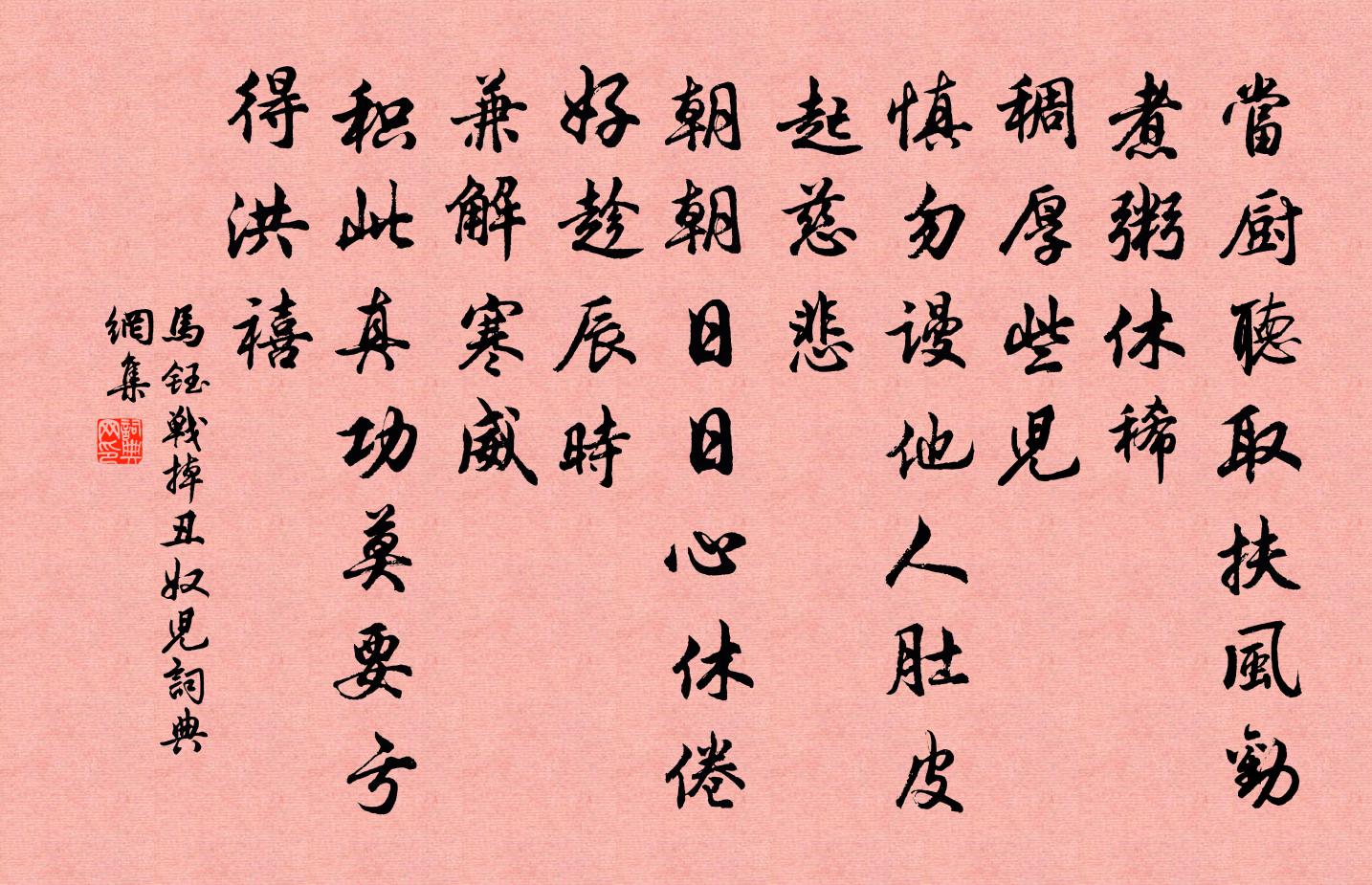 詩詞名句歷史字典書法欣賞書法字典國語詞典說文解字康熙字典古漢語字典標 題 作 者 詩 句 戰掉醜奴兒作者:馬鈺 朝代:元代戰掉醜奴兒原文當廚聽取扶風勸,煮粥休稀。稠厚些兒。慎勿謾他人肚皮。起慈悲。朝朝日日心休倦,好趁辰時。兼解寒威。積此真功莫要虧。得洪禧。詩詞問答問:戰掉醜奴兒的作者是誰?答:馬鈺問:戰掉醜奴兒寫於哪個朝代?答:元代問:戰掉醜奴兒是什麼體裁?答:詞馬鈺戰掉醜奴兒書法欣賞戰掉醜奴兒書法作品詩詞推薦絕句一首蘇籀〔宋代〕雙紋八尺展雕床,蓮艷方空夜玉香。雅秀冰姿延閣彥,豈應簪斷作淒涼。故樞密簽書贈正議大夫王彥霖輓詞二首蘇轍〔宋代〕傾蓋晚相親,東西省戶鄰。聽君占諫草,繼我出詞綸。京尹聲初浹,樞廷跡尚新。鄞鄲炊未熟,榮謝隔逡巡。登飛來峰鄭清之〔宋代〕懸崖石路擘蒼苔,川竇岩扉處處開。信是拔山人有力,一峰搦碎總飛來。西湖晚泛釋紹嵩〔宋代〕蘇堤一帶柳陰長,柳長西風特地狂。晚泊孤舟古祠下,自彈別鶴送斜陽。題和靖祠陳杰〔宋代〕欲將心事梅邊說,放鶴經年去不還。寒日碧雲無限意,卻成喑啞對湖山。對月贈答二首趙蕃〔宋代〕閨中月是天涯月,照妾遙知亦照君。月解令人千里共,人能似月兩頭分。天安殿致齋寇準〔宋代〕國陽崇大報,王宇藻多儀。散致尊王度,懷柔祝帝禧。儲精通合漠,玩志協徵夷。律正風來迥,宵長月上遲。漏筒刮鼓社王哲〔元代〕刮鼓社,這刮鼓食中飽。我看豌豆將來後,且*起須入窖。莫收多、不須收少。上頭自有三光照。似象棋何勞 * 相和歌辭。短歌行二首白居易〔唐代〕曈曈太陽如火色,上行千里下一刻。出為白晝入為夜,圜轉如珠住不得。住不得,可奈何,為君舉酒歌短歌。歌聲長壽樂(般涉調)柳永〔宋代〕繁紅嫩翠。艷陽景,妝點神州明媚。是處樓台,朱門院落,弦管新聲騰沸。恣遊人、無限馳驟,嬌馬車如水。竟尋高太傅輓詞林季仲〔宋代〕聲利場中意獨消,端如處士翳蓬蒿。渡江一馬神先助,夾日五龍功更高。不願本朝私戚里,長稱文母訓兒曹。十年毛公壇陳舜俞〔宋代〕古壇疊亂石,草木何參差。黃衣宇其傍,陳跡刊豐碑。曰初劉真人,齒髮不可訾。但見紺綠毛,被體鬖鬖垂。雲軿永嘉端午行葉適〔宋代〕行春瓶橋東峙岩瓶北,大舫瓶移家住無瓶隙。立瓶若羅銀價踴,冰衫雪袴胭脂勒。使君勸客親付標,兩朋予奪懸分三月十五日華容湖尾看月出范成大〔宋代〕雲銷灃陽風,月生岳陽水。誰推赤金盤,湧出白銀地?徘徊忽騰上,蹀蹀恐顛墜。稍高輪漸安,飛彩到篷背。晶晶予與故刑部李侍郎早結道友,以藥術為事,與白居易〔唐代〕從哭李來傷道氣,自亡元後減詩情。金丹同學都無益,水竹鄰居竟不成。月夜若為游曲水,花時那忍到昇平。如年摸魚子馬熙〔元代〕買陂塘旋栽楊柳,參知老圃機務。宰相得請歸田裡,久旱忽逢甘雨。懷鄂渚。悵黃鶴樓前,鸚鵡翔煙嶼。清魂可語喜晴陸游〔宋代〕久雨群蛙日夜號,樂哉霽色滿江郊。草書已悟屋漏壁,詩句免悲風卷茆。喚婦晴鳩鳴廢圃,歸林棲鶻補危巢。泥乾謝龍圖李待制見寄魏野〔宋代〕煙霄閒似在煙霞,唯有龍圖學士家。和了御詩垂錦帳,臥聽仙樂出宮花。山房二首毛維瞻〔宋代〕東晉仙人借舊山,定應天意許公閒。郡人慾問使君處,笑指峰巒紫翠間。自題詩集釋宗美〔宋代〕新集區堯六百篇,冥搜疑到不還天。多慚未得騷人旨,虛役身心五十年。名句推薦梅落繁枝千萬片,猶自多情,學雪隨風轉。馮延巳《鵲踏枝·梅落繁枝千萬片》 獨睡起來情悄悄,寄愁何處好。納蘭性德《謁金門·風絲裊》 家必自毀,而後人毀之。孟子《孟子·離婁章句上·第八節》 想邊鴻孤唳,砌蛩私語。王沂孫《掃花游·秋聲》 楓樹夜猿愁自斷,女蘿山鬼語相邀李商隱《楚宮》 水際輕煙,沙邊微雨。荷花芳草垂楊渡。劉將孫《踏莎行·閒遊》 從極迷處識迷,則到處醒;將難放懷一放,則萬境寬。陳繼儒《小窗幽記·集醒篇》 易醉扶頭酒,難逢敵手棋。賀鑄《南歌子·疏雨池塘見》 秋在水清山暮蟬,洛陽樹色鳴皋煙。王昌齡《送狄宗亨》 疏籬下、試覓重陽,醉擘青露菊。吳文英《一寸金·秋感》