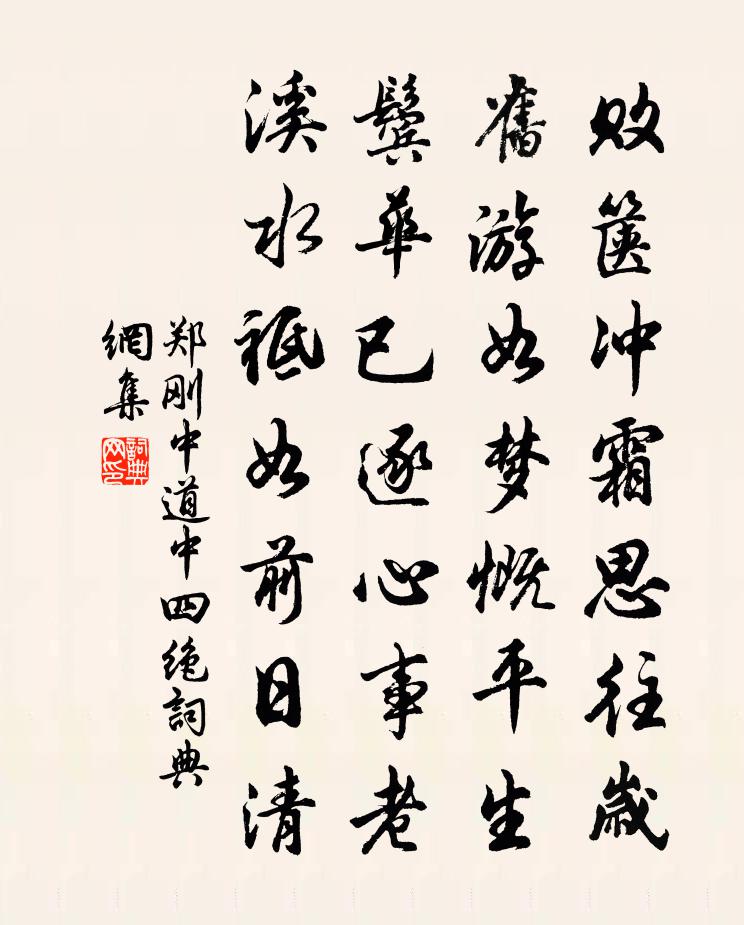 詩詞名句歷史字典書法欣賞書法字典國語詞典說文解字康熙字典古漢語字典標 題 作 者 詩 句 道中四絕作者:鄭剛中 朝代:宋代道中四絕原文敗篋沖霜思往歲,舊遊如夢慨平生。鬢華已逐心事老,溪水祗如前日清。詩詞問答問:道中四絕的作者是誰?答:鄭剛中問:道中四絕寫於哪個朝代?答:宋代鄭剛中道中四絕書法欣賞道中四絕書法作品詩詞推薦蚊二首劉克莊〔宋代〕昔曾蹴龍象,而況爾區區。敢以一隻口,當吾七尺軀。□生形猥瑣,撲殺血模糊。欲換秋衣著,渠猶戀布襦。山居雜詩九十首曹勛〔宋代〕晨粥山中行,落葉響步武。委曲訪隱逸,清談銷百慮。老湯瀹苦茗,宿火煨山芋。卻照夕陽歸,家人不知處。追和尤延之檢詳紫辰殿賀雪楊萬里〔宋代〕鍚山詩老立層霄,黃竹賡歌宴在瑤。有客夢中聞雪作,曲肱篷底信船搖。遙知端葉飄香袖,笑向梅花趁早朝。未嘆雜感十首以野曠沙岸淨天高秋月明為韻陸游〔宋代〕呂釣渭水濱,說築傅岩野。雖曰古盛時,得士蓋亦寡。天將啟治亂,人才有用舍。向非萬牛力,孰與成大廈?雜詠五言五首劉克莊〔宋代〕傳呼尤赫赫,變滅忽休休。鴻筆銘勳績,蟬冠斂髑髏。嘲無咎夜起燈聽慎思誦詩張耒〔宋代〕翠屏香暖秋眠穩,霜冷寶奩金錯刀。誰信苦吟無睡客,挑燈起聽楚人騷。次韻吳僧魁一山十絕方回〔宋代〕長安應制住紅樓,浪惹玄都紫陌愁。天目有山無捷徑,落花莫放出溪流。郊廟歌辭。五郊樂章。白郊迎神佚名〔唐代〕序移玉律,節應金商。天嚴殺氣,吹警秋方。槱燎既積,稷奠並芳。樂以迎奏,庶降神光。鷓鴣天徐叔至〔宋代〕兩兩台符映昴躔,南熏披拂壽爐煙。寶圖繼統千齡會,金鉉調元一相賢。蘭玉滿,慶蟬聯。天教世有魯山川。霞觴賦羅漢果林用中〔宋代〕團團碩果自流黃,羅漢芳名托上方。寄語山僧留待客,多些滋味煮成湯。燈夕劉克莊〔宋代〕千炬金梔映玉蕖,台城昨夢又年餘。斷無弦索鳴華屋,惟見炊煙起草廬。兒報瓶空因止酒,婢言油盡暫停書。蓬窗金陵雜興二百首蘇泂〔宋代〕南軒門第老袁三,將業江湖久遍參。聞說中原太平事,數行清淚濕征衫。瑞鶴仙(南劍雙溪樓)辛棄疾〔宋代〕片帆何太急。望一點須臾,去天咫尺。舟人好看客。似三峽風濤,嵯峨劍戟。溪南溪北。正遐想、幽人泉石。看漁九日登長城關樓王瓊〔明代〕危樓百尺跨長城,雉堞秋高氣肅清。絕塞平川開塹壘,排空斥堠揚旗旌。已聞胡出河南境,不用兵屯細柳營。極喜阮郎歸(月下感事)史達祖〔宋代〕舊時明月舊時身。舊時梅萼新。舊時月底似梅人。梅春人不春。香入夢,粉成塵。情多多斷魂。芙蓉孔雀夜溫溫。三月三日西湖第三橋四首方回〔宋代〕正月橋西賣酒家,柳初青眼草初芽。重來紅紫隨風雨,猶有野田黃茶花。偈二十二首釋子淳〔宋代〕三月安居已半過,虛明心地又如何。有求宛然成機巧,無作方能不較多。爐里寒灰香旖旎,岩前枯木葉婆娑。白頭四十五白居易〔唐代〕行年四十五,雨鬢半蒼蒼。清瘦詩成癖,粗豪酒放狂。老來尤委命,安處即為鄉。或擬廬山下,來春結草堂。至開化里壽春公故宅韋應物〔唐代〕寧知府中吏,故宅一徘徊。歷階存往敬,瞻位泣餘哀。廢井沒荒草,陰牖生綠苔。門前車馬散,非復昔時來。臨清大雪吳偉業〔清代〕白頭風雪上長安,短褐疲驢帽頻寬。辜負故園梅樹好,南枝開放北枝寒。名句推薦他年我若為青帝,報與桃花一處開。黃巢《題菊花》 牆倒眾人推。曹雪芹《紅樓夢·第五十五回》 不痴不聾,不作家翁。司馬光《資治通鑑·唐紀四十》 心體光明,暗室中有青天;念頭暗昧,白日下有厲鬼。洪應明《菜根譚·概論》 勝法之務莫急於去奸,去奸之本莫深於嚴刑。商鞅《商君書·開塞》 嶺樹重遮千里目,江流曲似九迴腸。柳宗元《登柳州城樓寄漳汀封連四州》 一枝紅艷露凝香,雲雨巫山枉斷腸。李白《清平調·其二》 東園載酒西園醉,摘盡枇杷一樹金。戴復古《初夏遊張園》 笑殺陶淵明,不飲杯中酒。李白《嘲王歷陽不肯飲酒》 常將有日思無日,莫把無時當有時。佚名《增廣賢文·上集》