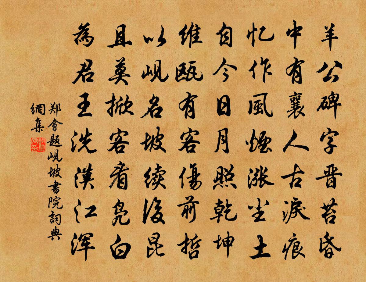 詩詞名句歷史字典書法欣賞書法字典國語詞典說文解字康熙字典古漢語字典標 題 作 者 詩 句 題峴坡書院作者:鄭會 朝代:宋代題峴坡書院原文羊公碑字晉苔昏,中有襄人古淚痕。憶作風煙漲塵土,自今日月照乾坤。維甌有客傷前哲,以峴名坡續後昆。且莫掀客看鳧白,為君王洗漢江渾。詩詞問答問:題峴坡書院的作者是誰?答:鄭會問:題峴坡書院寫於哪個朝代?答:宋代鄭會題峴坡書院書法欣賞題峴坡書院書法作品詩詞推薦偈頌十五首釋寶印〔宋代〕遍地殘紅春去也,拍天漲綠興悠哉。道人覓甚安心法。達磨當時帶不來。待潮顧浦宿耕者張欽舍顏發〔宋代〕海近雲氣昏,禹跡開茫茫。晴要列障邏,什伍屯平岡。頃遭七年旱,驟見九秋黃。腰鐮喜復悲,泥水新圃場。縣侯玉京秋賀鑄〔宋代〕隴首霜晴,泗濱雲晚,乍搖落。廢榭蒼苔,破台荒草,西楚霸圖冥漠。記登臨事,九日勝游,千載如昨。更想像,贊洞賓像葉紹翁〔宋代〕捻吟髭,劍在前。心中月,天上圓。四月二十九日坐直廬讀山谷效東坡作薄薄酒二喻良能〔宋代〕薄薄酒,勝獨醒。醜醜婦,勝鰥煢。笙歌鼎沸不須羨,松風滿耳自足聽。前遮後擁未必樂,邀月對影堪娛情。晚食新塘觀月陸游〔宋代〕攜酒新塘南,中夜欲忘歸。貪看月滿湖,不覺露濕衣。天高鶴聲厲,風急螢火稀。此夕不一醉,行嘆破鏡飛。漁家次韻八侄三首陳著〔宋代〕春色三分一未歸,雪肌風態露春微。東風且作枝頭主,莫把工夫繡地衣。寄題武陵柳氏所居二首其一天真堂蘇轍〔宋代〕宦遊閱盡山川勝,歸老方知氣味真。歌哭不移身自穩,往還無間語尤親。永懷前輩無因見,猶喜諸郎有此人。千歲緣識宋太宗〔宋代〕行幸一何得,民安君子樂。求官利益人,勸善懲諸惡。廣州蕭都督入朝過岳州宴餞得冬字張說〔唐代〕孤城抱大江,節使往朝宗。果是台中舊,依然水上逢。京華遙比日,疲老颯如冬。竊羨能言鳥,銜恩向九重。雨後到芙蓉村葛紹體〔宋代〕又上籃輿去,西風暫放晴。霧深孤嶼沒,日薄片雲明。詩思通山色,琴懷澹客情。懸知百里路,分作兩三程。謝諸友移且游德及亭劉宰〔宋代〕老去疏文會,朋來愜素公。結廬慚遠引,挈榼荷親臨。反旆孤成約,臨池得勝尋。鳥飛青嶂遠,魚戲碧波深。揮塵風詠呂溫〔唐代〕微風生青蘋,習習出金塘。輕搖深林翠,靜獵幽徑芳。掩抑時未來,鴻毛亦無傷。一朝乘嚴氣,萬里號清霜。北走解嘲十絕呈浩西堂釋紹嵩〔宋代〕崎巇世路九迴腸,兩鬢年深一鏡霜。身事龍鍾應是分,誰知貧樂異尋常。又送出閩釋慧空〔宋代〕老人入我閩中居,如山有玉淵有珠。老人一日出山去,崖不自靈淵亦枯。我問天冠千眷屬,如何不留老尊宿。飛鸞江漢答孟郊韓愈〔唐代〕江漢雖雲廣,乘舟渡無艱。流沙信難行,馬足常往還。淒風結衝波,狐裘能禦寒。終宵處幽室,華燭光爛爛。苟能挽樊君修陳著〔宋代〕憶昨會山中,危時苦話同。老枝期共雪,喬木慮摧風。弟有文銘竁,兒能禮送終。九京無可憾,後死愧衰翁。矮齋雜詠二十首江濤華岳〔宋代〕曉鍾捶動巨鰲{黨兄換足},枕上春雷上夜轟。應是金鱗三十六,化龍頭角逞崢嶸。送湯子才晁公溯〔宋代〕江湖此去水連空,萬賈連檣浩渺中。帆影浸斜青草月,笛聲吹盡碧蘆風。未論魏闕功名錠,不與巴山氣象同。更到秋夜北山精舍觀體如師梵劉長卿〔唐代〕焚香奏仙唄,向夕遍空山。清切兼秋遠,威儀對月閒。靜分岩響答,散逐海潮還。幸得風吹去,隨人到世間。名句推薦冰肌玉骨,自清涼無汗。蘇軾《洞仙歌·冰肌玉骨》 牛刀可以割雞,雞刀難以屠牛。王充《論衡·卷十二·程材篇》 想子胥今夜見嫦娥,沉冤雪。史達祖《滿江紅·中秋夜潮》 愁看飛雪聞雞唱,獨向長空背雁行。羅鄴《早發》 素臣稱有道,守在於四夷。田錫《塞上曲》 雁過也,正傷心,卻是舊時相識。李清照《聲聲慢·尋尋覓覓》 年華共,混同江水,流去幾時回納蘭性德《滿庭芳·堠雪翻鴉》 若非群玉山頭見,會向瑤台月下逢李白《清平調·其一》 儒者在本朝則美政,在下位則美俗。荀子《荀子·儒效》 花時同醉破春愁,醉折花枝作酒籌。白居易《同李十一醉憶元九》