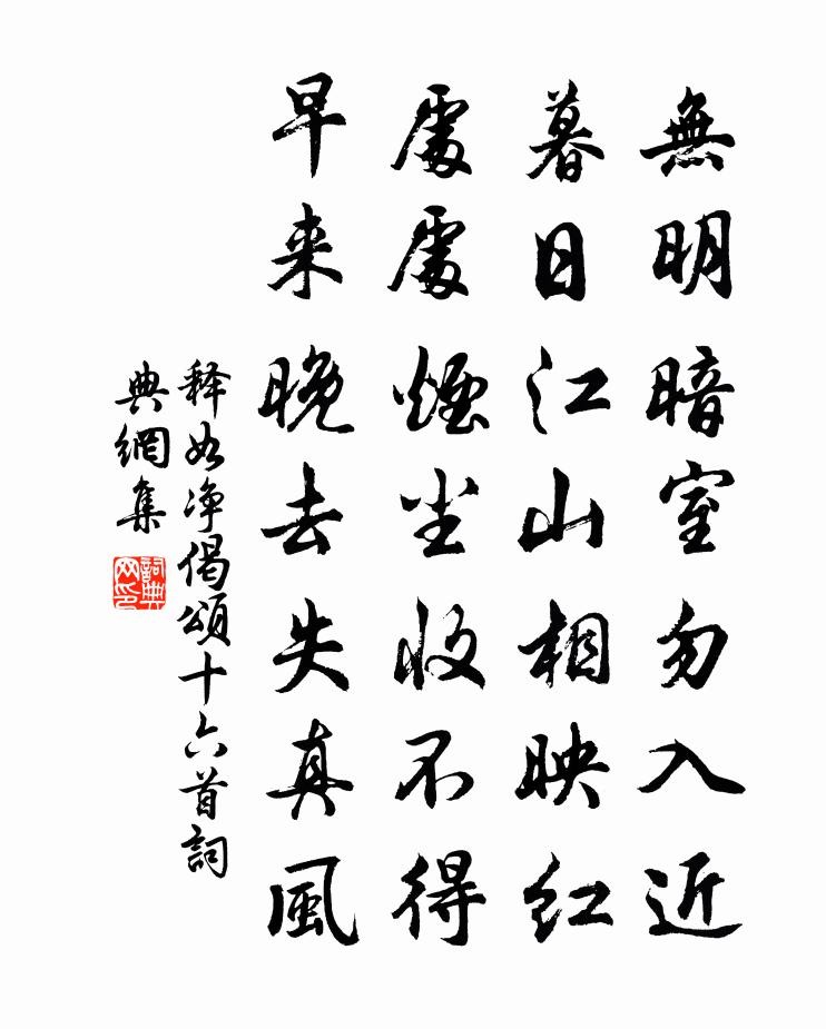 詩詞名句歷史字典書法欣賞書法字典國語詞典說文解字康熙字典古漢語字典標 題 作 者 詩 句 偈頌十六首作者:釋如淨 朝代:宋代偈頌十六首原文無明暗室勿入近,暮日江山相映紅。處處煙塵收不得,早來晚去失真風。詩詞問答問:偈頌十六首的作者是誰?答:釋如淨問:偈頌十六首寫於哪個朝代?答:宋代釋如淨偈頌十六首書法欣賞偈頌十六首書法作品詩詞推薦水調歌頭(鄂渚憶浮遠)丘崈〔宋代〕彩艦駕飛鷁,帆影漾江鄉。肥梅天氣,一聲橫玉換新陽。驚起沙汀鷗鷺,點破暮天寒碧。極目楚天長。一抹殘霞外與僧道升二首王安石〔宋代〕升也初見我,膚腴仍潔白。今何苦而老,手腳皴以黑。聞有道人者,於今號禪伯。嬲汝以一句,西歸瘦如臘。汝觀寄寶藏主釋如珙〔宋代〕識塵消落盡,本性自圓明。動靜無差異,語言只似常。後到不過此,先來亦只寧。坐禪一片石,松樹長青青。贈寫真李道士蘇轍〔宋代〕君不見景靈六殿圖功臣,進賢大羽東西陳。能令將相長在世,自古獨有曹將軍。嵩高李師掉頭笑,自言弄筆通前身宿牧牛亭秦太師墳庵楊萬里〔宋代〕兩關只有一樓侯,瀛館寧無再帝丘。天極八重心未死,台星三點坼方休。只看壁後新亭策,恐作栘中屬國羞。今日次韻再答少蘊知府甥和四兄長句並見寄二首晃沖之〔宋代〕錦袍昔是詩成得,別墅今非棋賭來。山蔚藍光交抱舍,水桃花色合圍台。通人竹塢深深入,謝客松扉遠遠開。定與蟠龍瀑布陸游〔宋代〕遠望紛珠纓,近觀轉雷霆。人言水出奇,意使行人驚。人驚我何得,定非水之情。水亦有何情,因物以賦形;處高春望詞四首·其二薛濤〔唐代〕攬草結同心,將以遺知音。春愁正斷絕,春鳥復哀吟。桐柏觀任翻〔唐代〕飄飄雲外者,暫宿聚仙堂。半夜人無語,中宵月送涼。鶴歸高樹靜,螢過小池光。不得多時住,門開是事忙。偈頌一百四十一首釋師範〔宋代〕今朝正月一,只是尋常日。就中殊異處,遍界鋪銀色。山居雜詩九十首曹勛〔宋代〕卜居得幽勝,景物無升沉。峰巒環郛郭,松竹排園林。時時破寂寥,悠悠賴鳴禽。於焉自有得,天籟皆餘音。三日侍華光殿曲水宴代人應詔詩 九謝朓〔南北朝〕羽腕纖腰。遷延妙舞。秦箏趙瑟。殷勤促柱。降席連緌。稱觴接武。稽首萬年。獻茲多祜。偈頌一百五十首釋心月〔宋代〕空手把鋤頭,步行騎水牛。人從橋上過,橋流水不流,動地清風來未休。咄,下座佛殿,別聽因由。月五日亦初五偶成宋祁〔宋代〕不用真如鼠,胡瞻亦有鶉。田園未歸客,天地一畸人。京邑風霜苦,江鄉薇蕨春。可能迷鬼笑,長送左朱輪。陪幸韋嗣立山莊應制(一作宋之問詩)李乂〔唐代〕樞掖調梅暇,林園種槿初。入朝榮劍履,退食偶琴書。地隱東岩室,天回北斗車。旌門臨窈窕,輦道屬扶疏。雲罕戲作宋伯仁〔宋代〕青梅黃盡雨無多,柳影重重午日過。忽聽隔籬人語笑,採蓮艇子上新河。丙戌五月朔閒坐偶成陳著〔宋代〕石火光中見歲華,溪雲深處寄生涯。詩書屋下無嬉具,桑竹窗前有美花。拗境日增多活愧,囂塵天與一貧遮。乾坤建康回使寄范帥從求詩帖許而未至趙蕃〔宋代〕作意 * 好賦詩,無鹽竟自突西施。生憎逼仄饑寒態,不盡從容質問時。已辦過江還敗興,要期重謁愧無辭。夜光回黃通詩篇李覯〔宋代〕老杜沒已久,嗟哉吾子心。時人任詬病,獨自革浮淫。美玉寧須琢,朱絃豈在音。鍾期如未見,慎勿待閒吟。次韻宋永兄感舊五首黃公度〔宋代〕齠齓談經動聖聰,山川英氣向來鍾。中書落筆萬人繞,天陛賜袍千載逢。利鎖名韁身半老,酒徒詩社意偏濃。莫欺名句推薦一語不入意,從君萬曲梁塵飛。李白《夜坐吟》 英雄一去豪華盡,惟有青山似洛中。許渾《金陵懷古》 當時輕別意中人,山長水遠知何處。晏殊《踏莎行·碧海無波》 泥融飛燕子,沙暖睡鴛鴦。杜甫《絕句二首》 芳樹無人花自落,春山一路鳥空啼。李華《春行即興》 香非在蕊,香非在萼,骨中香徹。晁補之《鹽角兒·亳社觀梅》 下馬登鄴城,城空復何見。岑參《登古鄴城》 洛陽城裡見秋風,欲作家書意萬重。張籍《秋思》 器具質而潔,瓦缶勝金玉;飲食約而精,園蔬愈珍饈。朱柏廬《朱子家訓·全文》 灼灼野花香,依依金柳黃。佚名《菩薩蠻·霏霏點點回塘雨》