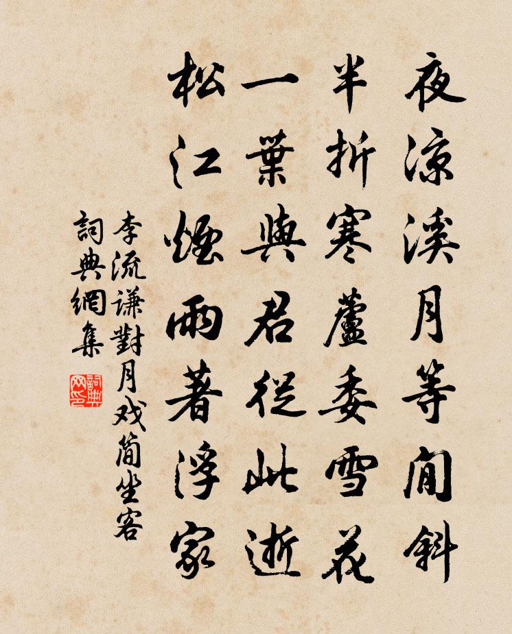 詩詞名句歷史字典書法欣賞書法字典國語詞典說文解字康熙字典古漢語字典標 題 作 者 詩 句 對月戲簡坐客作者:李流謙 朝代:宋代對月戲簡坐客原文夜涼溪月等閒斜,半折寒蘆委雪花。一葉與君從此逝,松江煙雨著浮家。詩詞問答問:對月戲簡坐客的作者是誰?答:李流謙問:對月戲簡坐客寫於哪個朝代?答:宋代李流謙對月戲簡坐客書法欣賞對月戲簡坐客書法作品詩詞推薦灑泉子潘閬〔宋代〕長憶孤山。山在湖心如黛簇。僧房四面向湖開。輕棹去還來。芰荷香噴連雲閣。閣上清聲檐上鐸。別來塵土污人衣虞美人(懷金華九日寄葉丞相)韓元吉〔宋代〕登臨自古騷人事。慘忄栗天涯意。金華峰頂做重陽。月地千尋風裡、萬枝香。相君攜客相應記。幾處容狂醉。雙溪江月亭馮時行〔宋代〕張家作亭跨江月,久欲題詩詩思竭。今朝龍泉寶函來,豈亦索詩光貝闕。忽憶曩時醉亭上,笑倚長松清興發。波光和憂陸二祠書仲並〔宋代〕年來疏見驚人句,入手遽回如許春。幾日異科收異士,百年吾道付吾人。執鞭少也嘗求富,擊柝老來非為貧。寄語松花舒岳祥〔宋代〕偃蹇不入俗,隨春也作花。高攀許樵子,輕掃落僧家。功用雖非藥,風標正似茶。秋風收子食,辟穀勝胡麻。送李大都護常建〔唐代〕單于雖不戰,都護事邊深。君執幕中秘,能為高士心。海頭近初月,磧里多愁陰。西望郭猶子,將分淚滿襟。荔枝詩薛能〔唐代〕顆如松子色如櫻,未識蹉跎欲半生。歲杪監州曾見樹,時新入座久聞名。紹興祀岳鎮海瀆四十三首佚名〔宋代〕維水善下,利物日功。逶迤百川,誰歟朝宗。蕩蕩大受,於焉會同。芝蕭然陳,以答鴻濛。出塞曲王炎〔宋代〕羽檄走邊遽,虎符出精兵。壯士卷甲起,骨肉送之行。擊築歌易悲,挈榼酒更傾。關山殺氣纏,寒日無昌明。箭落嘉禾百詠白龍潭張堯同〔宋代〕呼吸風雲合,飛潛自有時。只愁潭底淺,頭角被人窺。舟中晚望桃源山張詠〔宋代〕仙山初指明初明,倚棹因妨半日程。雲里未忘尋去路,世間爭合有浮名。岩空闇老松千尺,天靜時聞鶴一聲。更謝偈頌三十六首釋如珙〔宋代〕一毛吞海,海性無虧。纖芥投鋒,鋒利不動。龍潭吹滅紙燈,德山倒地禮拜。今年桃李貴,一顆直千金。病來十日不舉酒二首黃庭堅〔宋代〕病來十日不舉酒,獨臥南床春草生。承君折送袁家紫,令我興發郎官清。偈頌一百零二首釋紹曇〔宋代〕平如鏡面,險似懸崖。不容擬議,豈屬安排。閃電光中行活路,大悲院裡赴村齋。九月末大風一夕遂安置火爐有感二首張耒〔宋代〕謫官兩向黃州火,知是明年何處冬。須信炎涼相代至,亦知榮辱到頭空。怨咨莫起天公念,燕坐何妨佛理通。更有泛溪夜回寄道玄上人許渾〔唐代〕南郭煙光異世間,碧桃紅杏水潺潺。猿來近嶺獼猴散,魚下深潭翡翠閒。猶阻晚風停桂楫,欲乘春月訪松關。幾回有懷新筠州揚秘監寄贈八絕兼桂隱茶張鎡〔宋代〕老子生來鐵麵皮,要渠嬉笑莫過詩。可憐百巧卿雲手,拙直今年一奏詞。減字木蘭花陳瓘〔宋代〕華胥月色。萬水千山同一白。南北相望。獨醉香山舊草堂。淮岑妙境。十載醺酣猶未醒。一腹便便。也讀春秋也愛春遊楊萬里〔宋代〕不知春向雨中回,只到春光未苦來。老子今晨偶然出,李花全落杏花開。登城春望王勃〔唐代〕物外山川近,晴初景靄新。芳郊花柳遍,何處不宜春。名句推薦澗影見松竹,潭香聞芰荷。孟浩然《夏日浮舟過陳大水亭 / 浮舟過滕逸人別業》 柳庭風靜人眠晝,晝眠人靜風庭柳。蘇軾《菩薩蠻·回文夏閨怨》 卻憶安石風流,東山歲晚,淚落哀箏曲辛棄疾《念奴嬌·登建康賞心亭呈史致道留守》 俯皇都之宏麗兮,瞰雲霞之浮動。曹植《銅雀台賦》 私視使目盲,私聽使耳聾,私慮使心狂。呂不韋《呂氏春秋·紀·季冬紀》 月明船笛參差起,風定池蓮自在香。秦觀《納涼》 洞庭一夜無窮雁,不待天明盡北飛。李益《春夜聞笛》 楚水辭魚窟,燕山到雁家裴說《塞上曲》 孩兒立志出鄉關,學不成名誓不還。 * 《七絕·改西鄉隆盛詩贈父親》 夜雨滴空階,孤館夢回,情緒蕭索。柳永《尾犯·夜雨滴空階》